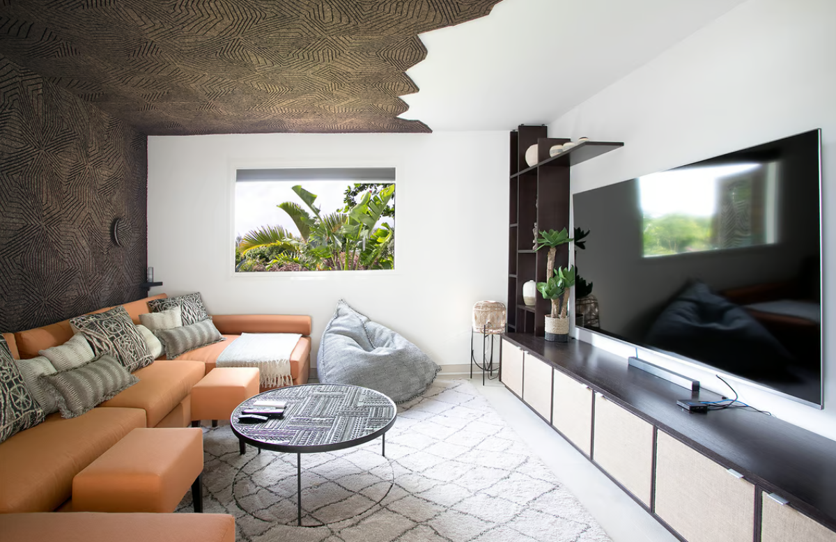 Relaxation is key at Avanti, with plush loungers, daybeds, and a gazebo featuring ambient lighting, a wet bar, and comfortable seating. Inside, the stylish African-inspired decor includes designer furnishings, natural wood accents, and vibrant burnt orange tones. The living and dining areas are complemented by an 82-inch Smart TV, while the kitchen is fitted with high-end Wolf and Sub Zero appliances and opens to an outdoor dining terrace.
