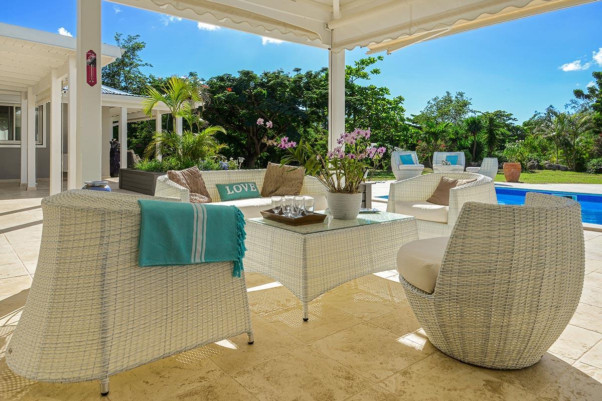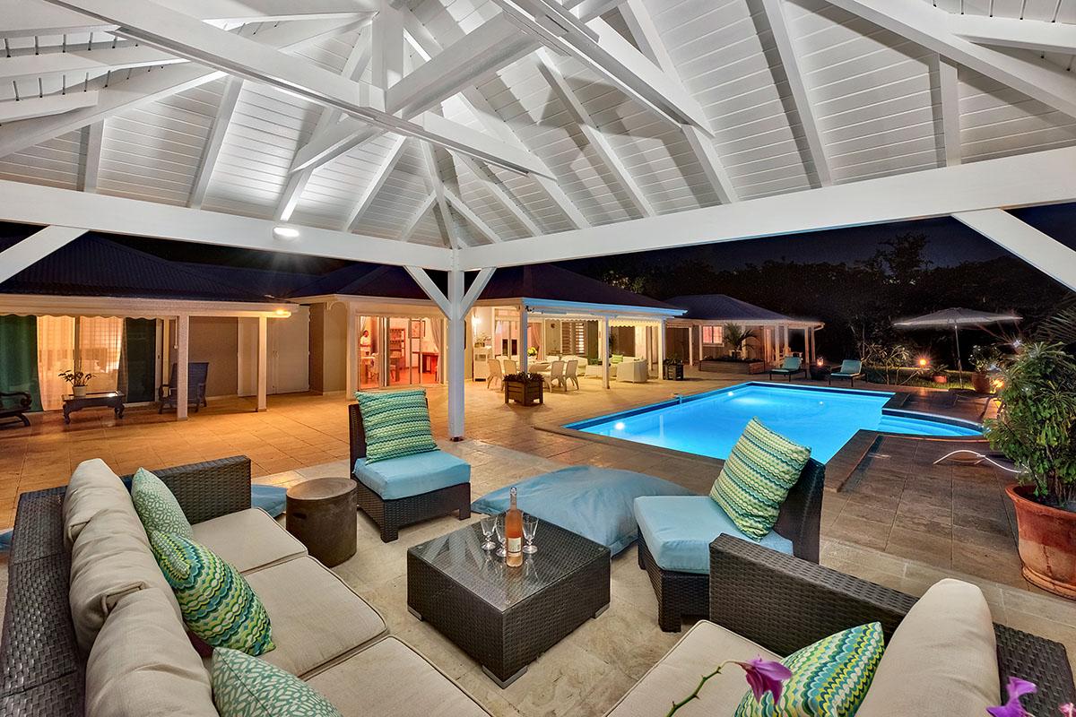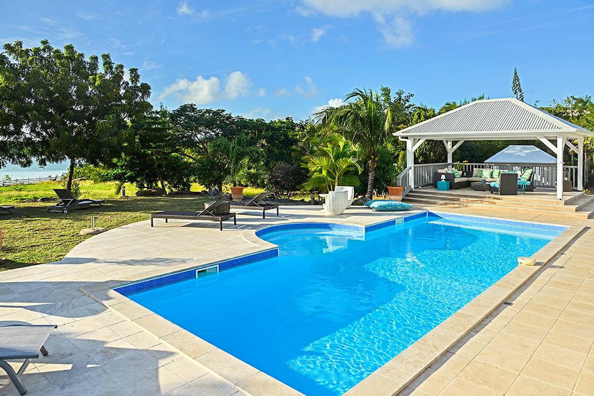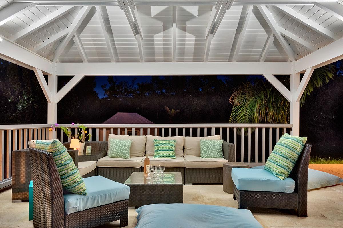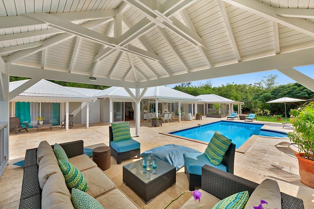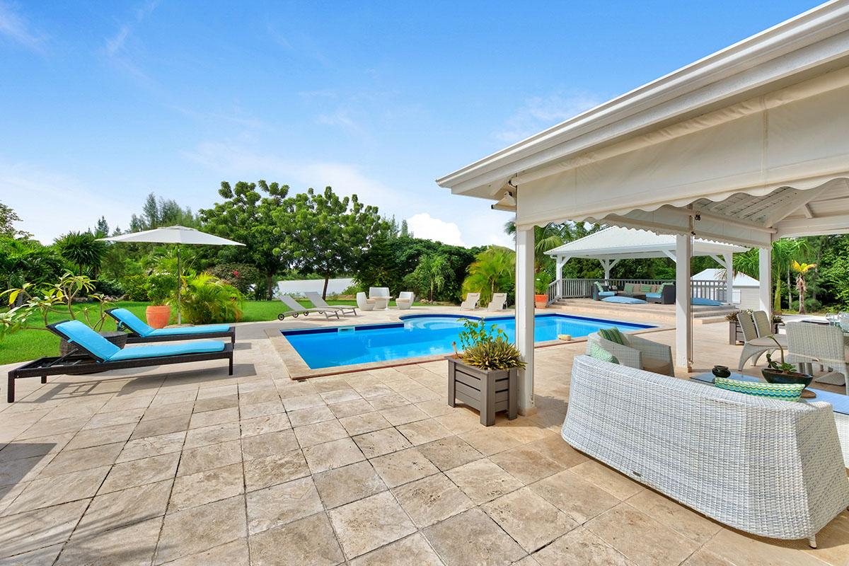 The main house is filled with charming Caribbean touches with a contemporary twist. The exterior’s soft grey and white colors and Creole flourishes well suit the tropical green setting. It is a very well curated villa, both inside and outside, filled with interesting colors, textures and décor. The overall mood is serene. The terraces are defined with travertine tiles. A large pool sits at the edge of the terrace and lawn. A spacious gazebo and deep verandahs provide generous covered spaces for dining and lounging. Stylish white wick furniture, adorned with interesting fabrics and colors, invite you to relax.