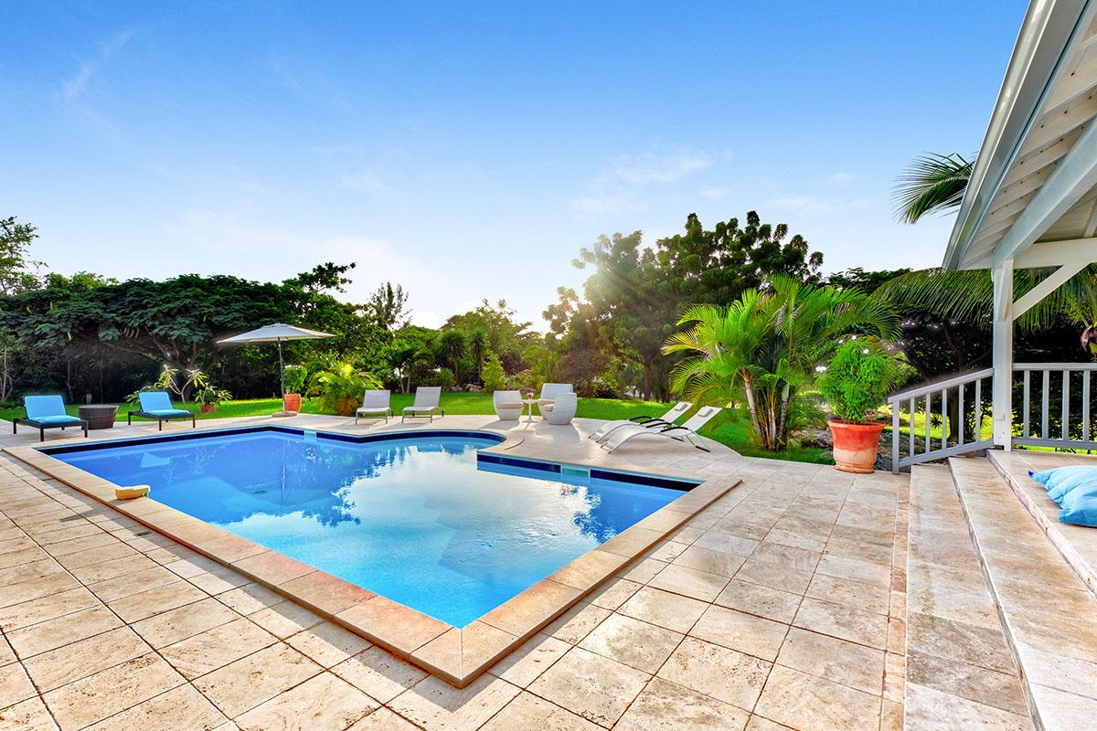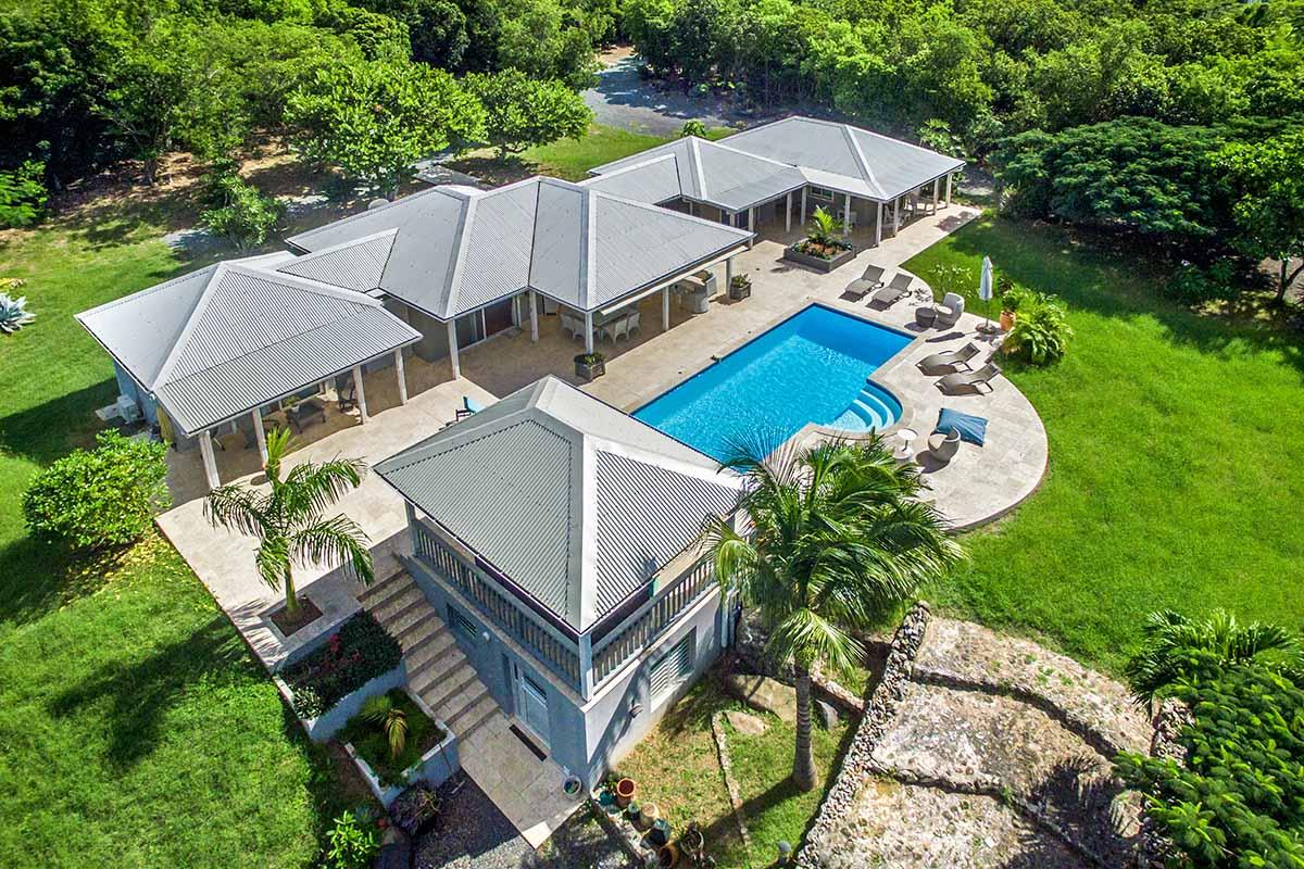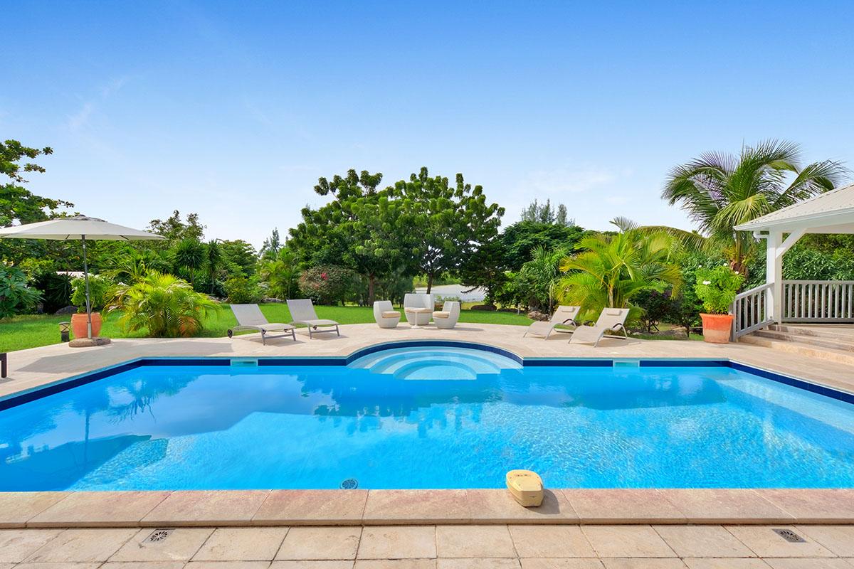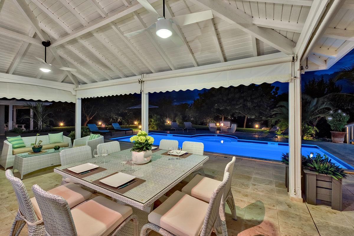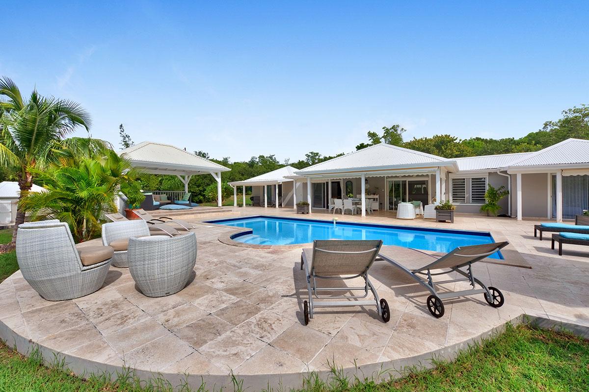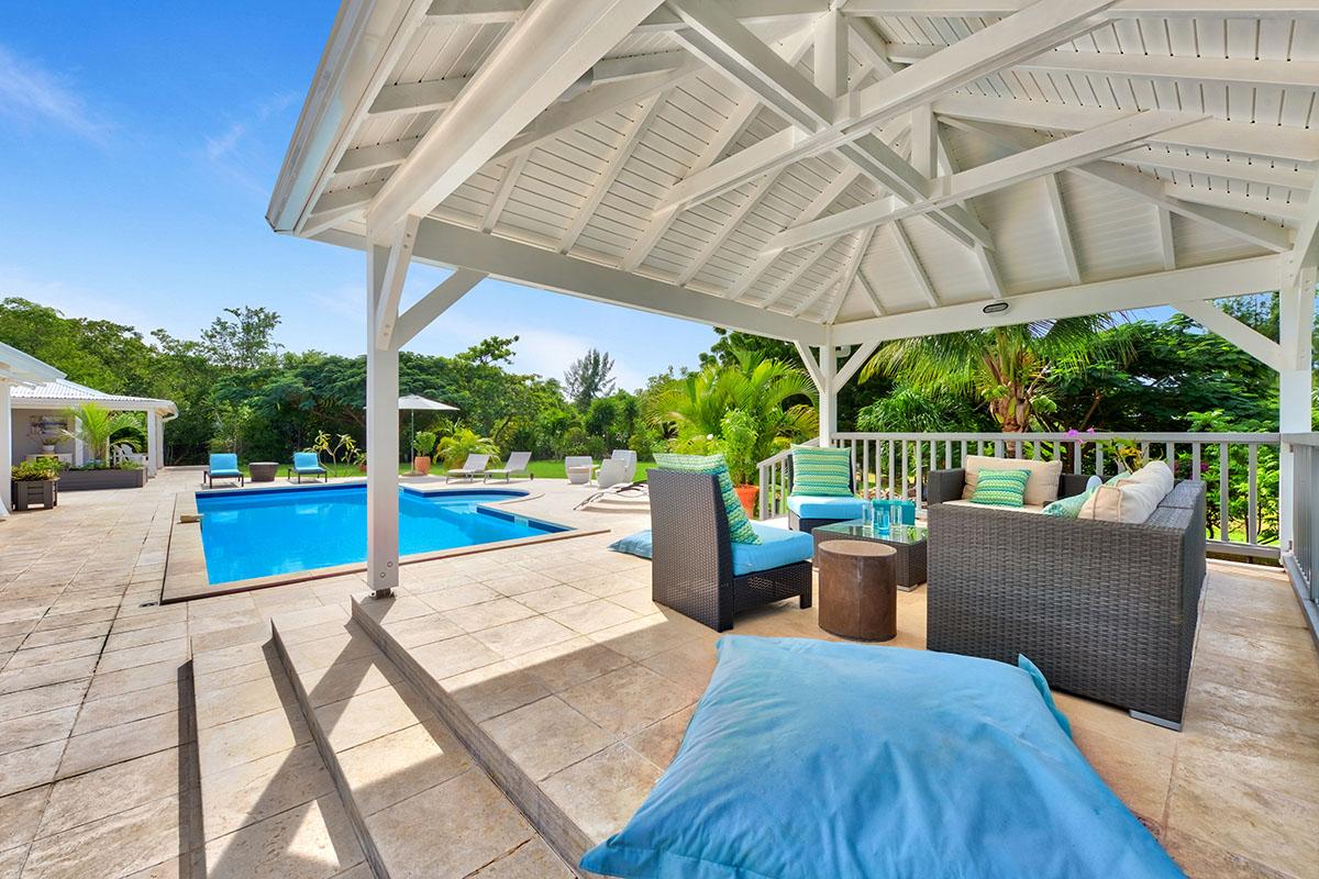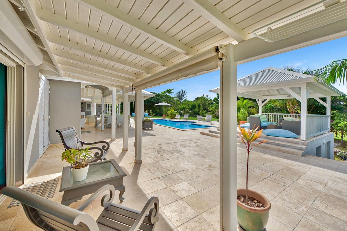 The main house is filled with charming Caribbean touches with a contemporary twist. The exterior’s soft grey and white colors and Creole flourishes well suit the tropical green setting. It is a very well curated villa, both inside and outside, filled with interesting colors, textures and décor. The overall mood is serene. The terraces are defined with travertine tiles. A large pool sits at the edge of the terrace and lawn. A spacious gazebo and deep verandahs provide generous covered spaces for dining and lounging. Stylish white wick furniture, adorned with interesting fabrics and colors, invite you to relax.