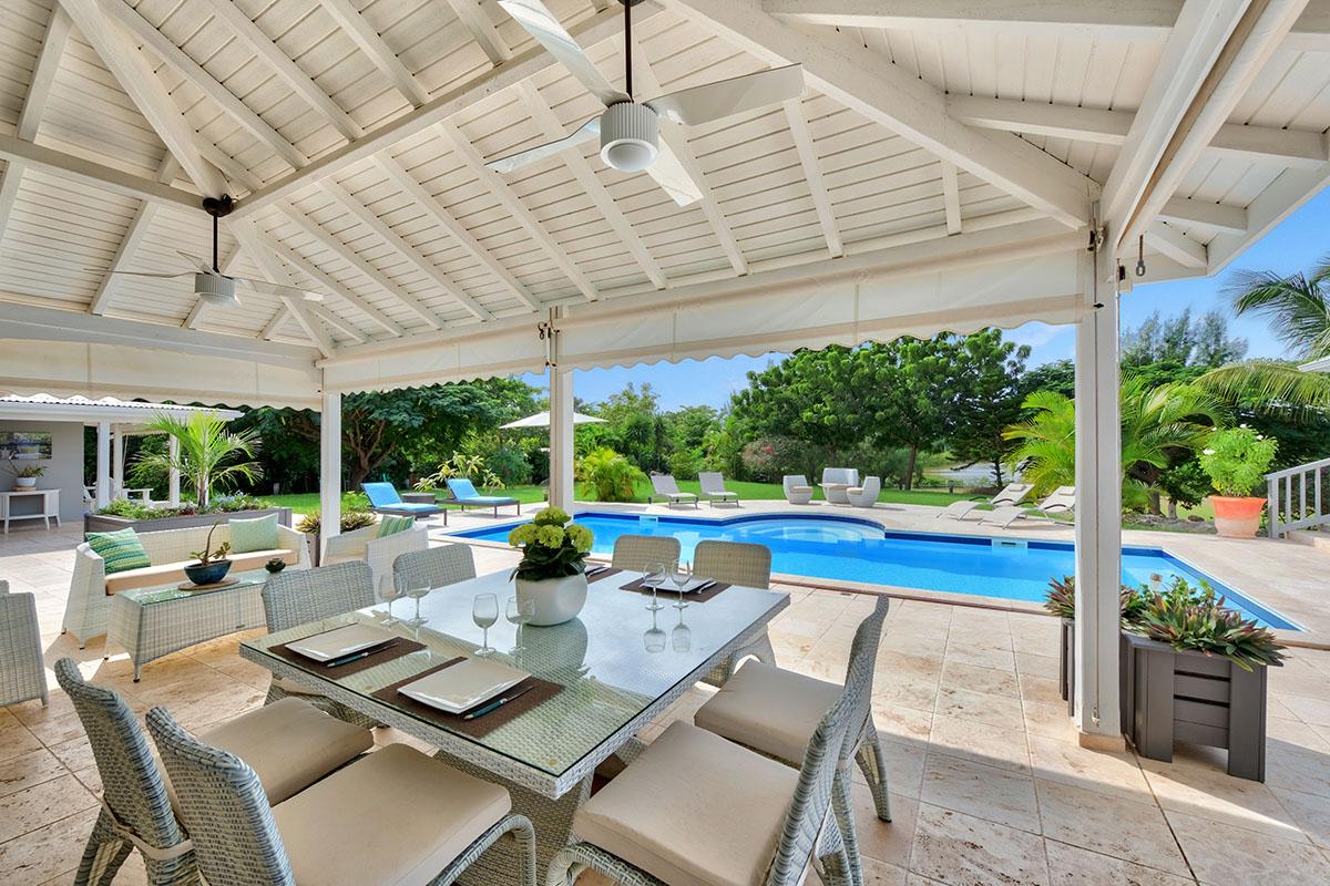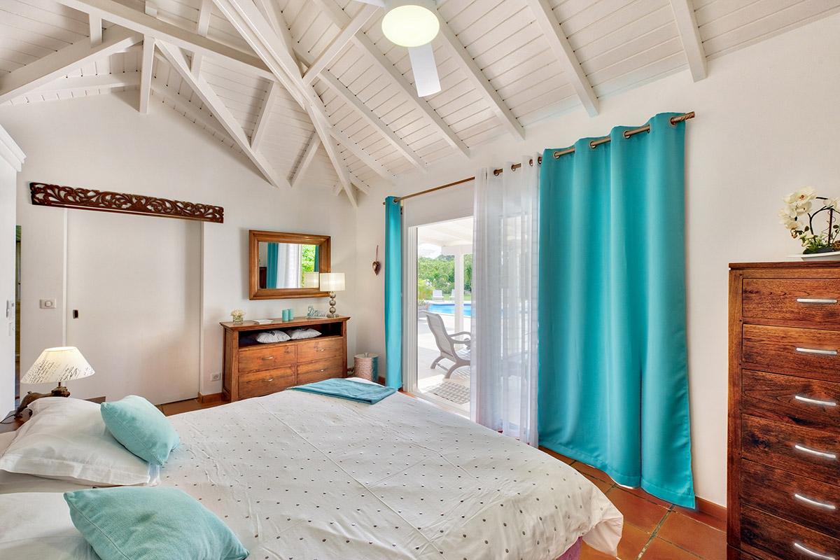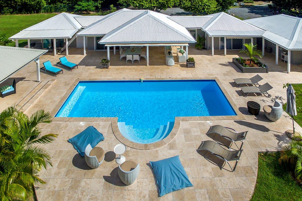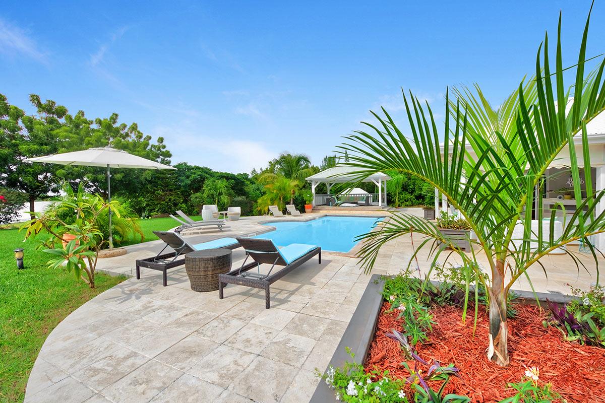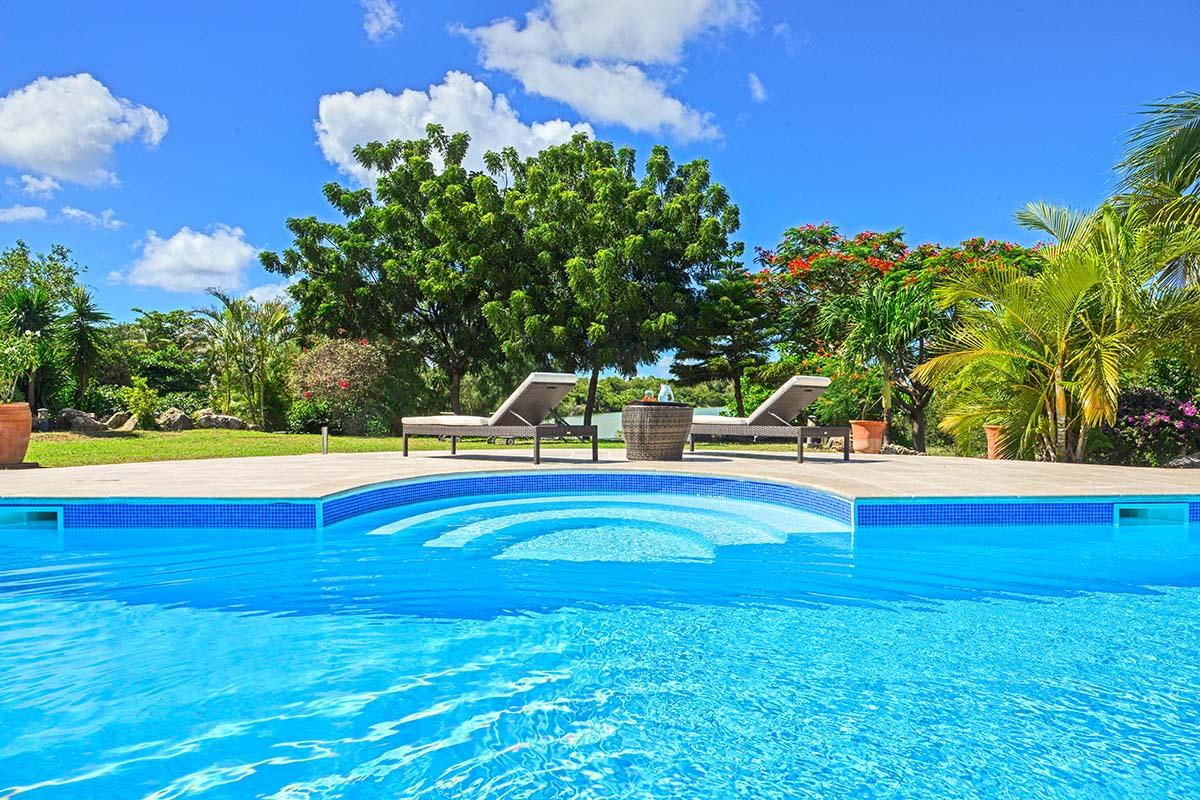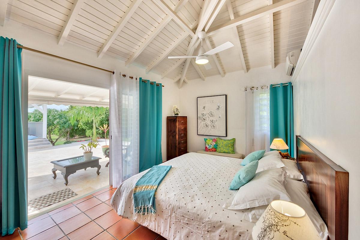 The main house is filled with charming Caribbean touches with a contemporary twist. The exterior’s soft grey and white colors and Creole flourishes well suit the tropical green setting. It is a very well curated villa, both inside and outside, filled with interesting colors, textures and décor. The overall mood is serene. The terraces are defined with travertine tiles. A large pool sits at the edge of the terrace and lawn. A spacious gazebo and deep verandahs provide generous covered spaces for dining and lounging. Stylish white wick furniture, adorned with interesting fabrics and colors, invite you to relax.
