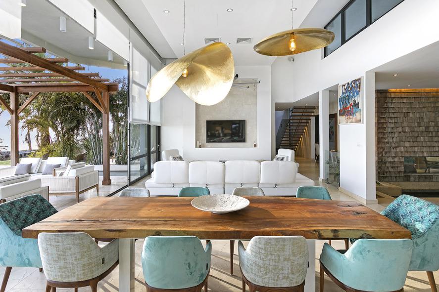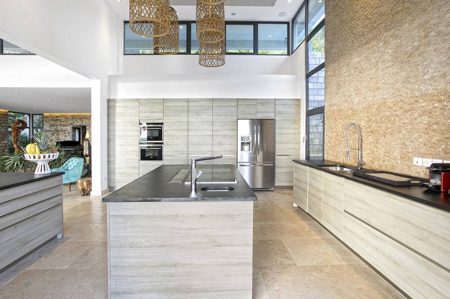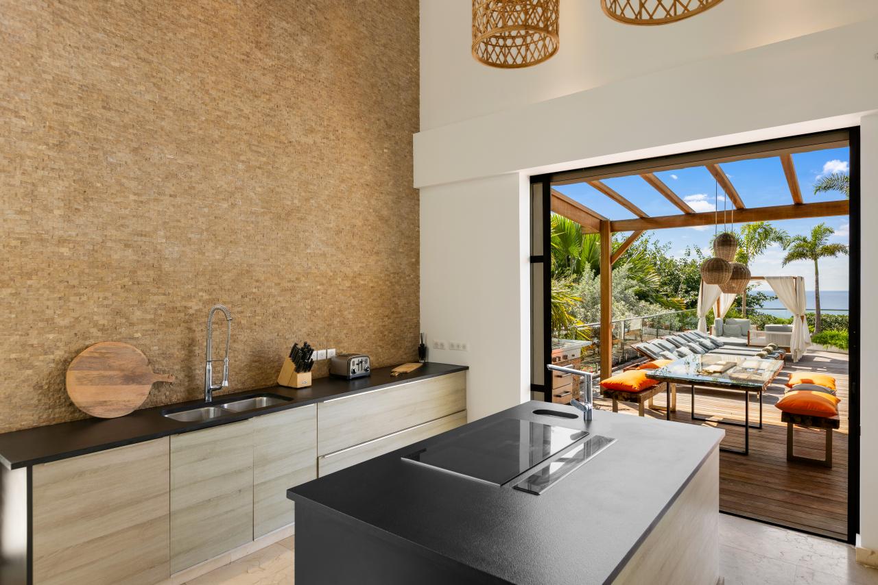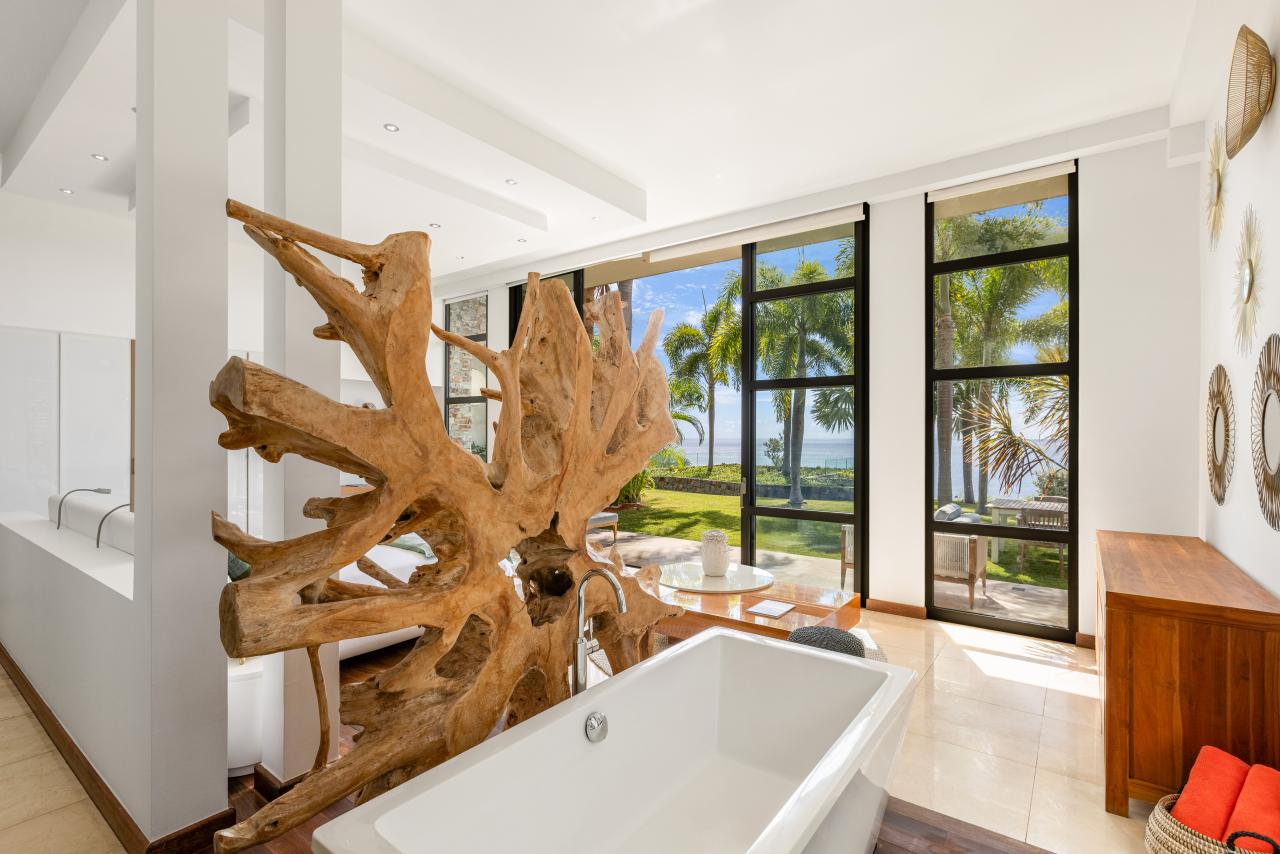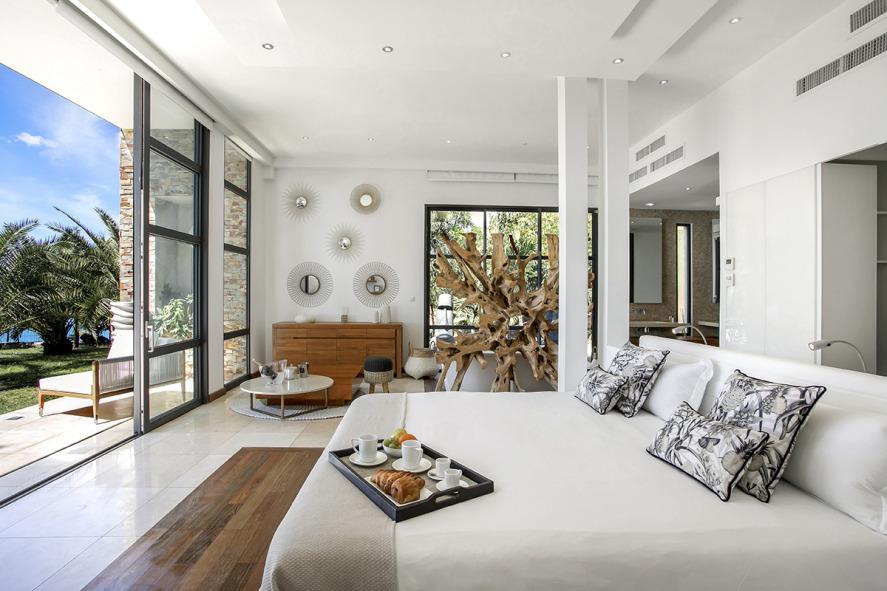 Find the magic of Emeraude upon entering, when you discover several indoor ponds filled with beautiful colorful fish creating a decorative and soothing water garden. This amazing entrance leads to a beautiful interior living space with high ceilings facing the swimming pool and the azur sea. An elegant yet comfortable living room blends with the outdoor ocean colours while the large solid wood dining table joins the space to the fully equipped kitchen with all the latest appliances. Special to the kitchen is the hidden pantry. Meals can also be taken outside around the beautiful table near the pool.