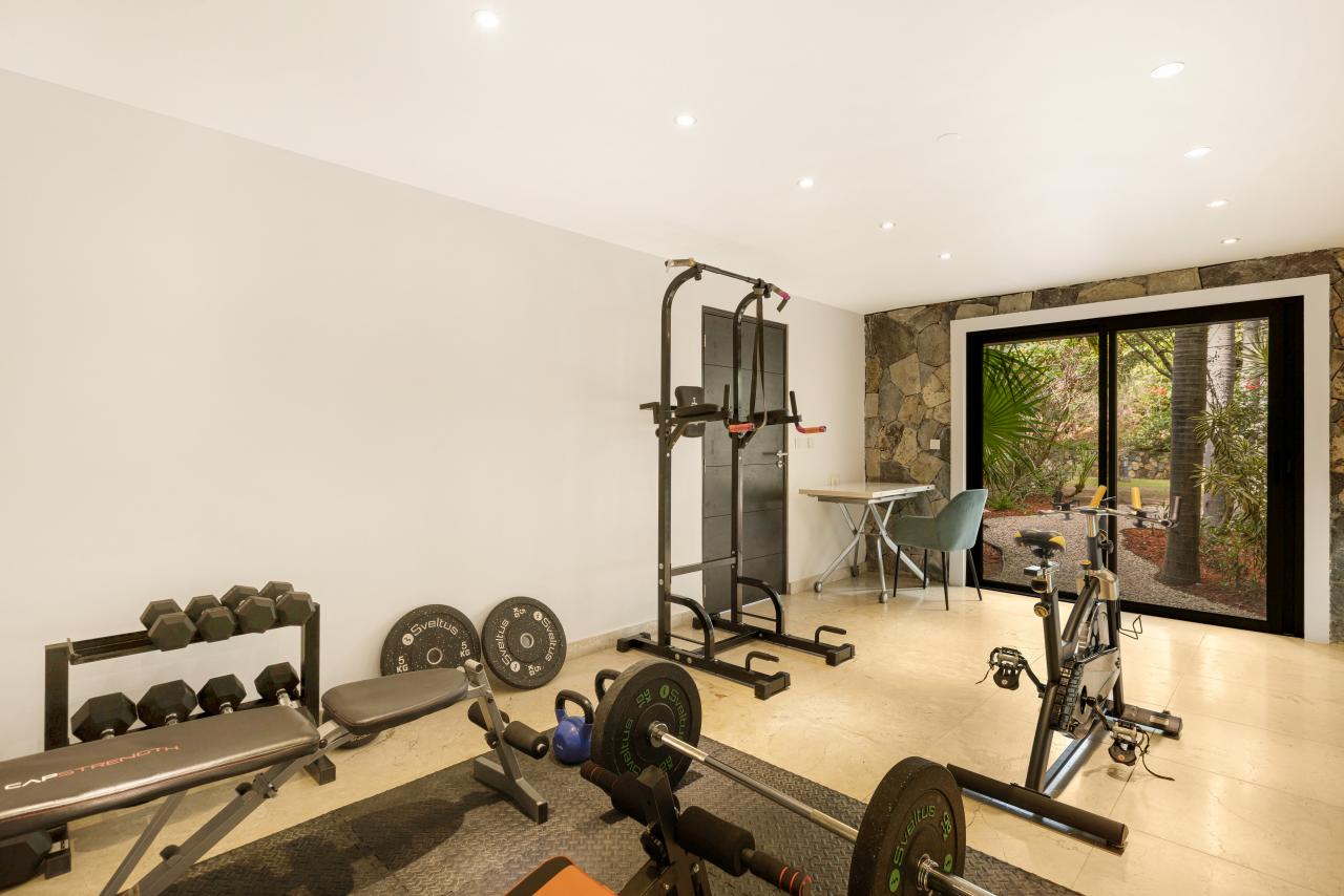 The house also includes some gym equipment and a spa with a massage table.