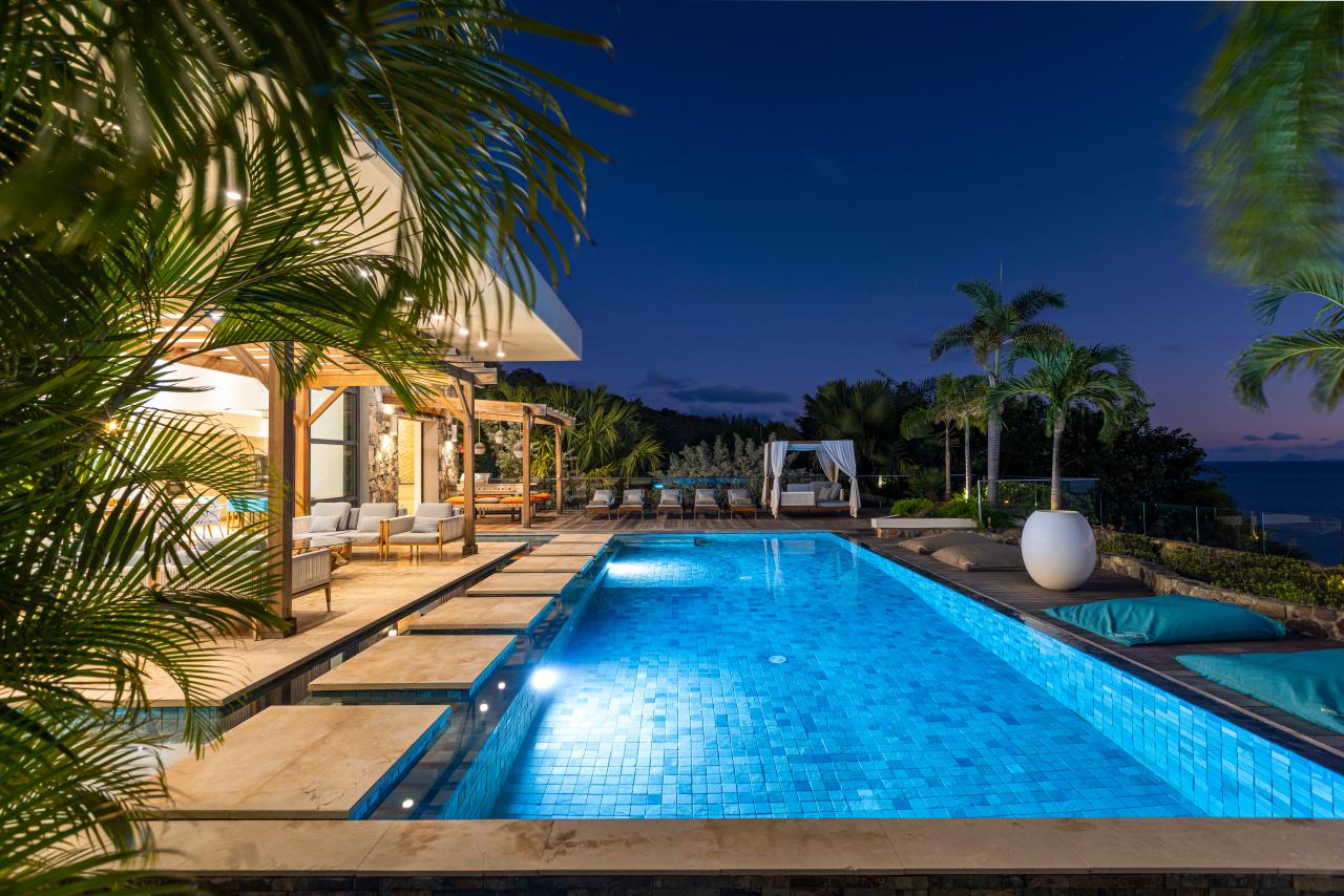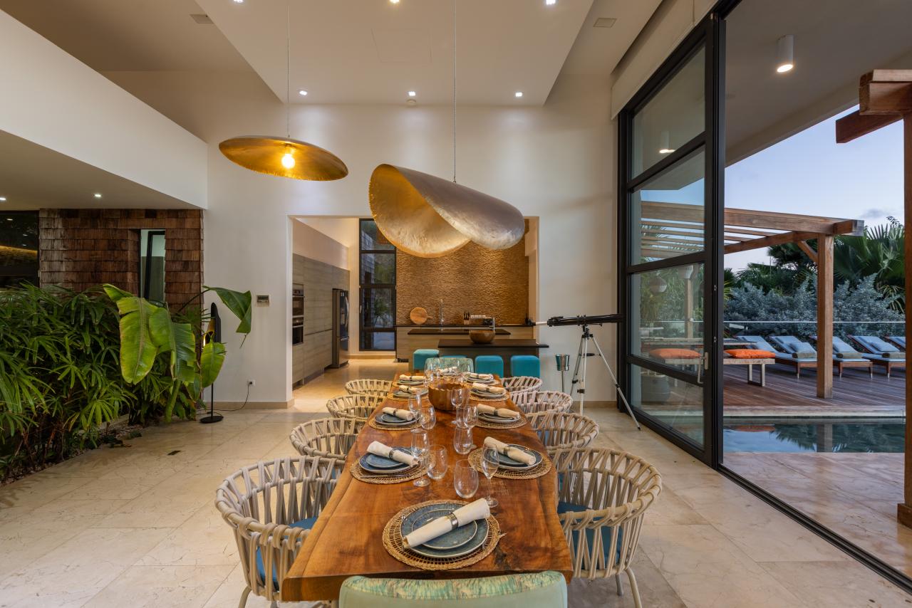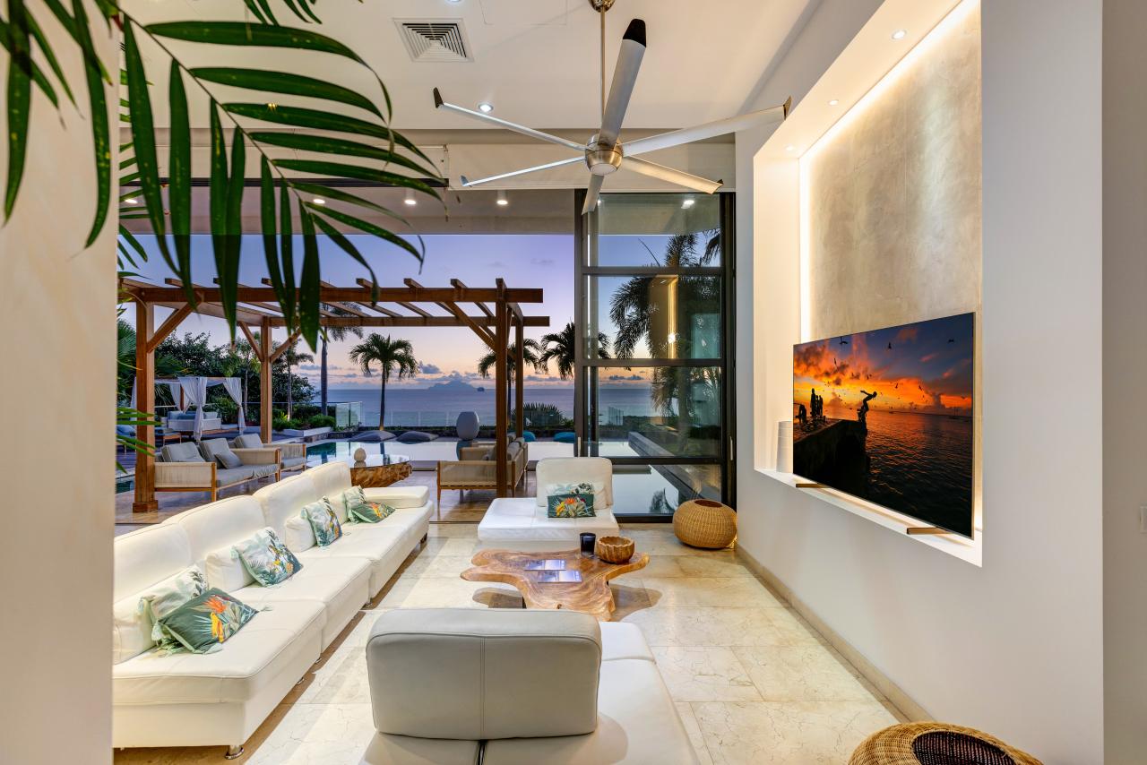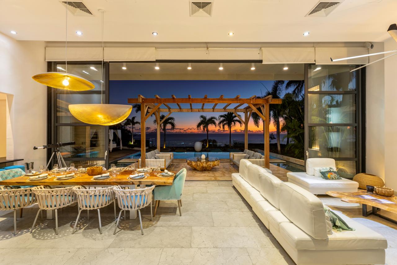 The villa has gorgeous outdoor spaces to enjoy the Caribbean tropical climate. A large shaded living space just steps from both the pool and the inside provides the perfect place to relax any time of the day. The beautiful infinity pool includes built in steps from the outdoor living room to the dining space. Another terrace features daybeds for a sunny spot to lounge by the pool and enjoy the views. At the end of the day, the villa is the perfect place to enjoy a bright and colorful sunset. Have a drink, get comfortable and enjoy the breathtaking view.
