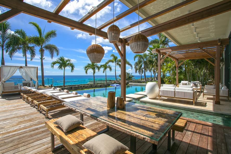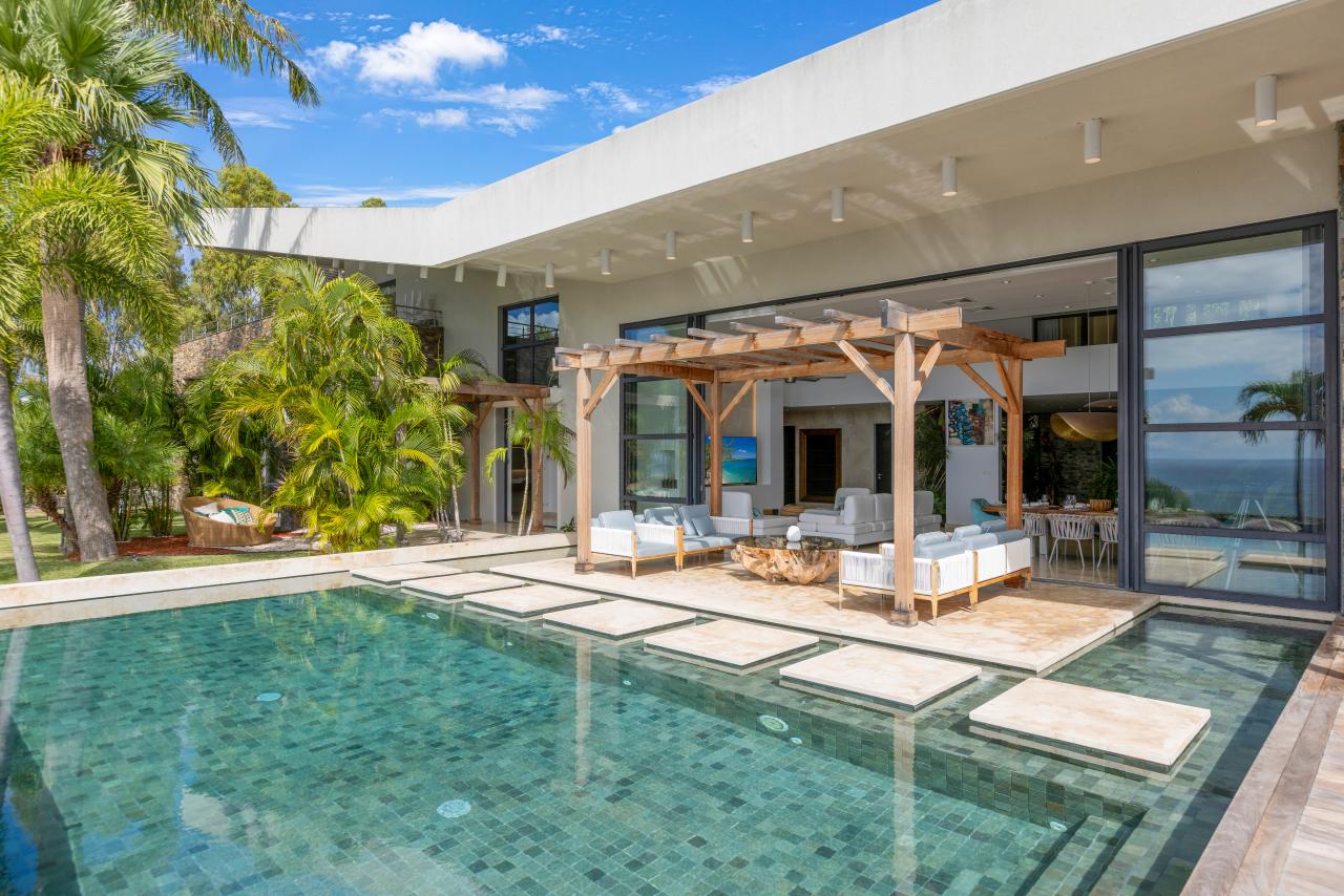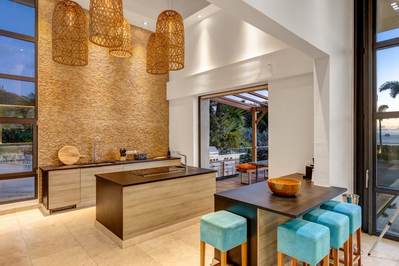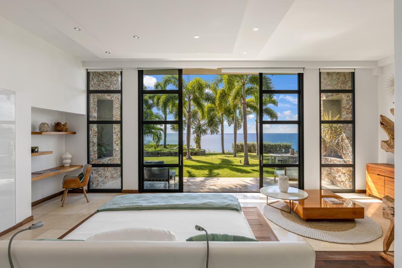 The villa has gorgeous outdoor spaces to enjoy the Caribbean tropical climate. A large shaded living space just steps from both the pool and the inside provides the perfect place to relax any time of the day. The beautiful infinity pool includes built in steps from the outdoor living room to the dining space. Another terrace features daybeds for a sunny spot to lounge by the pool and enjoy the views. At the end of the day, the villa is the perfect place to enjoy a bright and colorful sunset. Have a drink, get comfortable and enjoy the breathtaking view.