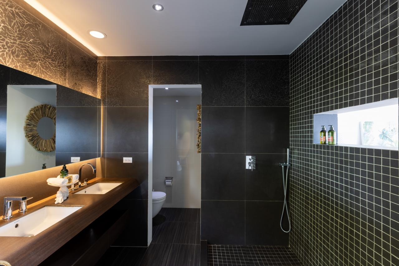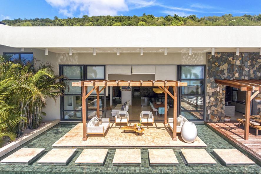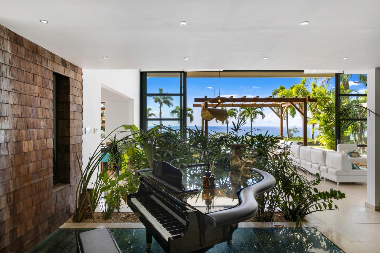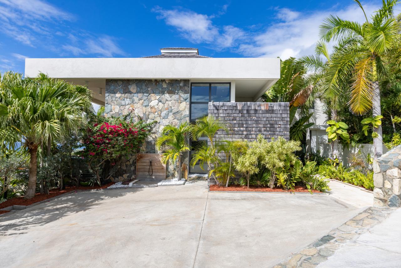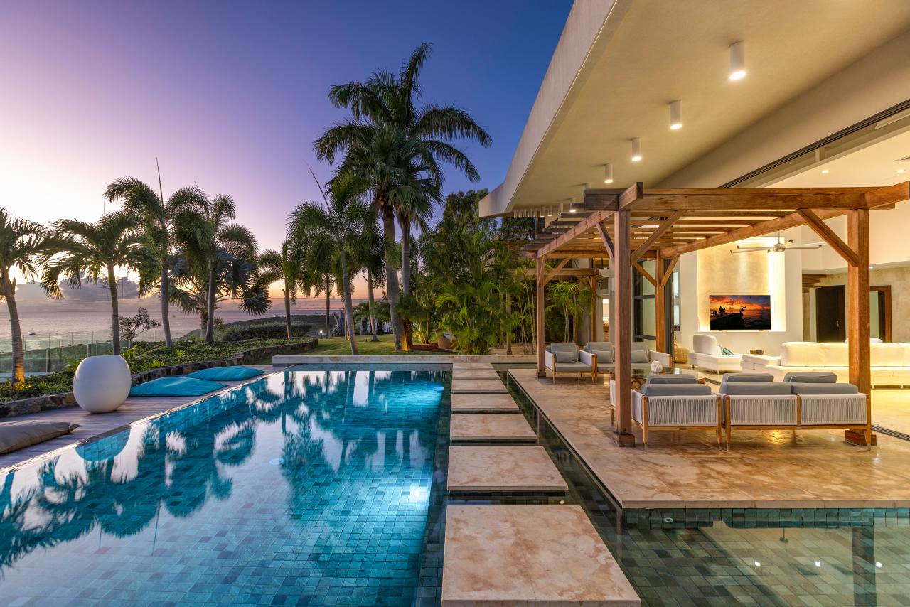 The villa has gorgeous outdoor spaces to enjoy the Caribbean tropical climate. A large shaded living space just steps from both the pool and the inside provides the perfect place to relax any time of the day. The beautiful infinity pool includes built in steps from the outdoor living room to the dining space. Another terrace features daybeds for a sunny spot to lounge by the pool and enjoy the views. At the end of the day, the villa is the perfect place to enjoy a bright and colorful sunset. Have a drink, get comfortable and enjoy the breathtaking view.
