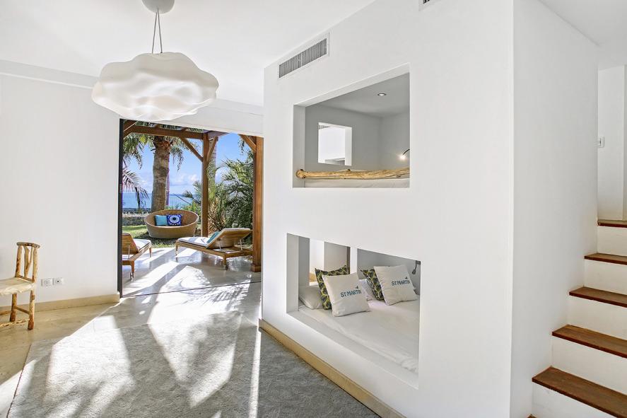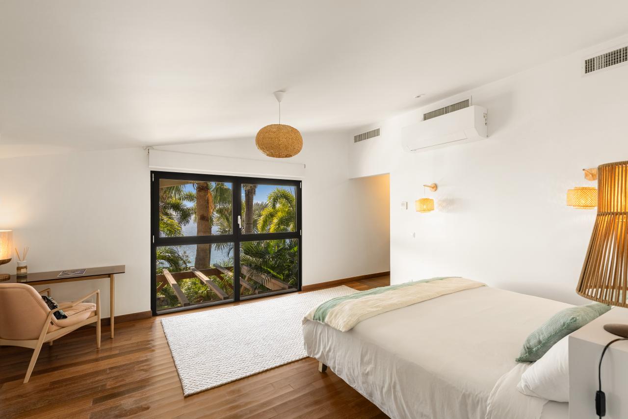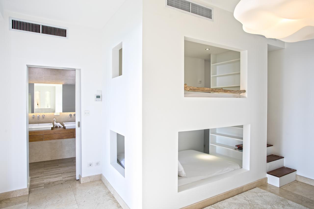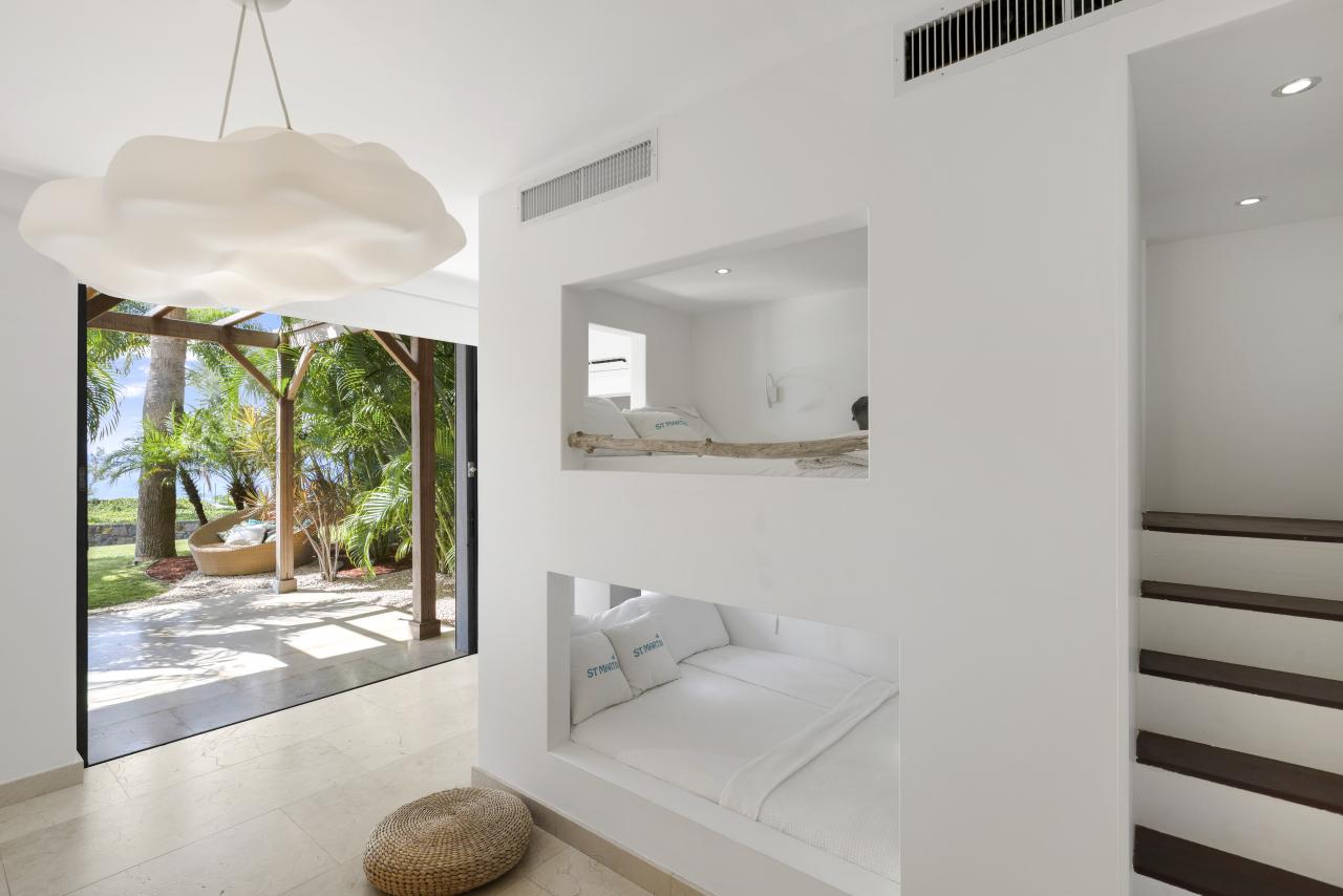 The first three bedrooms are located on the main level, including the master suite, which opens directly onto the tropical garden, offering a refreshing and exotic start to each morning. One of the other two rooms features two large bunk beds, providing the ideal setup for children and close proximity to the master bedroom.