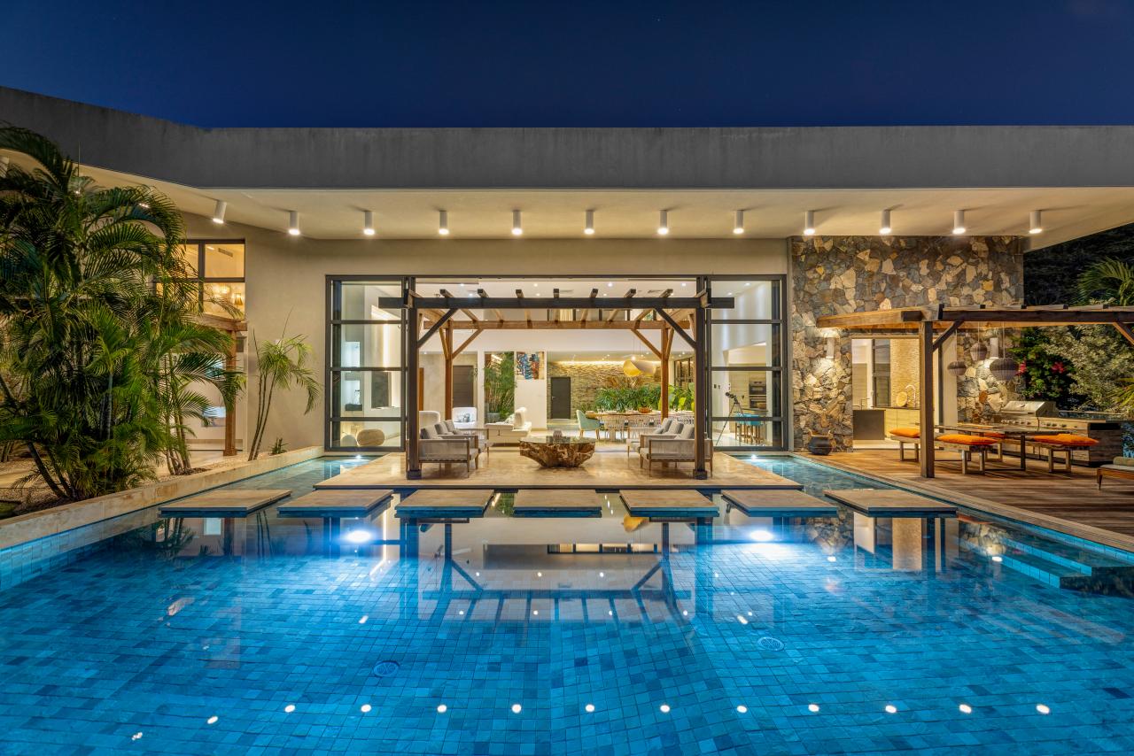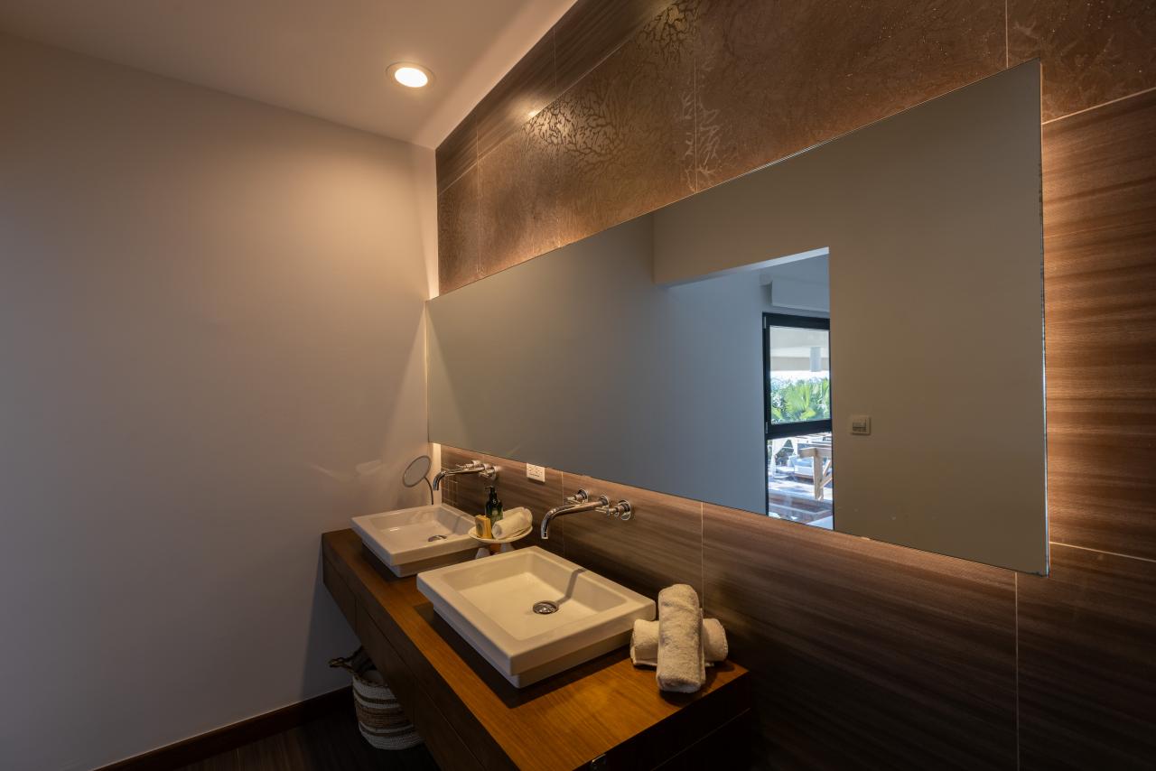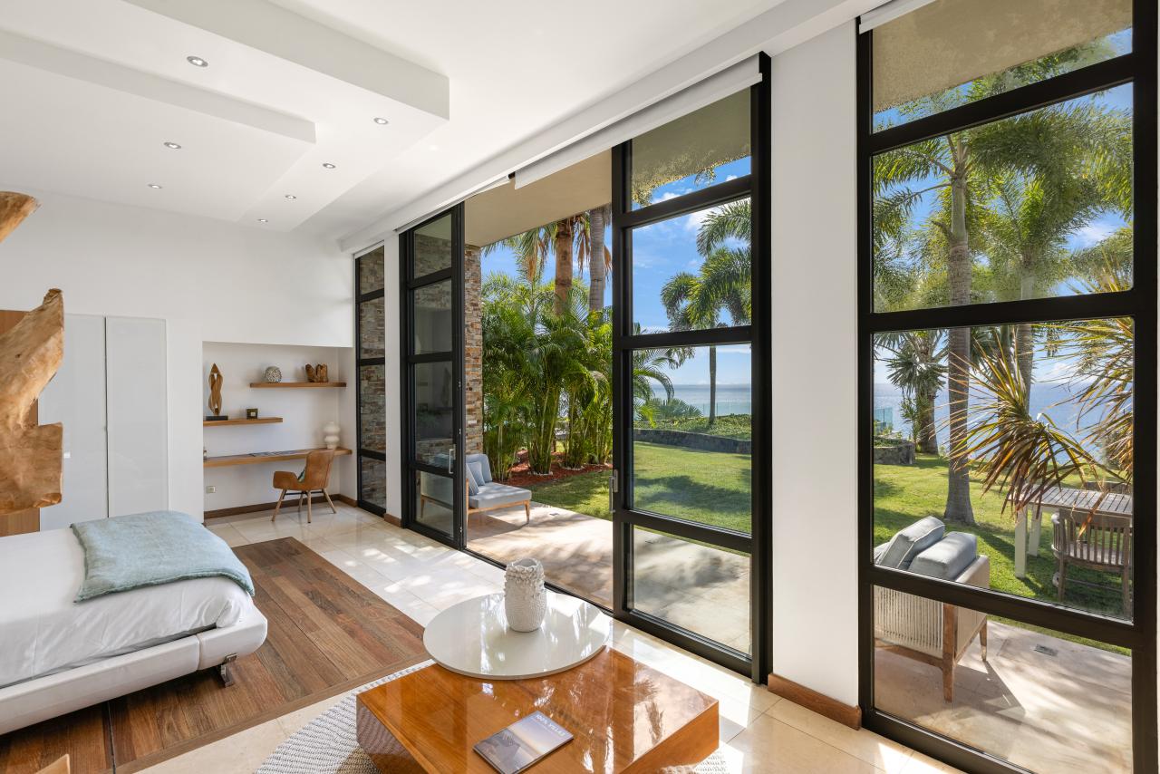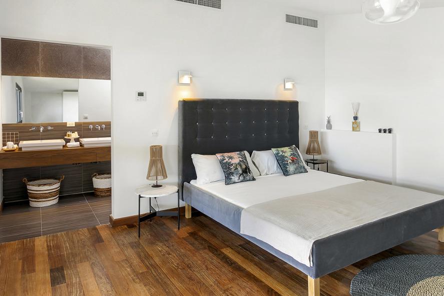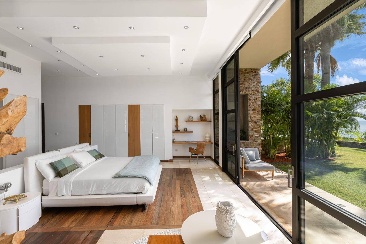The first three bedrooms are located on the main level, including the master suite, which opens directly onto the tropical garden, offering a refreshing and exotic start to each morning. One of the other two rooms features two large bunk beds, providing the ideal setup for children and close proximity to the master bedroom.