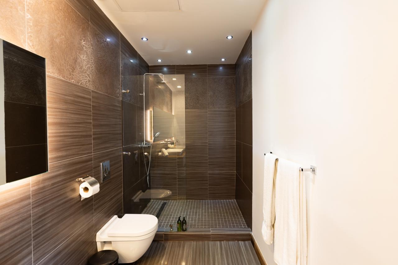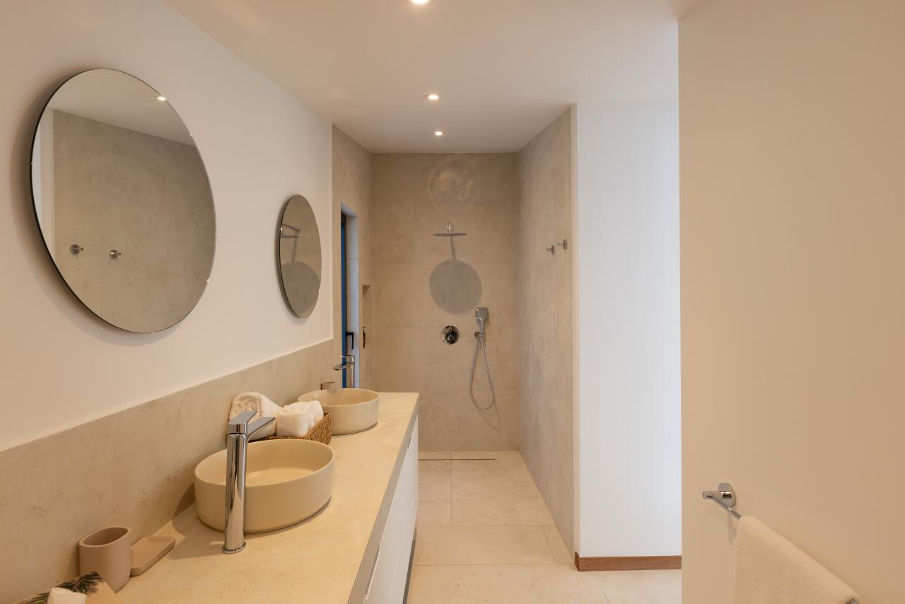 The remaining two bedrooms are located upstairs. One of them features its own private terrace with a jacuzzi, creating a secluded space for relaxation. Each of these rooms has its own ensuite bathroom.