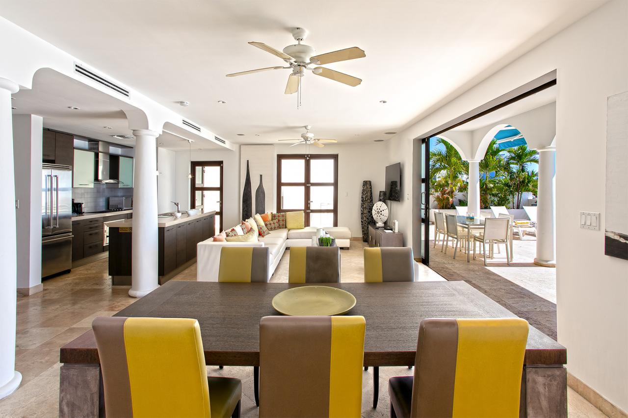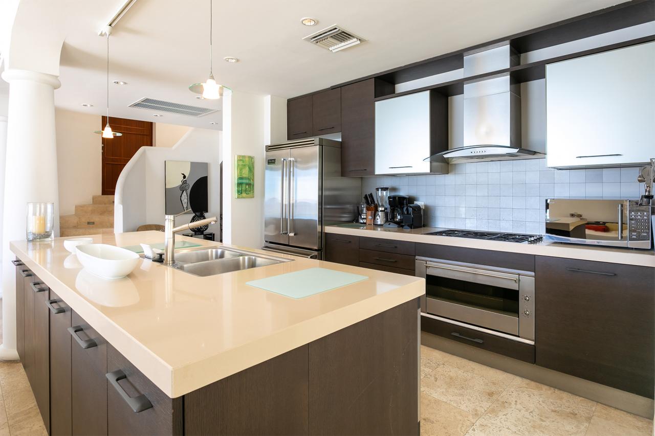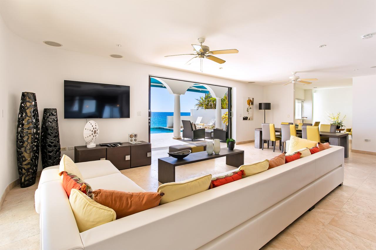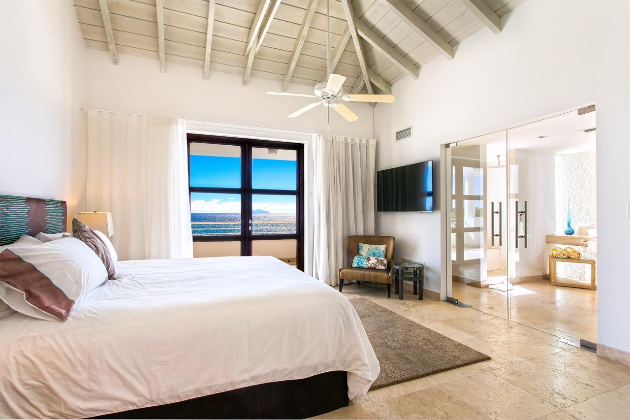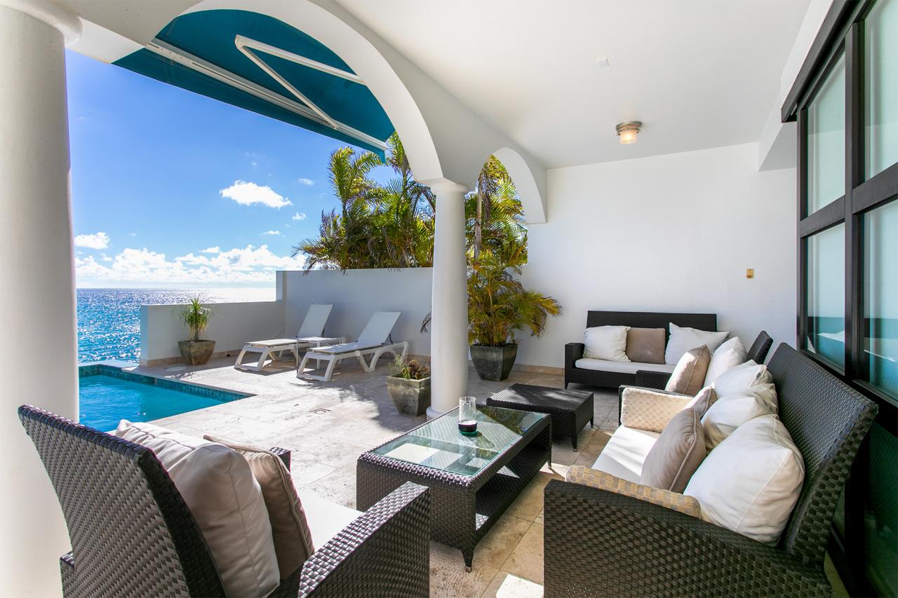 The contemporary interiors flow through stunning glass and wood sliding doors right onto a spacious covered travertine terrace and deck. The wraparound space is perfect for outdoor dining and lounging. Graceful arches and columns draw your eye to the deep blue pool that seems to flow straight to the sea. You share a private entrance to Cupecoy Beach. An awning lowers to provide shade from the late afternoon sun.