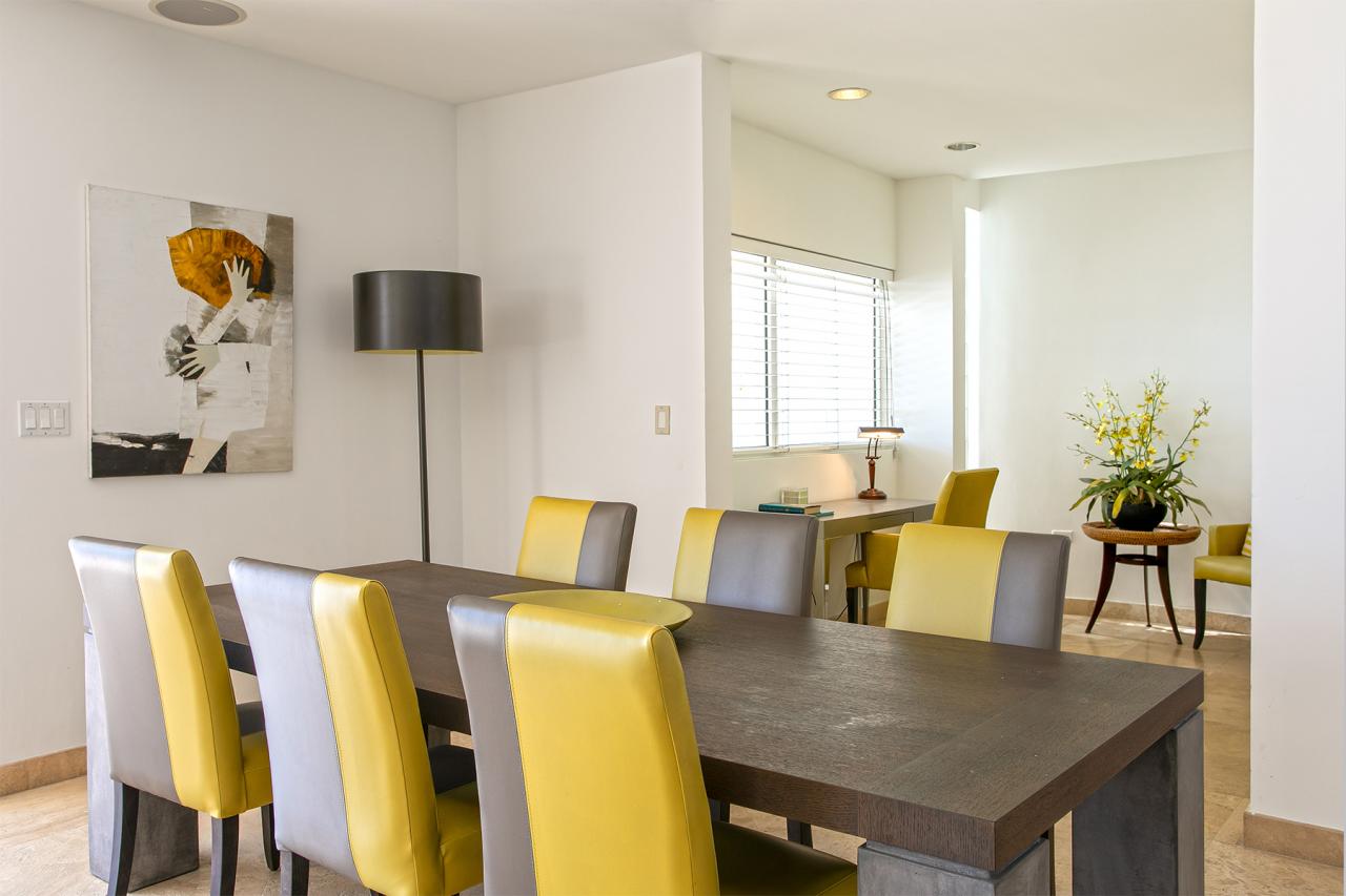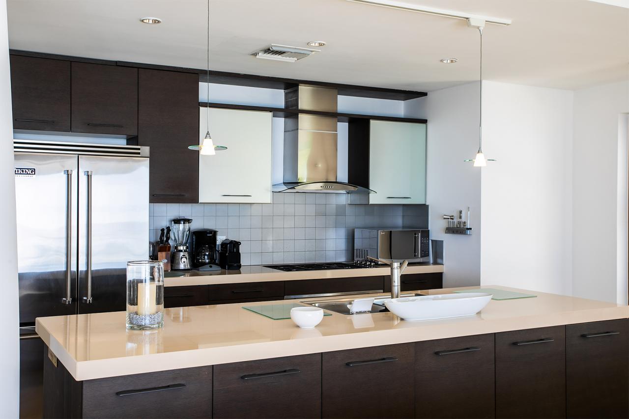 The interior décor has a contemporary French vibe; elegant, interesting and comfortable. Dark woods blend with cream, taupe, grey and lime fabrics and leather. The open plan living area features a high-end kitchen with luxury stainless steel appliances. The large main living area combines lounging, dining and media spaces with a spacious office nook. A powder room is conveniently located on the first floor.
