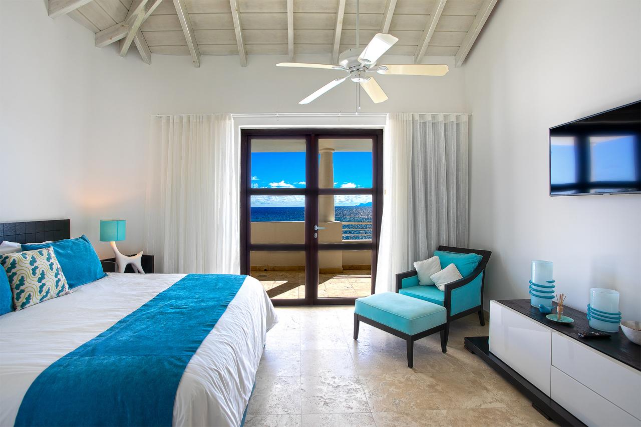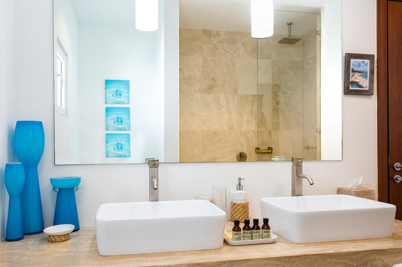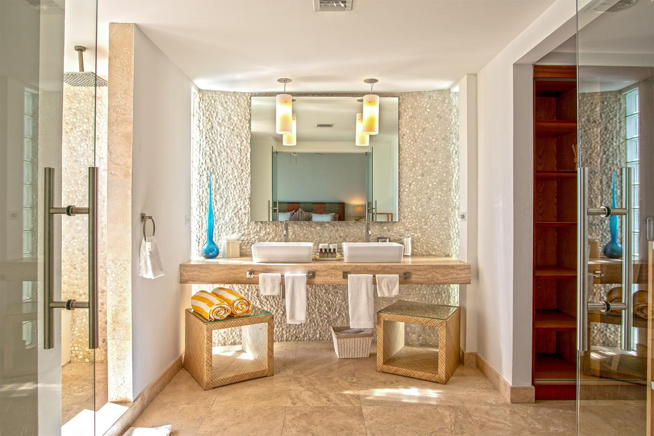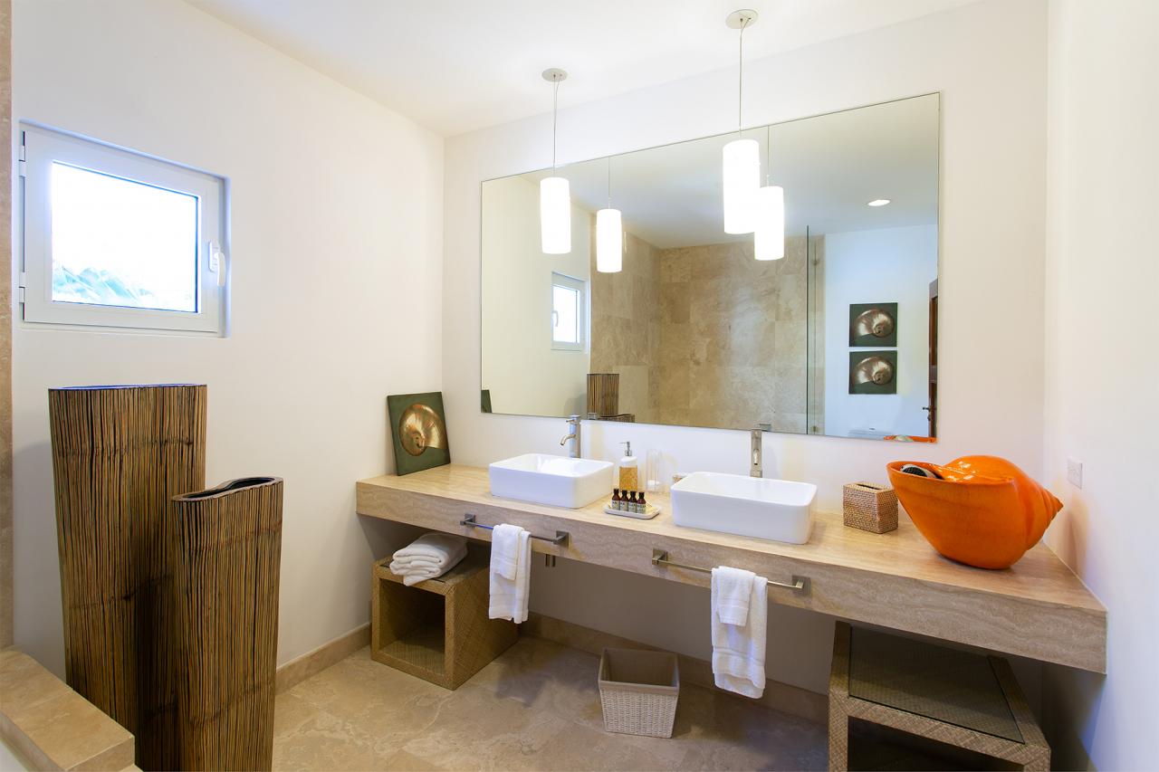 The four equal size bedrooms have king size beds, sea views, private outdoor seating areas and beautiful en suite bathrooms. One bedroom is on the main level while the 3 others are up a curved staircase. Each room has a distinctive color theme mixing lime, grey, teal, brown, mango and cream. Interesting objects d’art is scattered through the villa. The spa style bathrooms have walk in showers; one has a soaking tub. The décor combines woods, glass, travertine tiles and river stones with sleek brushed chrome fixtures.