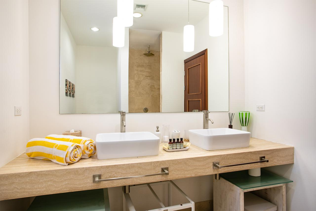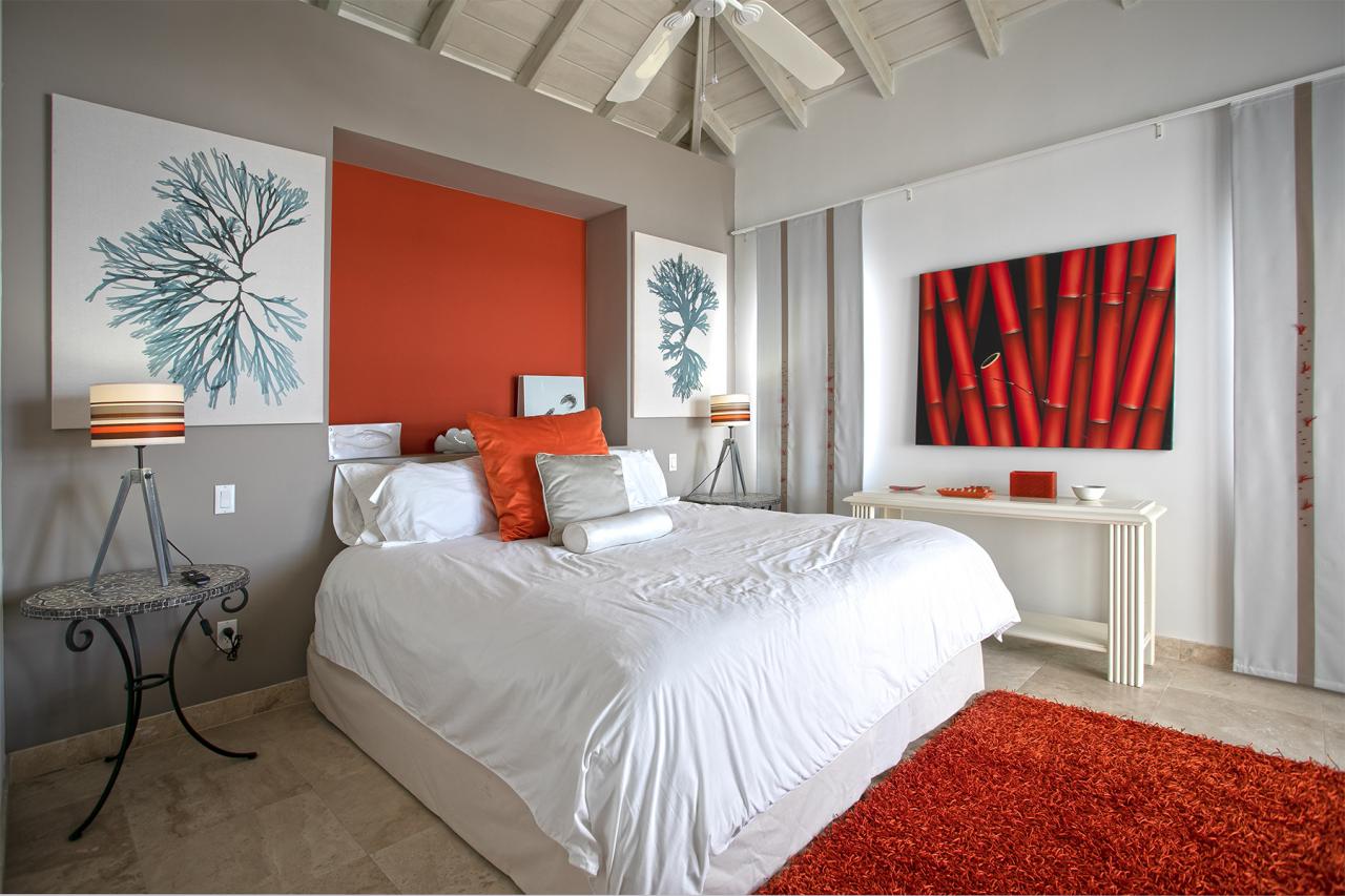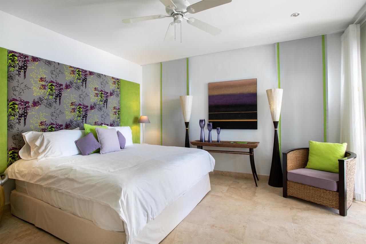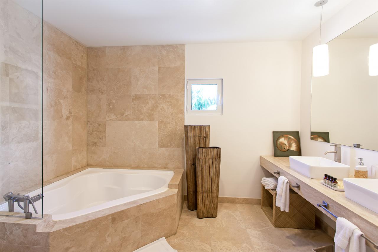 The four equal size bedrooms have king size beds, sea views, private outdoor seating areas and beautiful en suite bathrooms. One bedroom is on the main level while the 3 others are up a curved staircase. Each room has a distinctive color theme mixing lime, grey, teal, brown, mango and cream. Interesting objects d’art is scattered through the villa. The spa style bathrooms have walk in showers; one has a soaking tub. The décor combines woods, glass, travertine tiles and river stones with sleek brushed chrome fixtures.