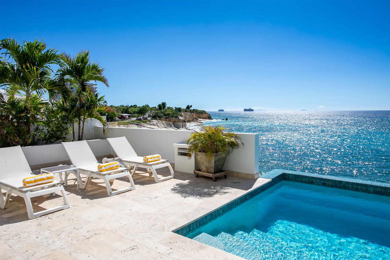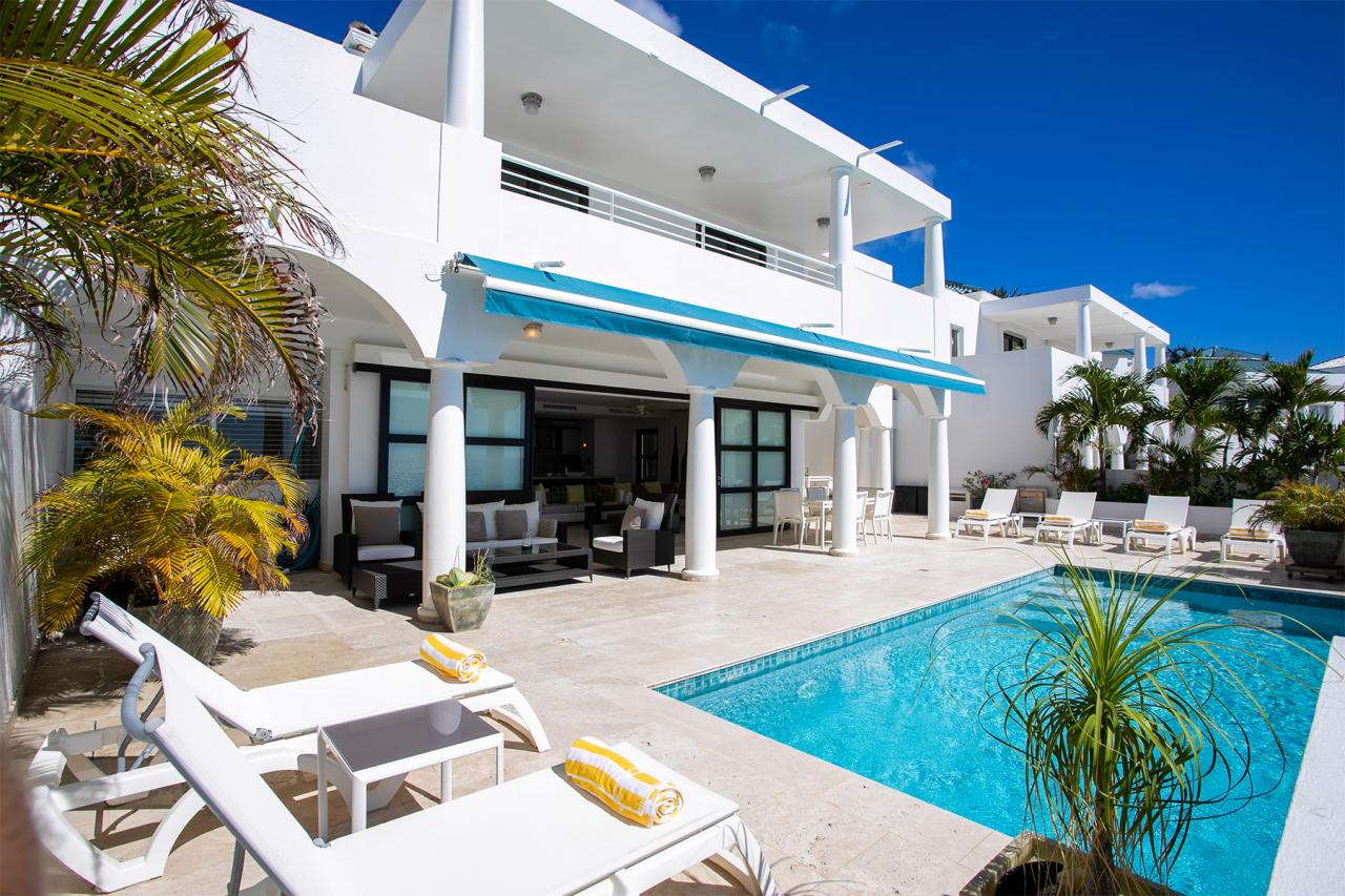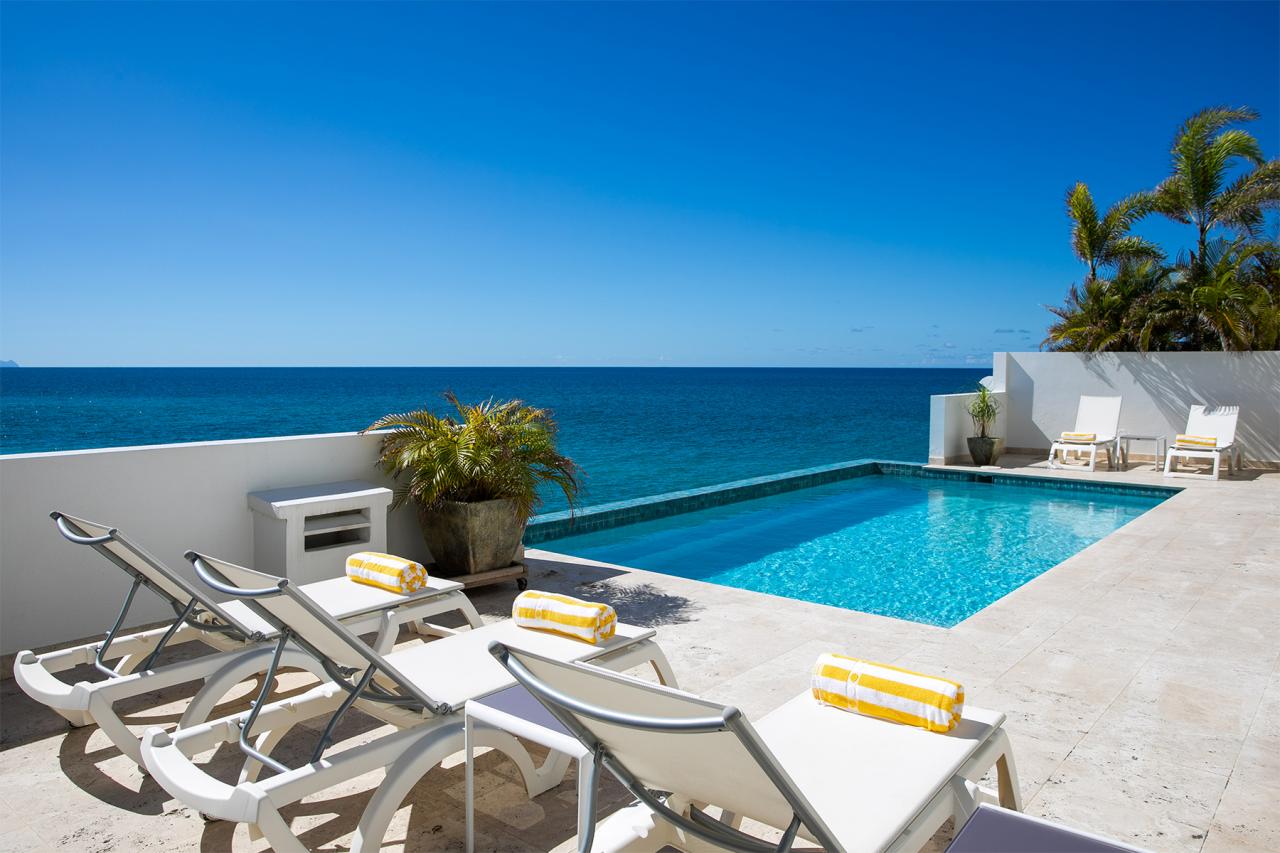 Farniente is a contemporary villa at the edge of the sea located in the private community of Shore Pointe right on the French/Dutch Border. This luxurious gated enclave is like a stylish gleaming white village on a sunny Greek island. The entrance to Farniente is framed by lush tropical plantings and classic white columns. The front door opens to the dramatic descending marble staircase that transports you to the main living area and a stunning view of the blue sky, Caribbean Sea and outer islands.