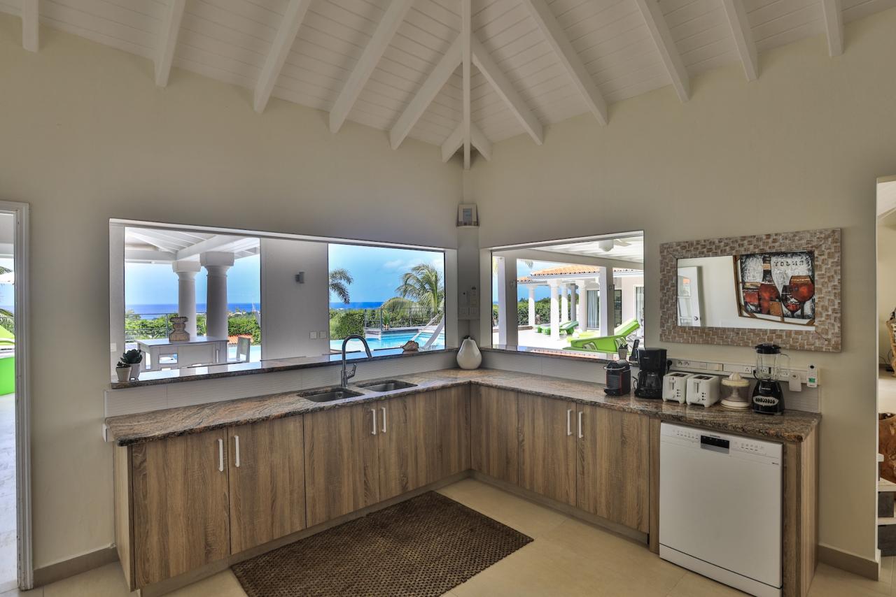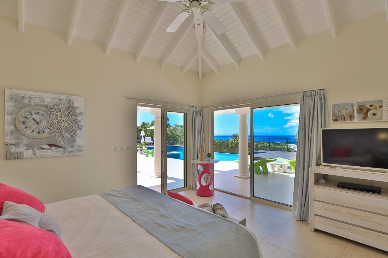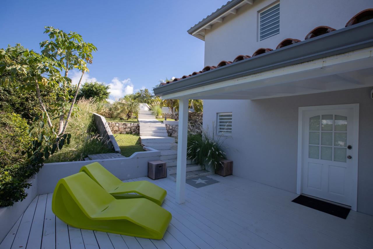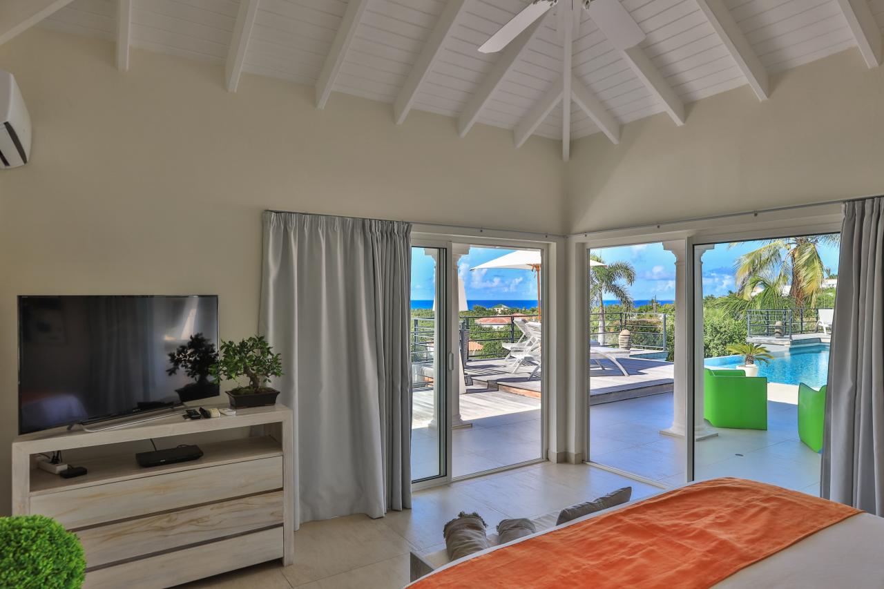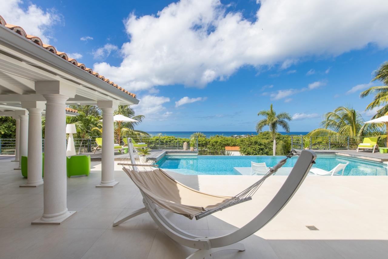 Giselle’s heated pool on the spacious terrace overlooks Plum Bay Beach and the sumptuous setting sun. This superb St Martin rental has a 180º view of the crystal blue waters of the Caribbean and is but a short 5-minute walk to the beach.