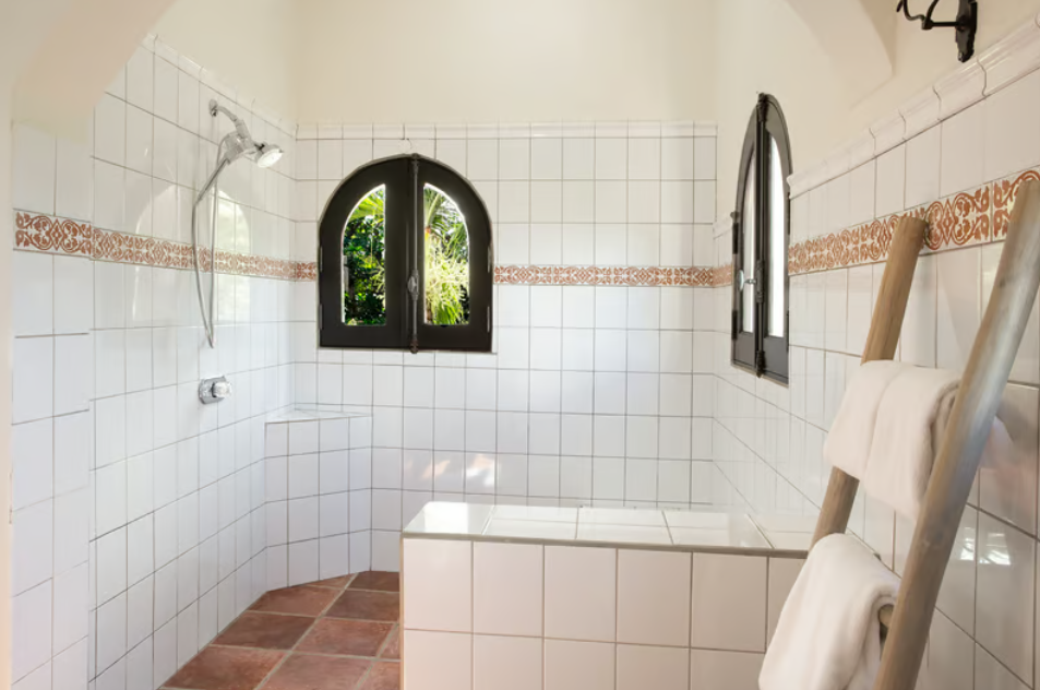 The main interior great room combines the living room, dining room and kitchen. Banquettes, teak furniture and artful touches add to the exotic mood. The kitchen is beautifully equipped with modern new appliances. Each of the four bedrooms is very private, located each on its own level. One bedroom is on the lower level of the terrace away from the daily routine. Each bedroom has ocean views and romantic furnishings blending white fabrics and linens with teak and wicker furniture. The en-suite bathrooms are designed with classic tiles from Provence, adding to the romantic feel of the villa.