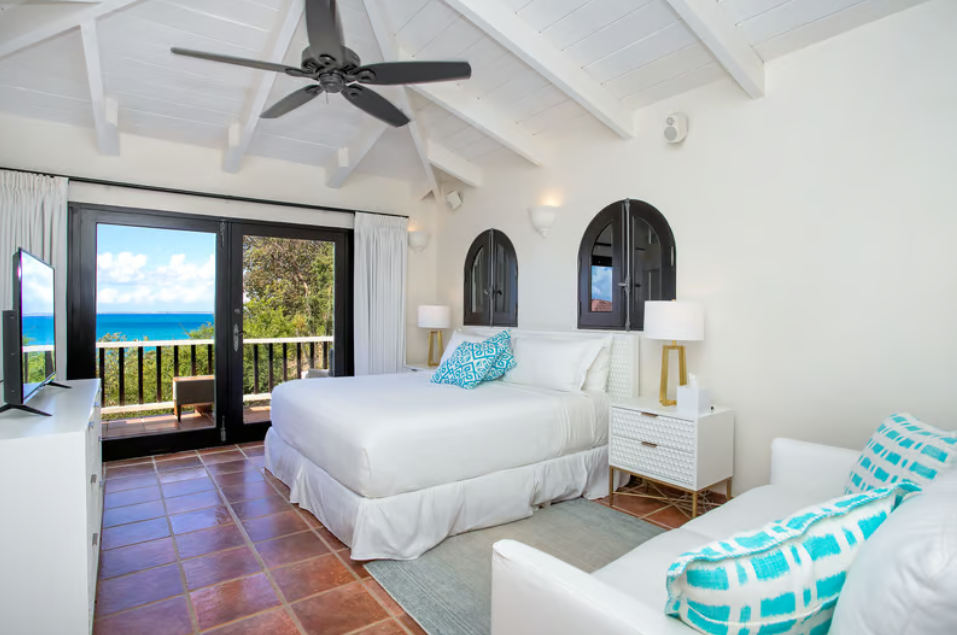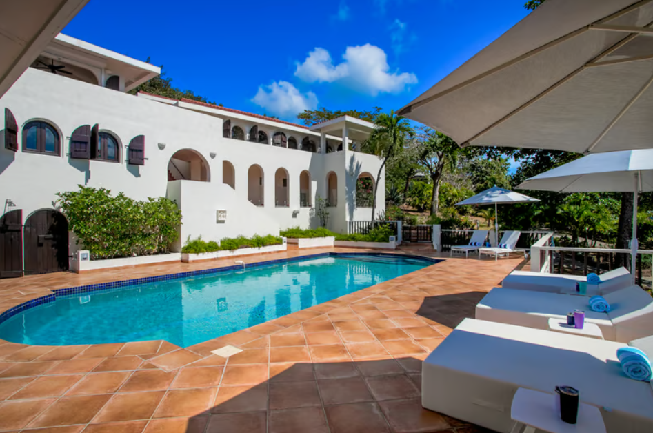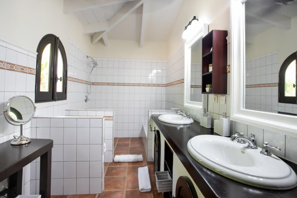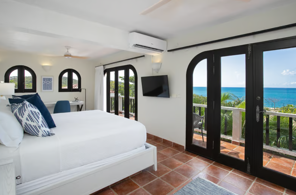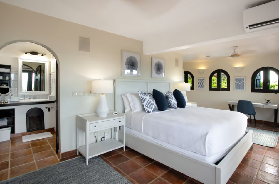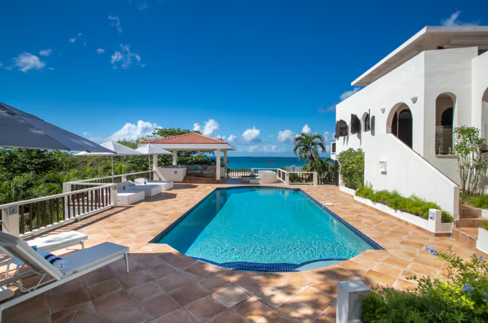 The mood of the villa is an elegant blend of classic French Creole and Moroccan design. Beautiful arches, wooden shutters and polished terracotta flooring add to the Mediterranean mood. The house is situated on multiple levels, adding to the private feel of the villa. It is a great place for families or groups of friends who love being together; yet desire places to be quietly private. The fabulous outdoor seating areas and cozy nooks flow along the various levels providing lots of opportunity to absorbed the beautiful Caribbean atmosphere and enjoy the stunning view. The large, beautiful pool sits at the edge of the view and the gardens. Surrounding the area are expansive terracotta terraces with open sun spaces plus covered gazebos for enjoying the view and sky.