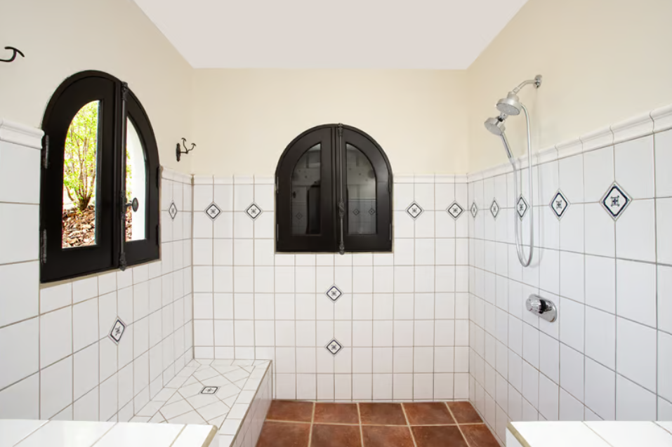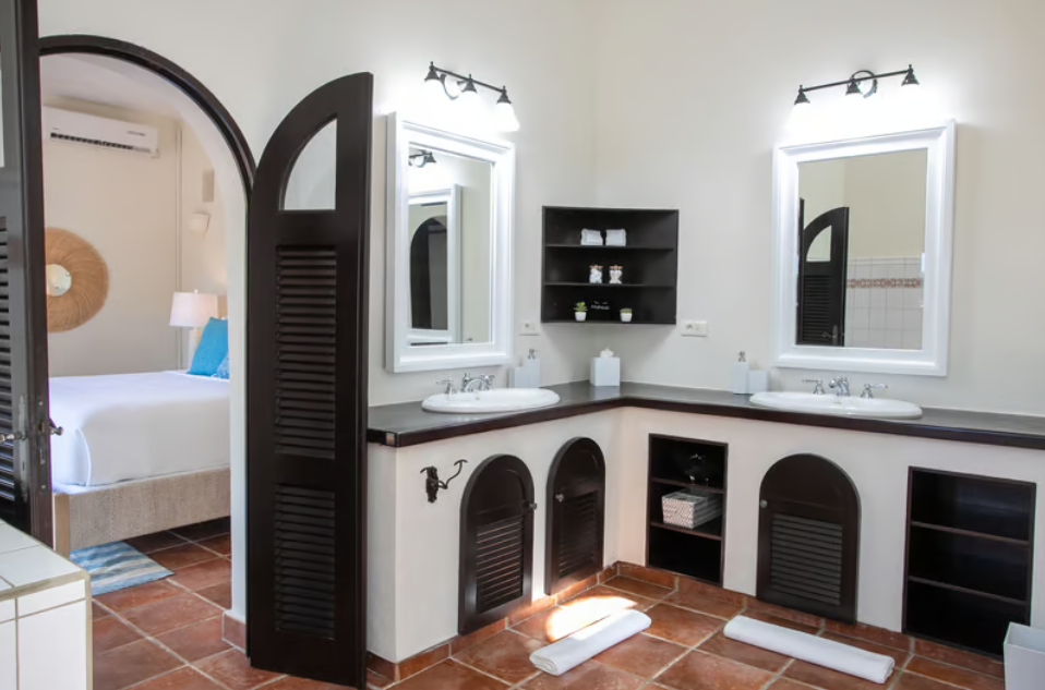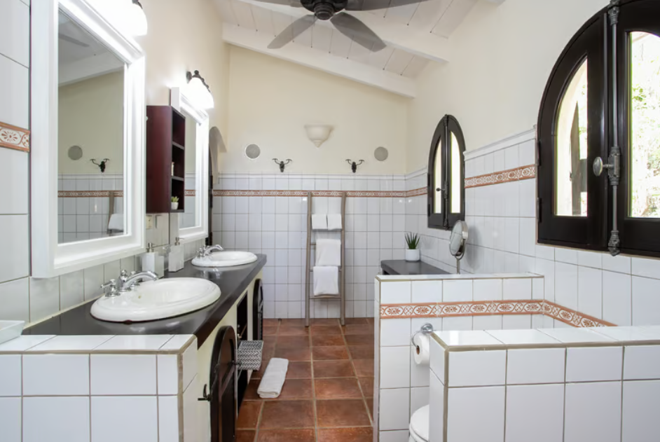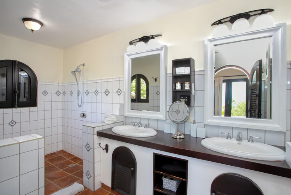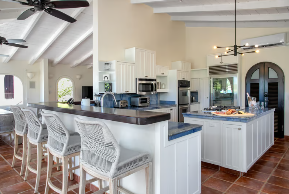 The mood of the villa is an elegant blend of classic French Creole and Moroccan design. Beautiful arches, wooden shutters and polished terracotta flooring add to the Mediterranean mood. The house is situated on multiple levels, adding to the private feel of the villa. It is a great place for families or groups of friends who love being together; yet desire places to be quietly private. The fabulous outdoor seating areas and cozy nooks flow along the various levels providing lots of opportunity to absorbed the beautiful Caribbean atmosphere and enjoy the stunning view. The large, beautiful pool sits at the edge of the view and the gardens. Surrounding the area are expansive terracotta terraces with open sun spaces plus covered gazebos for enjoying the view and sky.