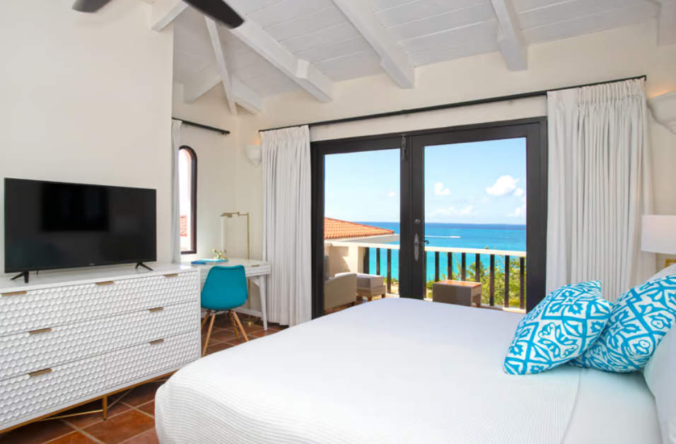 Nestled in a peaceful and private tropical garden, Joie de Vivre is an oasis away from the world. From every room and terrace you see the spectacular panoramic view filled with the azure Caribbean Sea, the blue tropical sky, the blue tiled pool and the silhouette of Anguilla on the horizon. For beach lovers, it also sits right on Baie Rouge Beach with direct access to the sandy shore.