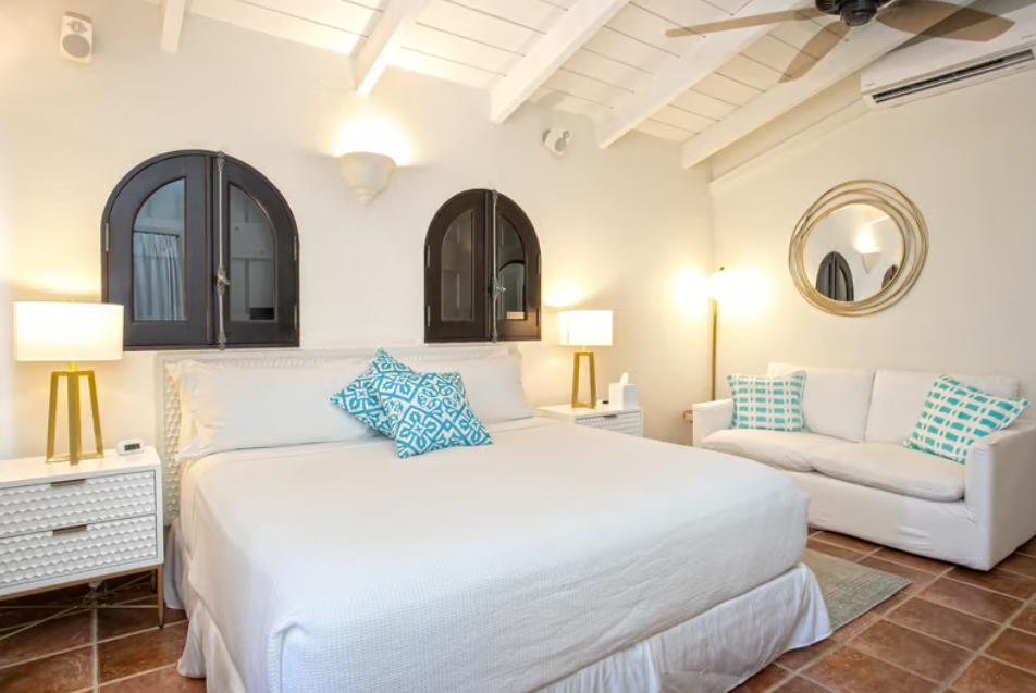 - Bedroom 1: King bed, private bathroom with shower, hairdryer, ceiling fan, AC, TV, DVD player