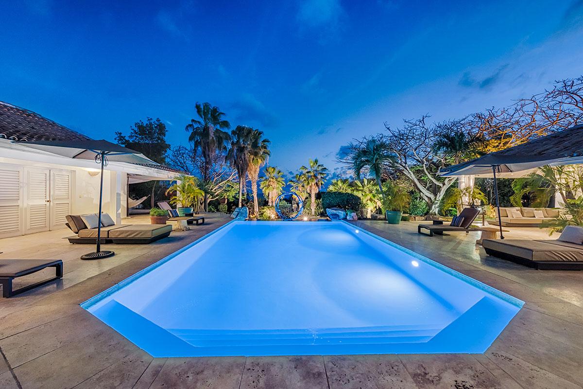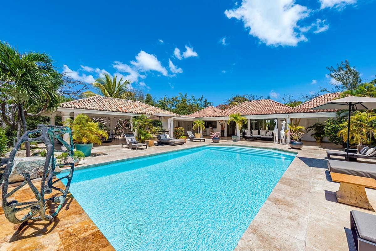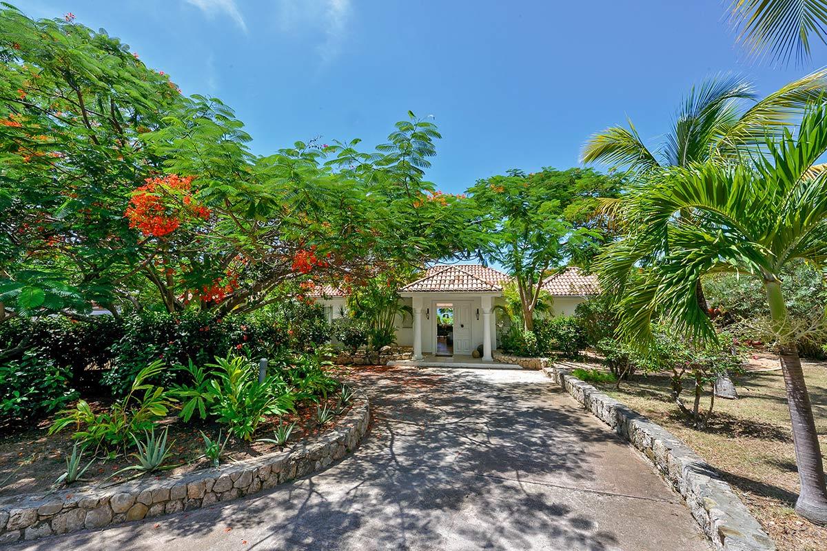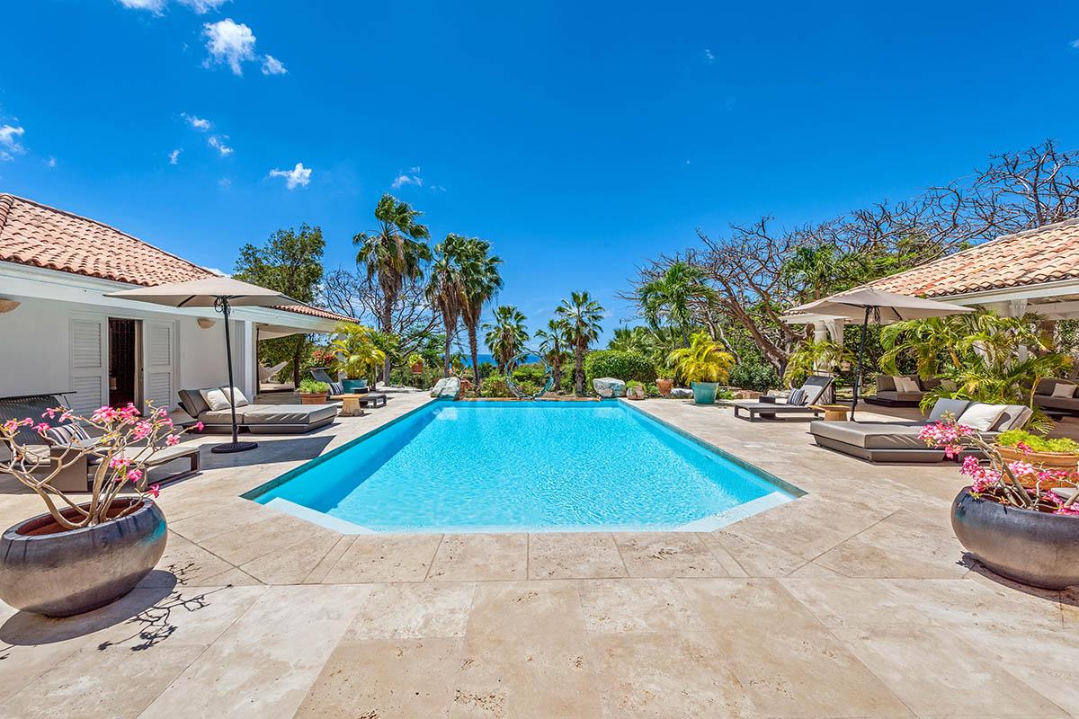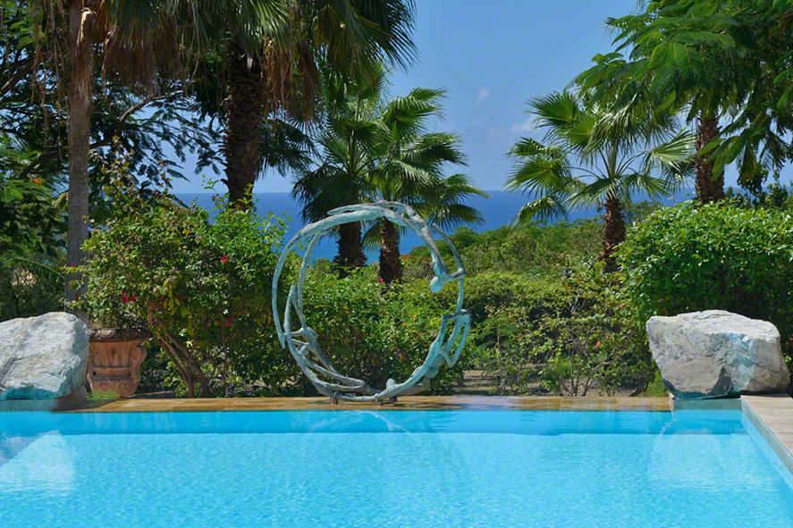 Down the long driveway lined with coral stone walls and flamboyant, you arrive in the courtyard of this elegant Creole style villa. La Pinta is a quiet, private oasis that sets the stage for relaxing outdoor living and a lush tropical view that begins the moment you enter the villa. The large turquoise pool, accented with a visually pleasing sculpture, draws your eye straight to the stately palms and beyond to the cerulean sea.