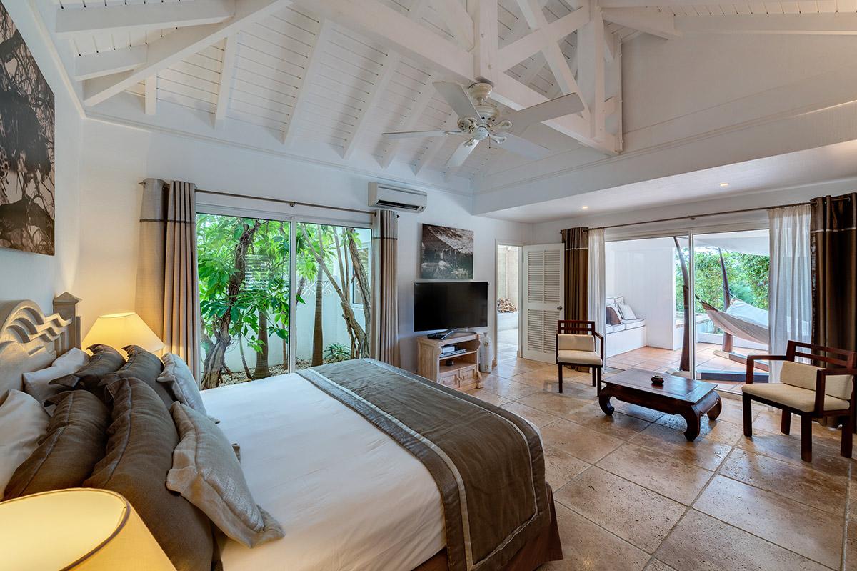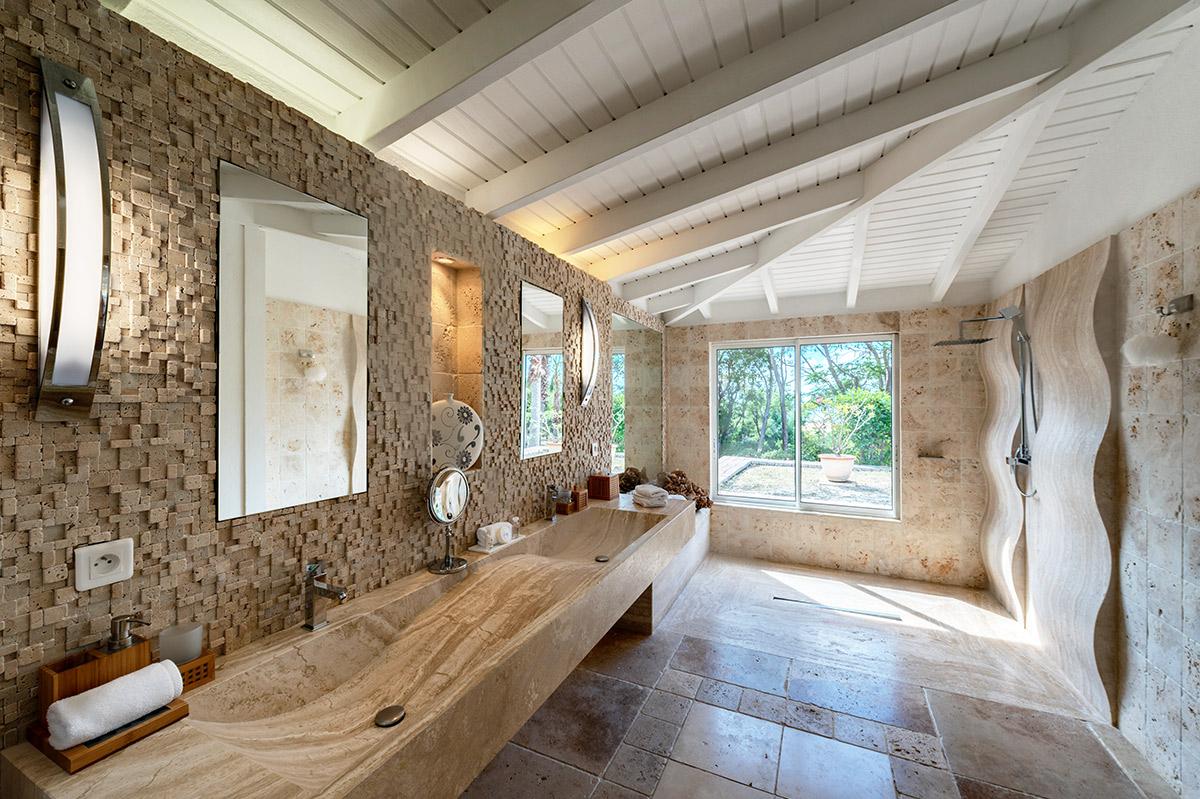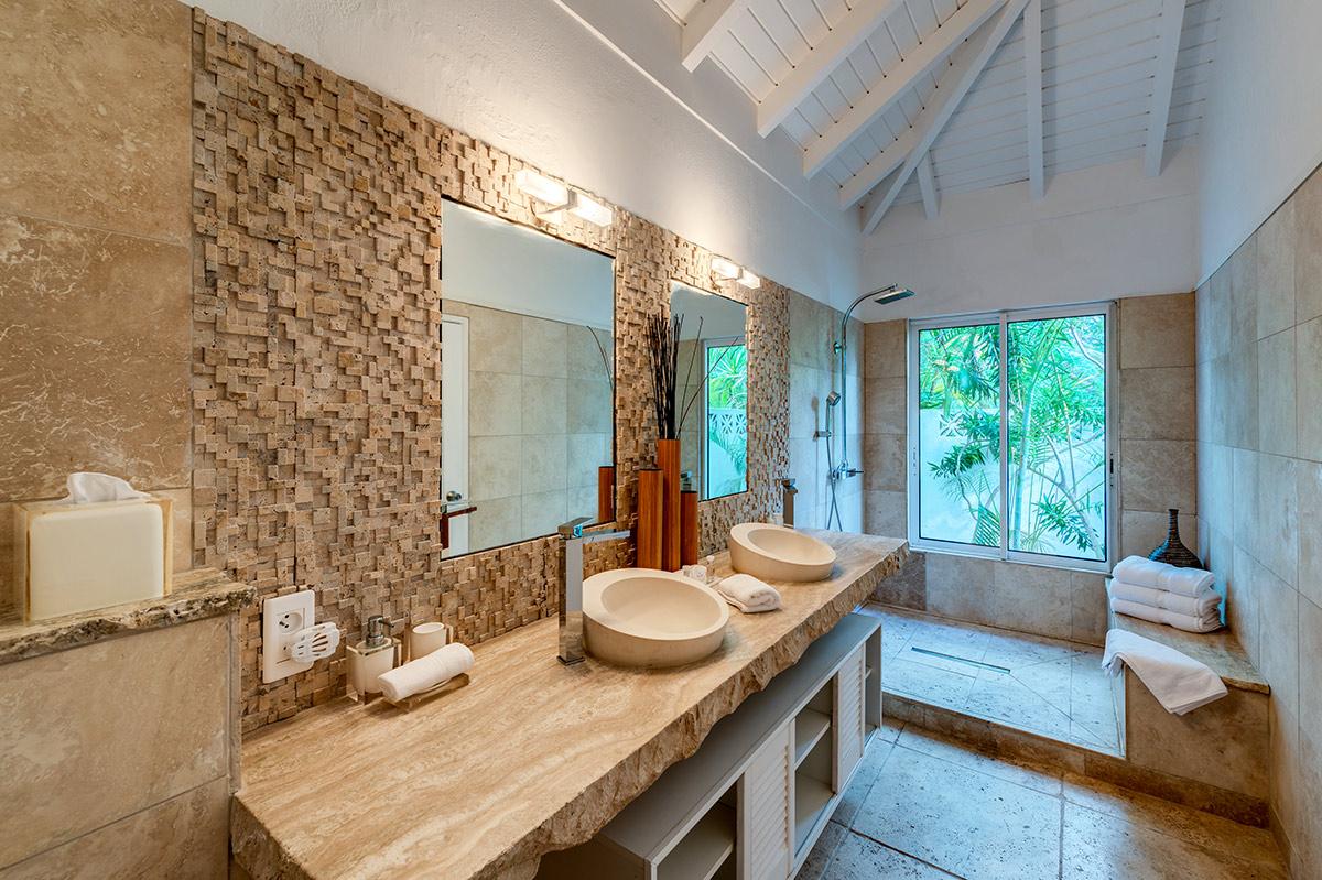 Four bedrooms are set off the pool terrace. The décor is in the mood of a luxe boutique hotel; elegant and serene, each room in a different, yet connective, rich neutral color palette; taupe, cream, charcoal, driftwood and metallic. The en suite bathrooms are works of art with travertine tiles, dark stone, marble countertops, sculpted sinks and beautiful fixtures. Several bathrooms overlook the gardens; one overlooks the sea. For larger gatherings, the sister villa, La Nina, shares the same lot and provides an additional two bedrooms. The two also share a tennis court and gym.