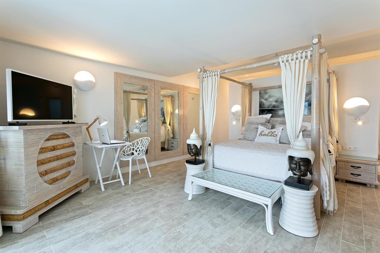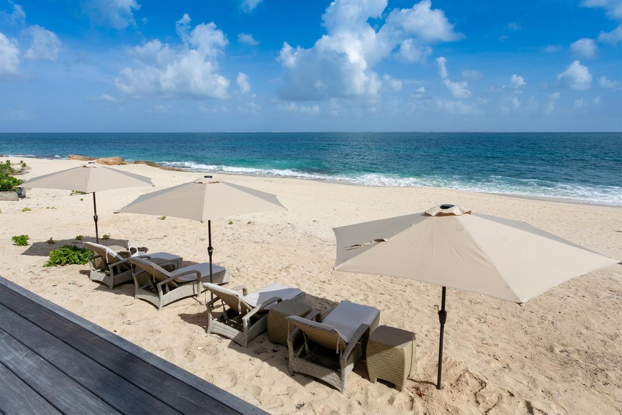 Guests can descend from the pool terrace to the white sandy beach which also has a pool, a shaded gazebo, seating area, daybeds and parasols furnishing the shoreline.