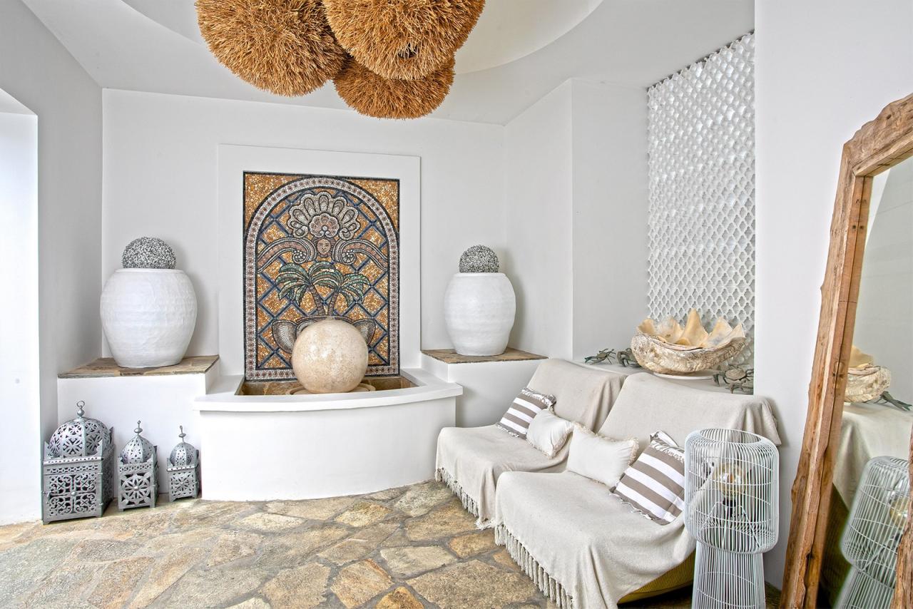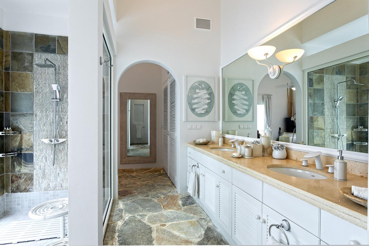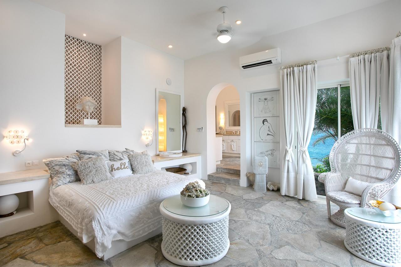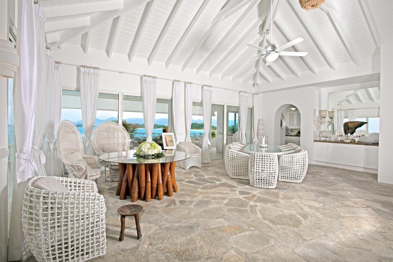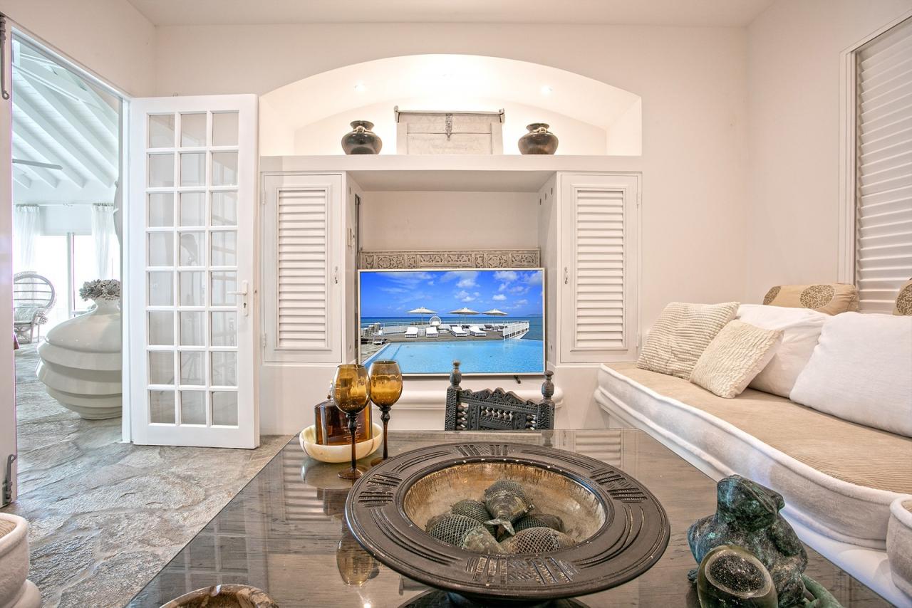 The main entrance invites guests into a domed reception area and large double doors lead to the grand living area. High ceilings and natural stone floors create a cool and refreshing contrast to the tropical climate outdoors. The living area makes the most of the cooling ocean breezes, the entire room also benefits from air-conditioning if desired. L'Oasis also offers comfortable lounge areas, a large indoor dining table with seating for 10, and an adjoining media room with a widescreen TV, surround sound, and more seating. There is wifi throughout the entire property.