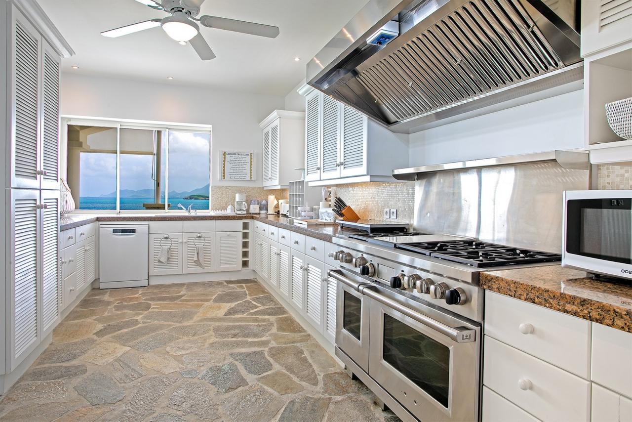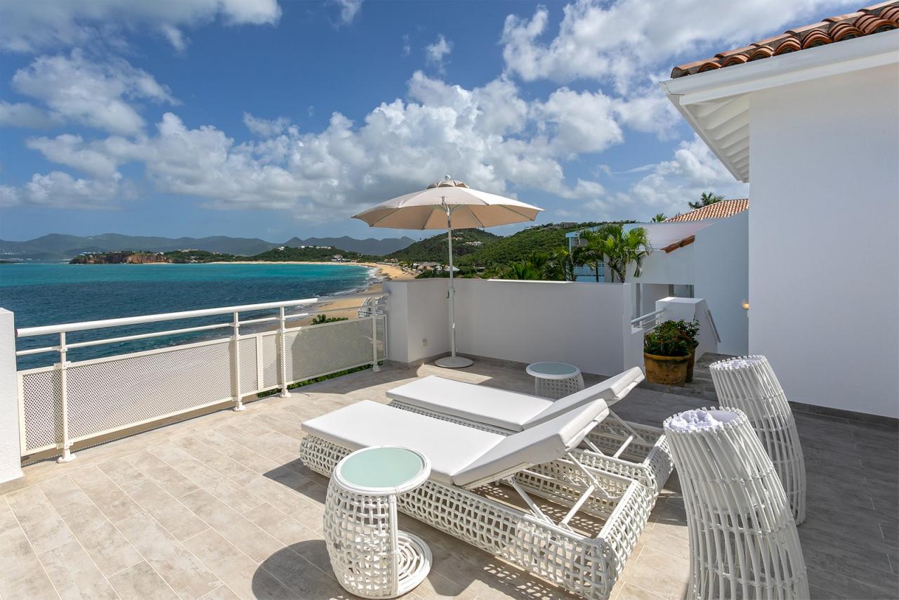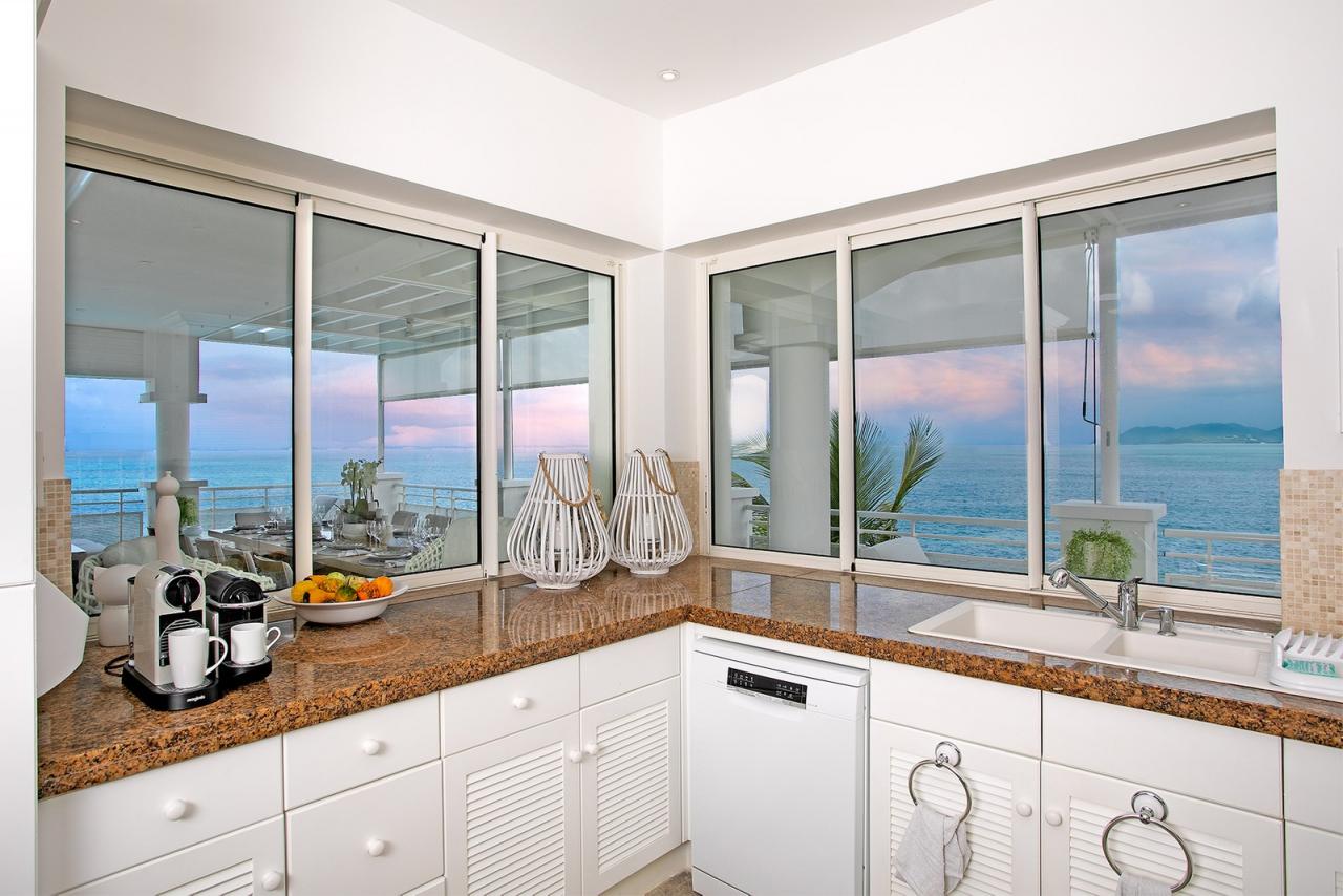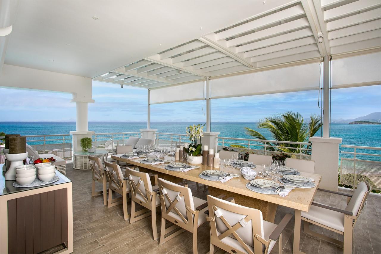 L'Oasis has a large covered terrace which offers a further dining area for 12 and a beautiful ocean backdrop. Adjacent to both of the dining areas is a spacious gourmet kitchen. Large windows offer a beautiful view of the ocean.