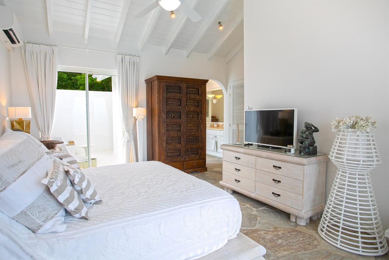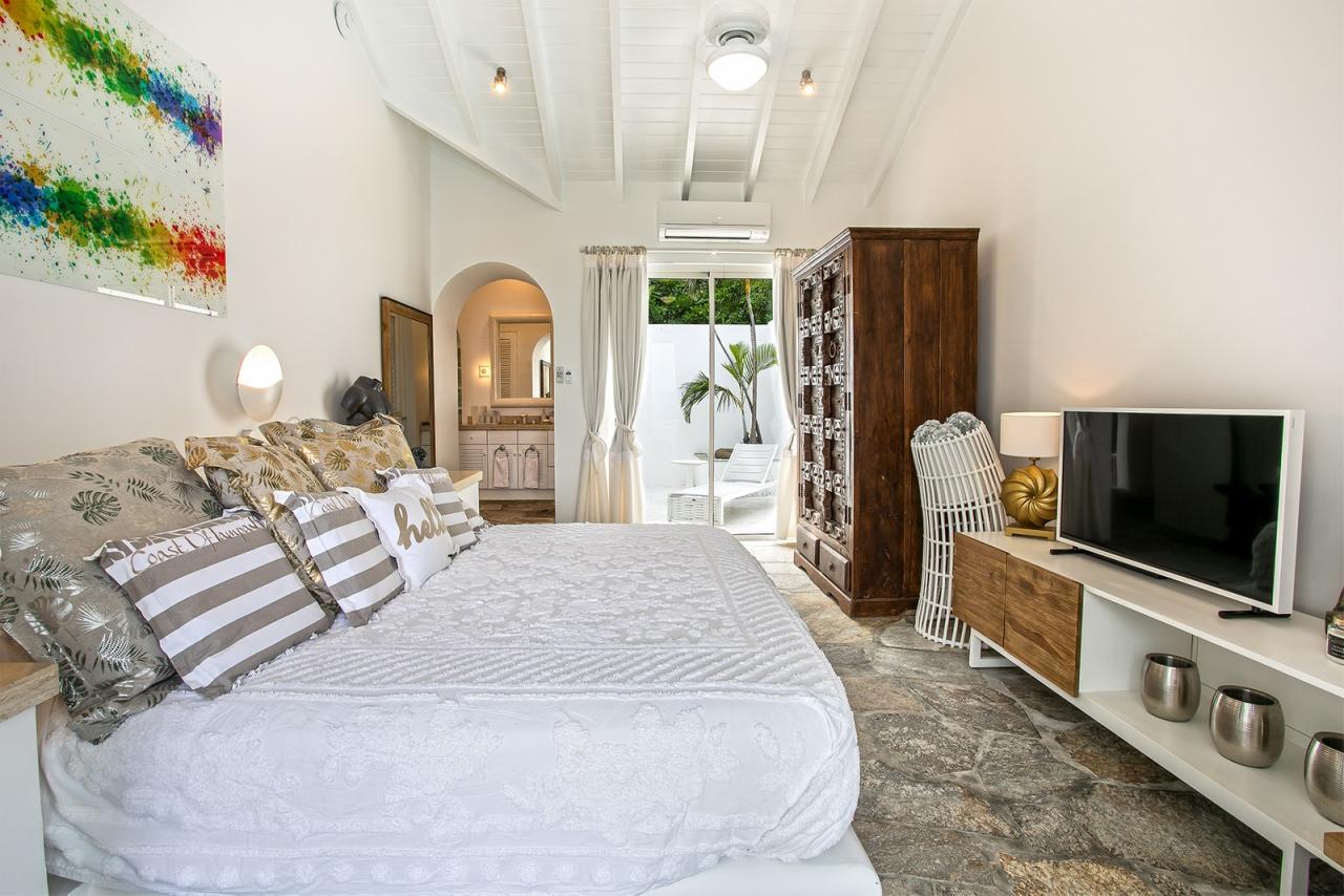 Bedroom 5: This room is equipped with a king-sized bed, an ocean view, a fan, air conditioning, a TV, a safe, and an ensuite bathroom.