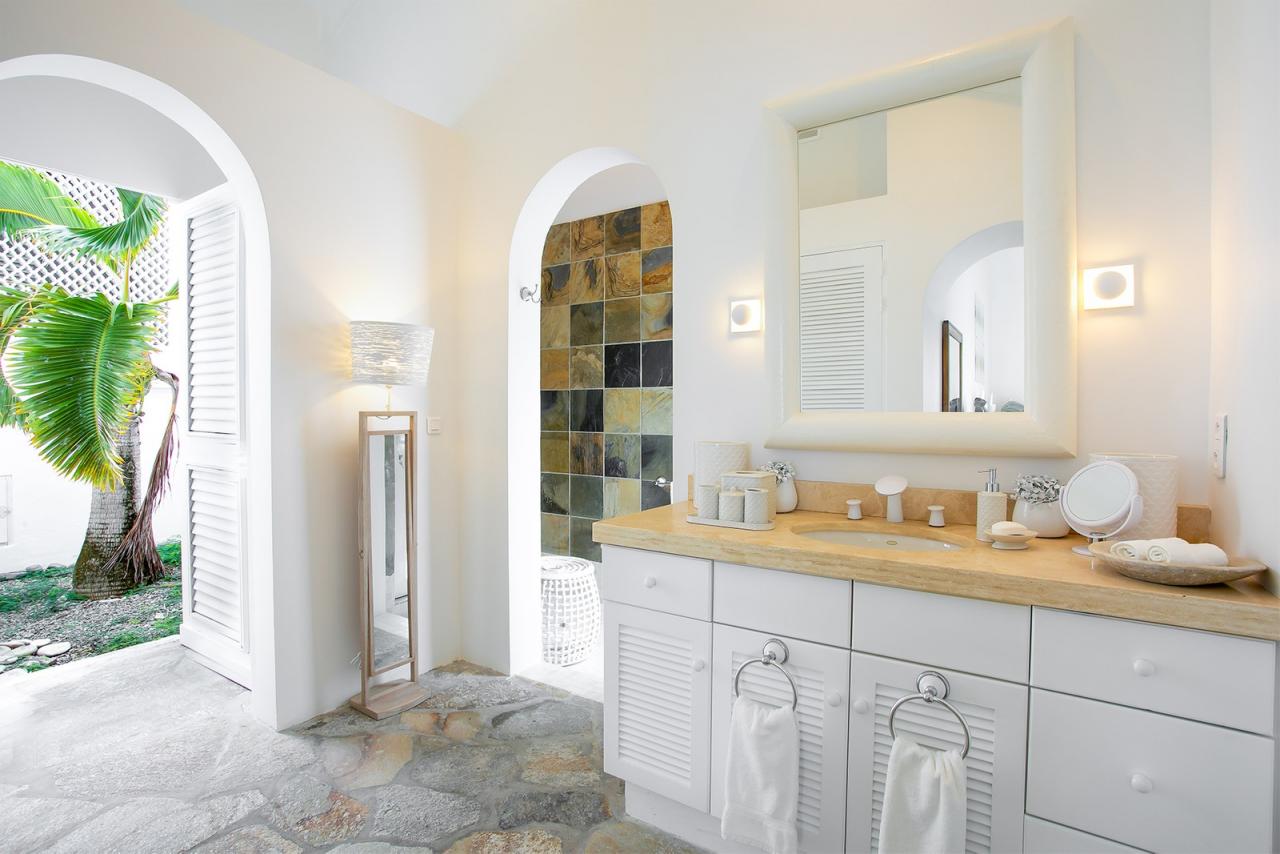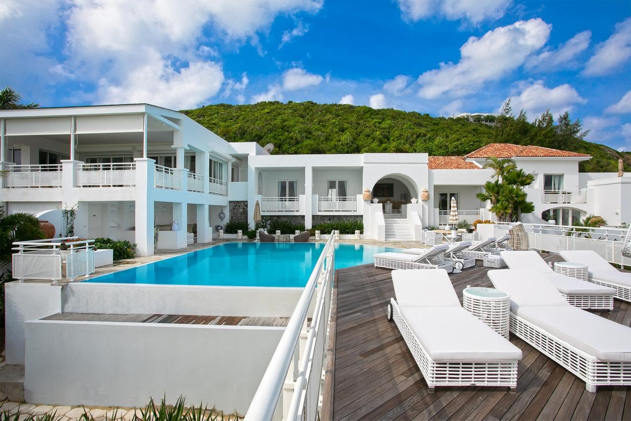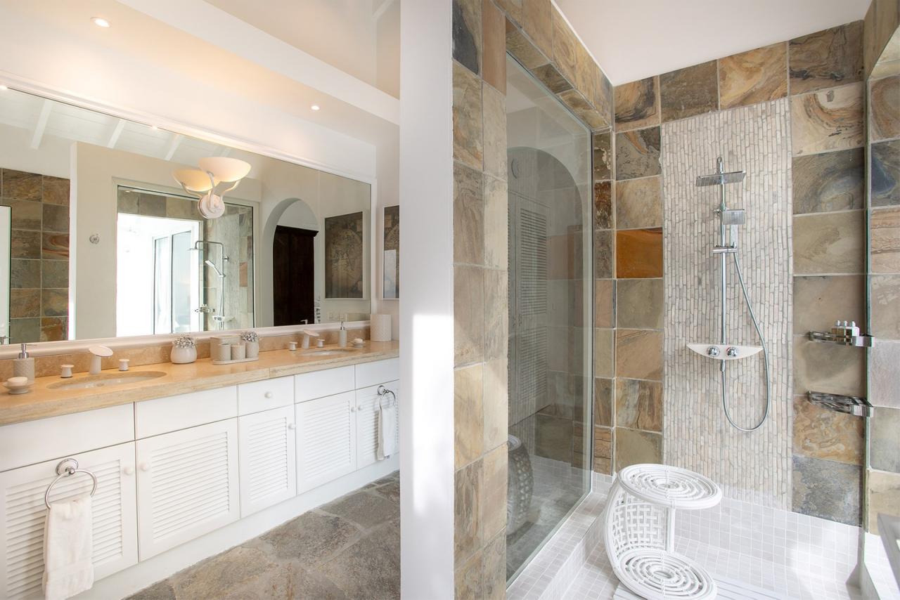 Main Pool by the House has a very large deck, many lounge chairs, stone table and chairs for pool side dining, umbrellas and full music system . The full SPA features a gym room equipped with Multi-Station Universal, a Tread-mill, an Elliptical, Free Weights, Plasma TV, Sound, an exterior Jacuzzi, a Massage room with two tables, a Manicure/Pedicure area, a Bathroom with Steam room, Shower and Toilet . To Marigot: 12 min. drive To Nearest Grocery Store: 5 min. drive To Beach: Out the door to Baie Rouge.