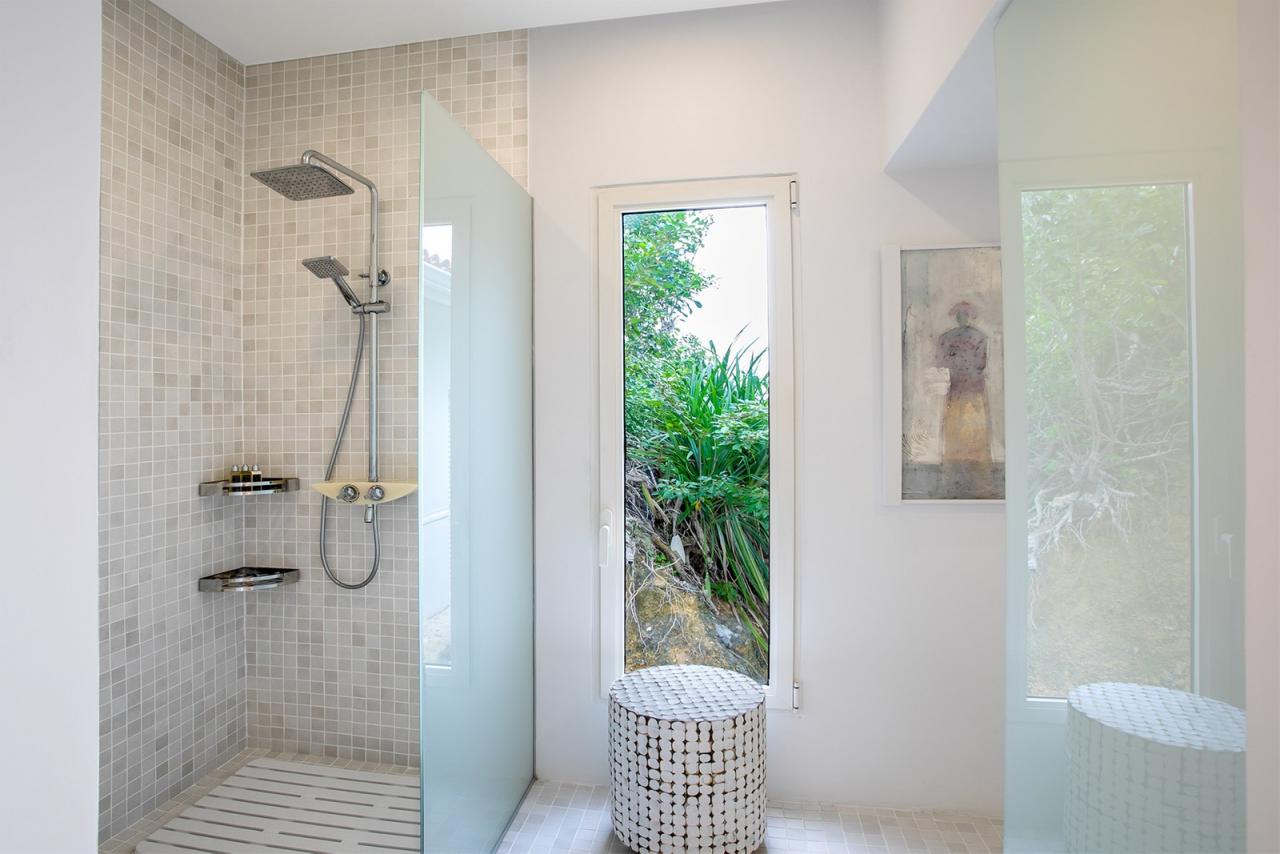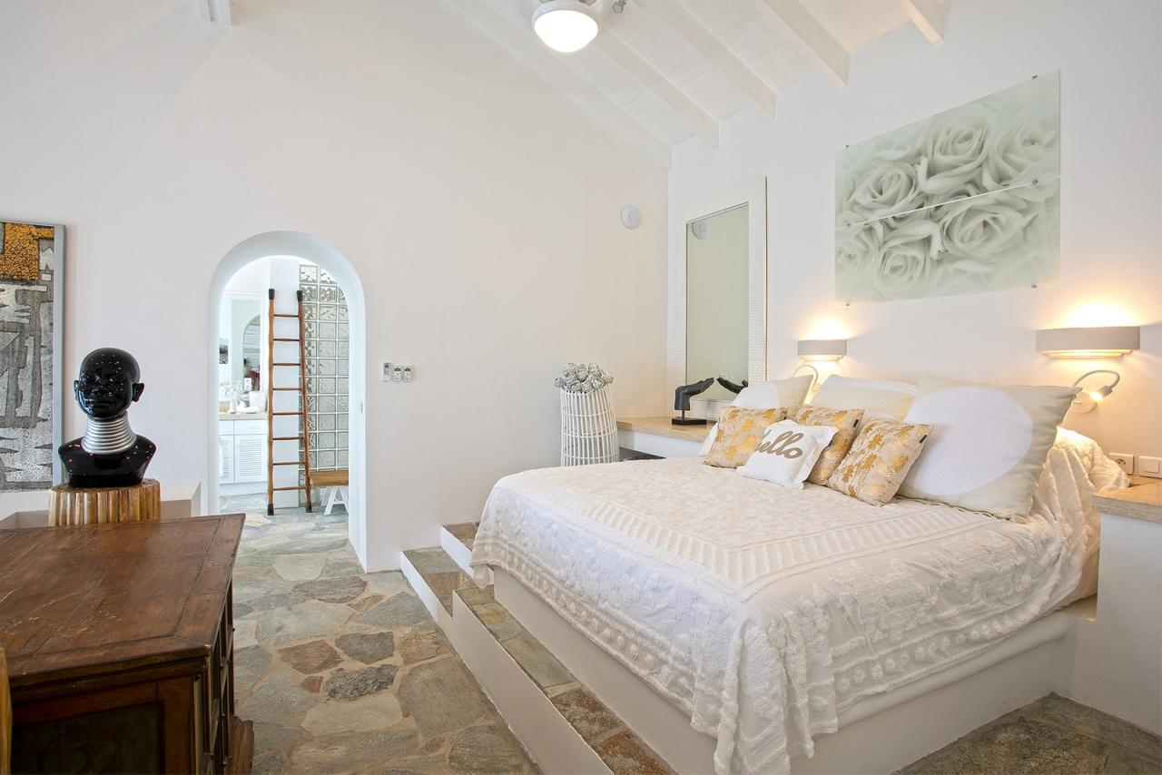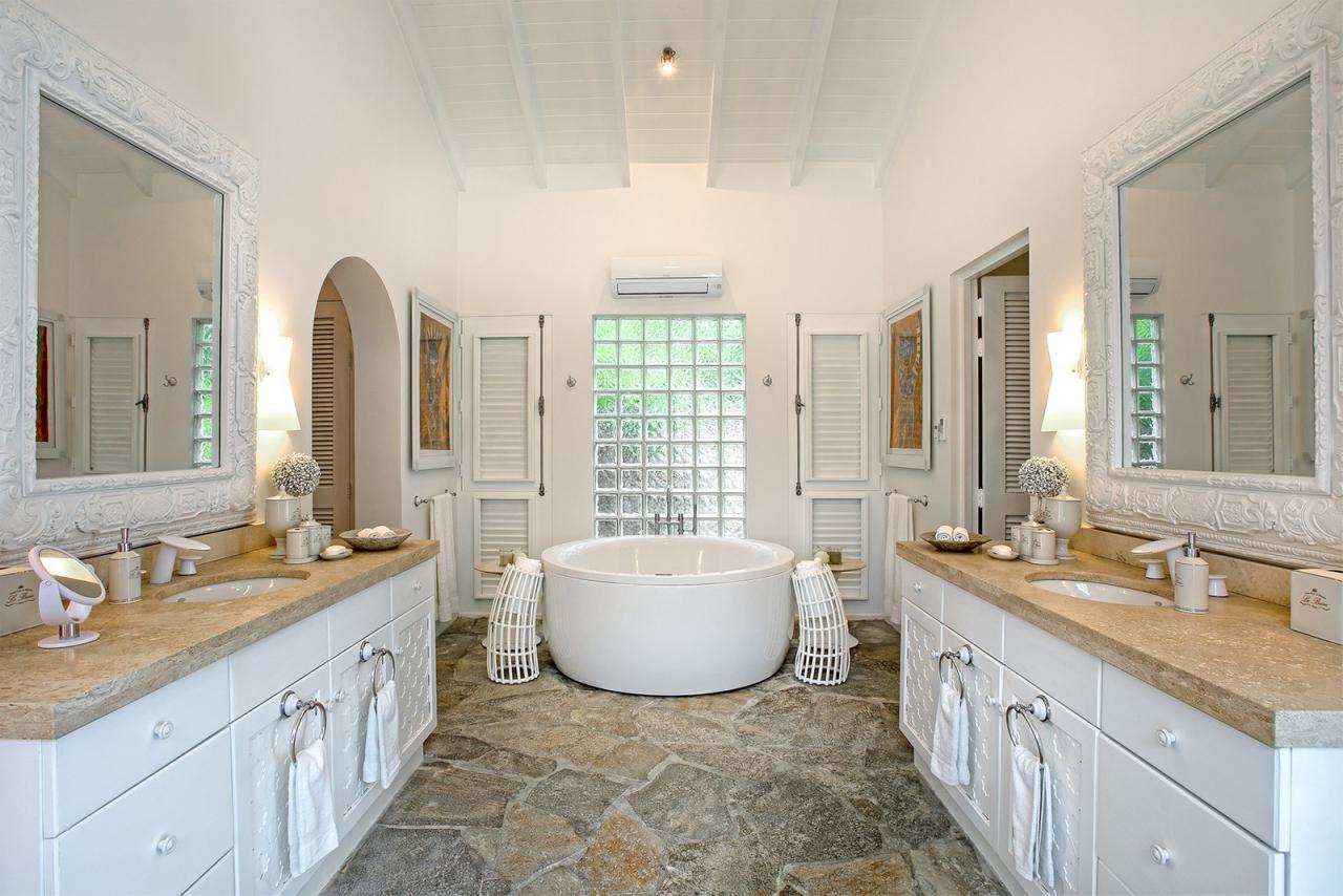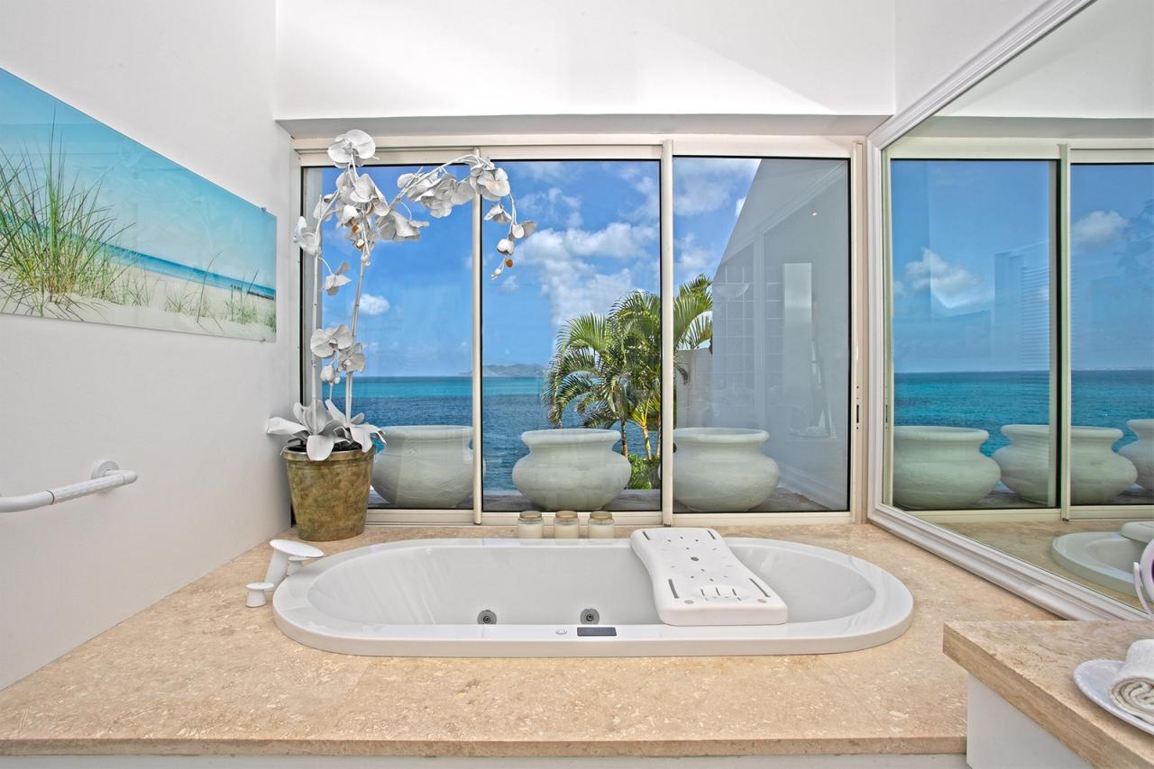 Main Pool by the House has a very large deck, many lounge chairs, stone table and chairs for pool side dining, umbrellas and full music system . The full SPA features a gym room equipped with Multi-Station Universal, a Tread-mill, an Elliptical, Free Weights, Plasma TV, Sound, an exterior Jacuzzi, a Massage room with two tables, a Manicure/Pedicure area, a Bathroom with Steam room, Shower and Toilet . To Marigot: 12 min. drive To Nearest Grocery Store: 5 min. drive To Beach: Out the door to Baie Rouge.