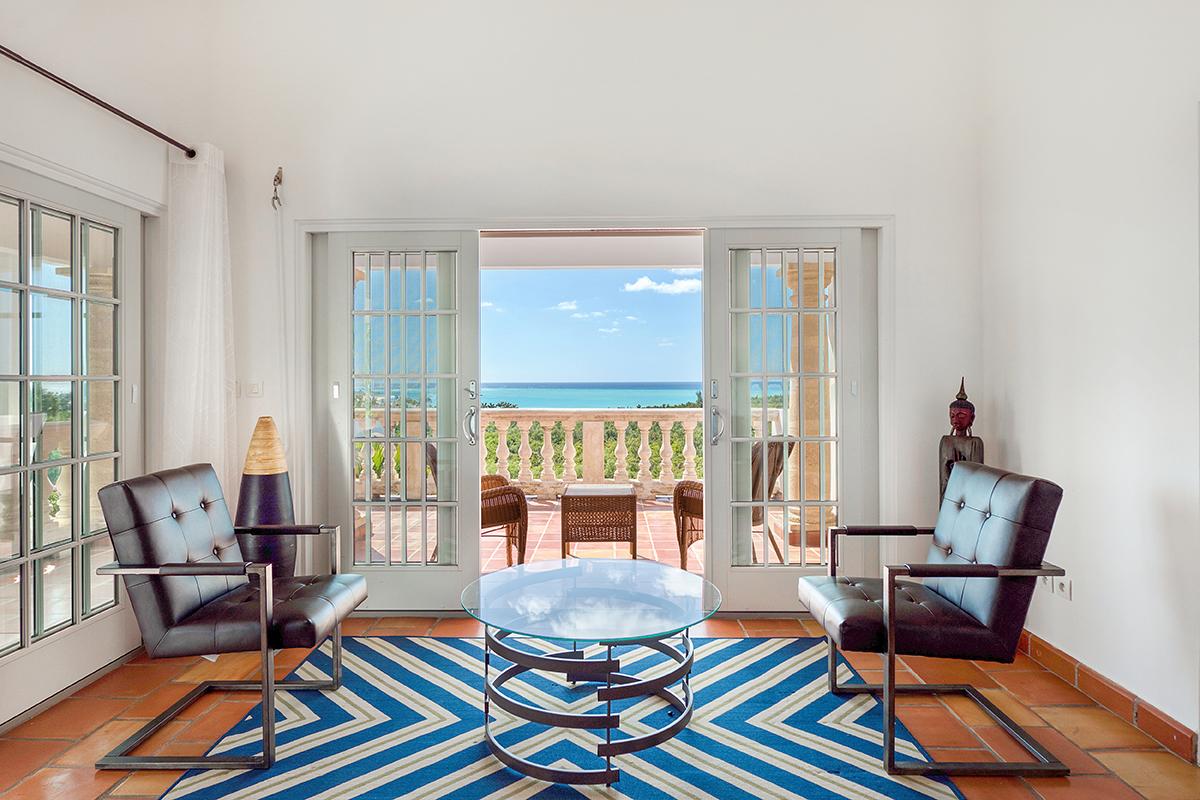 The four exterior access bedrooms are equal size and air conditioned. Two are placed at each end of the villa; one upper and one lower. The décor in each room is filled with airy, romantic style heightened by high vaulted ceiling and wicker, rattan or dark wood tropical furnishings accented with white and cream fabrics. Every room has sea or pool views plus private terraces and interior seating. The bathrooms are uniquely decorated in richly colored traditional tiles and sinks from Provence. From the oversized double showers, you view the ocean and gardens.