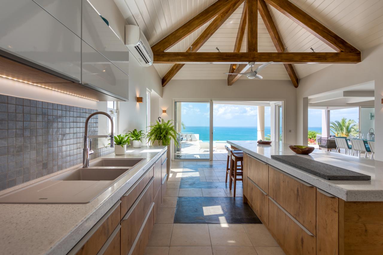 A striking blue ocean vista awaits you as soon as you step through the main entrance of the ground floor into a light-filled living space with large glass sliding doors stretching the entire length of the room and opening out to a large pool and flower-lined sun terrace. Calming aquatints and natural wood accents feature throughout the house. A large dining table takes center stage of the living area. A very well-equipped and beautiful light wood kitchen makes for convivial mealtimes for large families or groups of friends. There are comfortable seating areas both within the air-conditioned living room and also in the lounge area of the outside covered terrace, just to the right of the pool. The terraced gazebo makes for an ideal spot for sunset lounging. There is a sunken living area with a TV, just off to the right of the main living space.