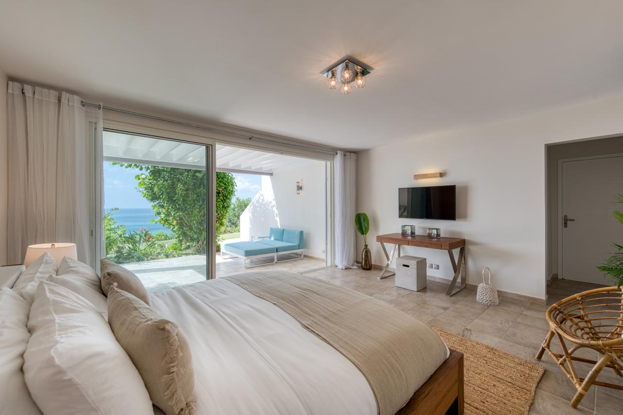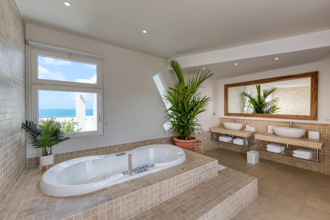 Overlooking the living room, the upper mezzanine level offers a fitness room and houses the third bedroom with en-suite bath and a private rooftop terrace with a sunbed. Two staircases descending from the pool terrace lead you to the three remaining bedrooms. Each bedroom has its own terrace with an ocean view and an en-suite bathroom with an open shower. Two of the bedrooms are connected by a door which is ideal for families with young children.