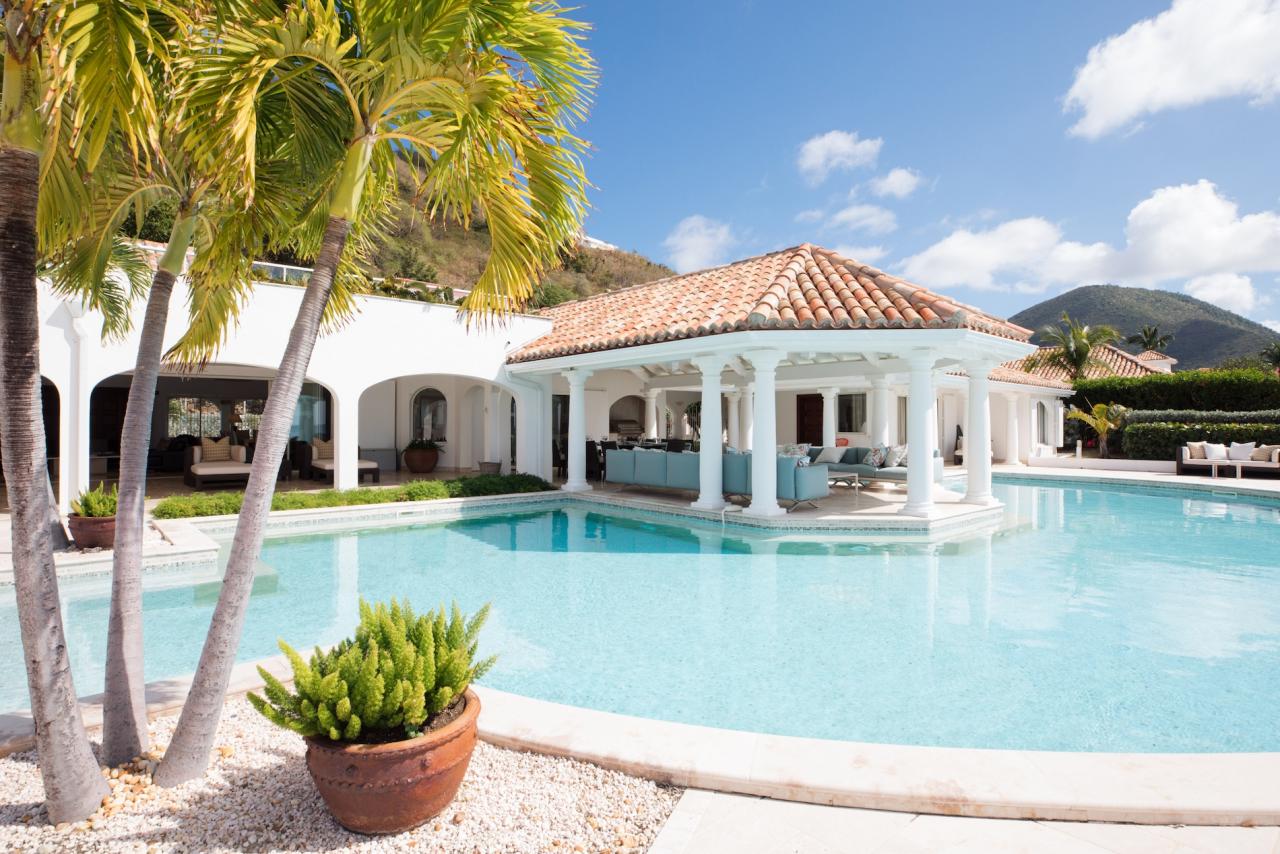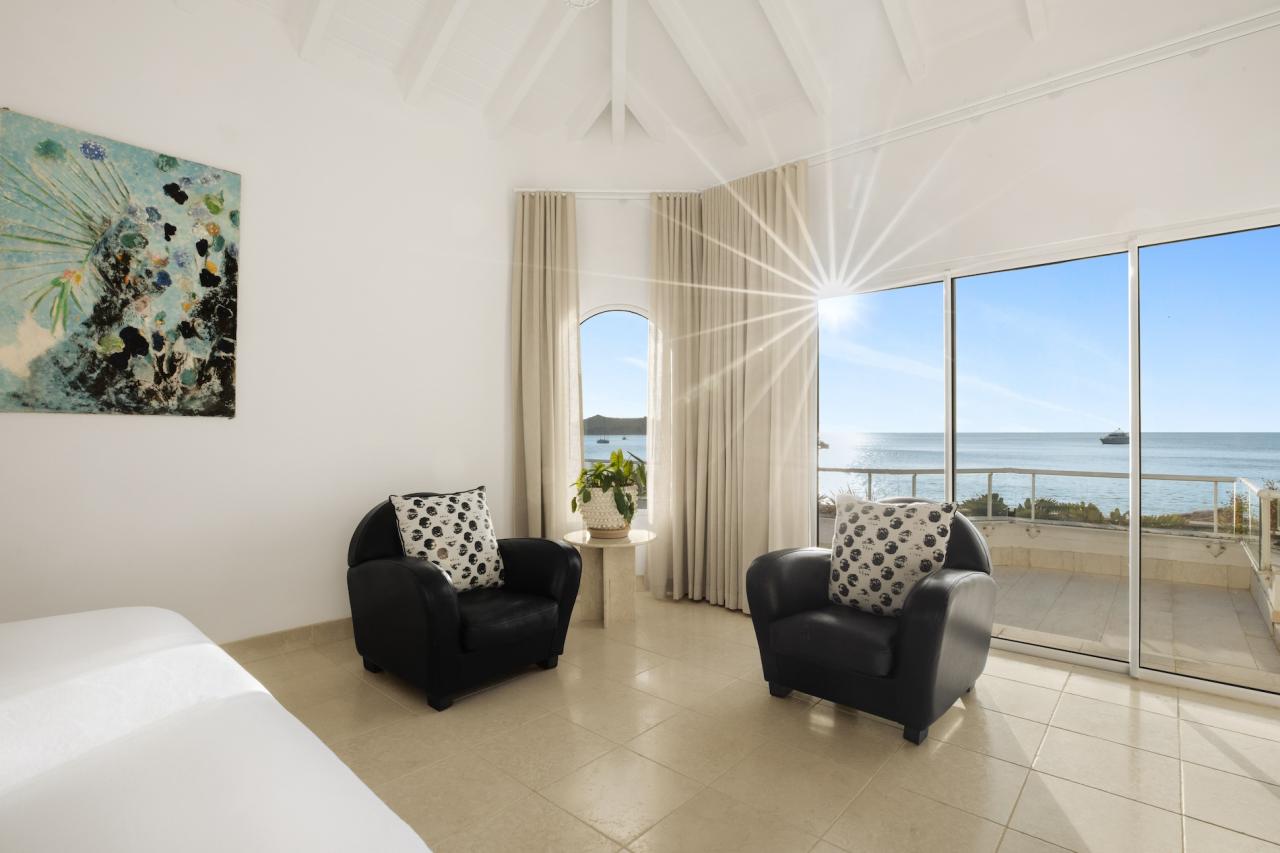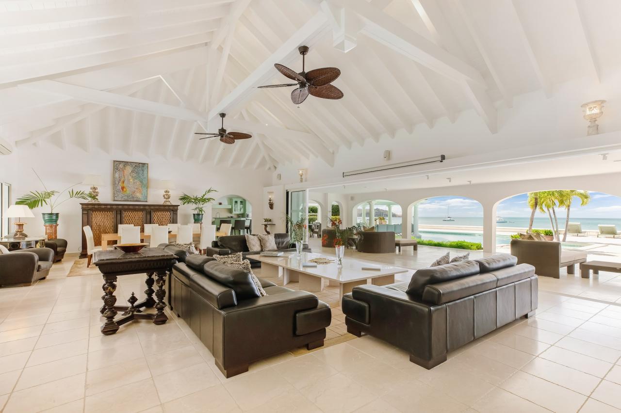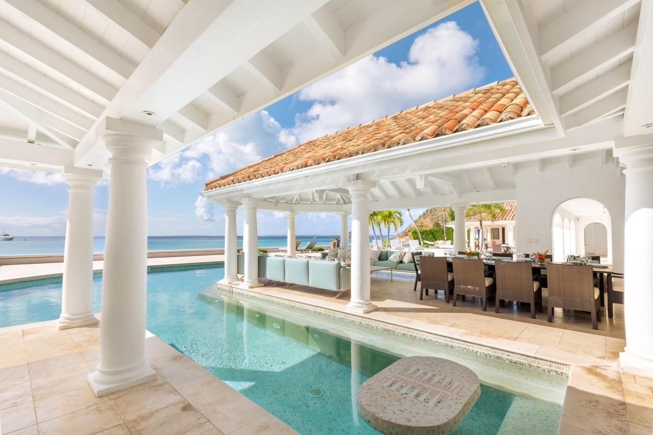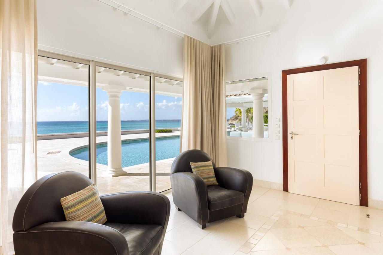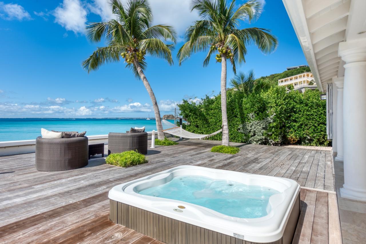 On a small private road at the far end of Grand Case is Petite Plage 4, an oasis of beauty and tranquility overlaid with an eclectic blend of contemporary and opulent style. The exotic entrance is lined with palms and tropical foliage and flanked by Moroccan arches and ironwork. The hand carved double door opens wide to the amazing view accented with palms and the pool. You are at the ocean’s edge - before you the Caribbean Sea, the tropical sky and Anguilla. Within your view is the curve of Grand Case Bay.