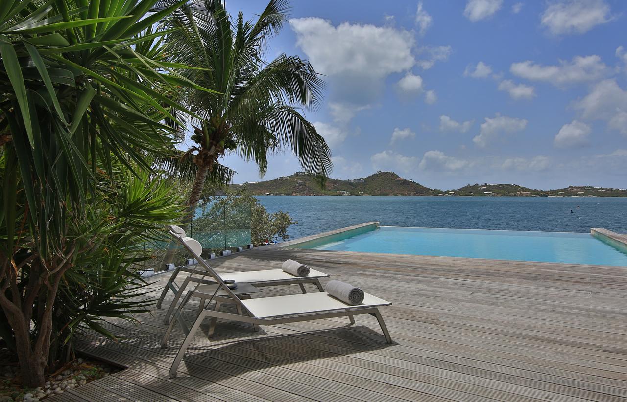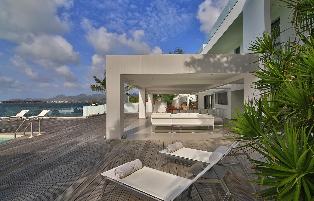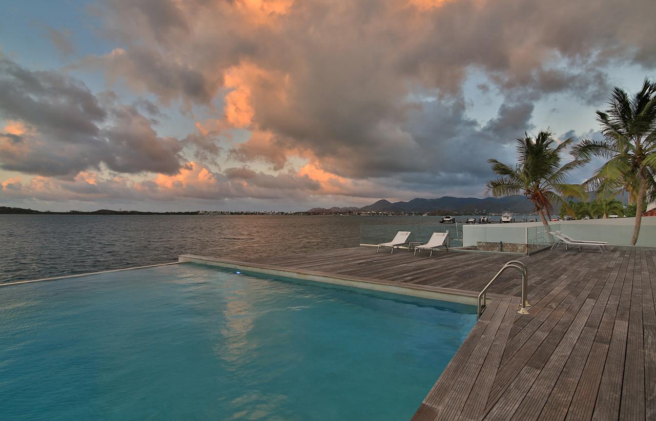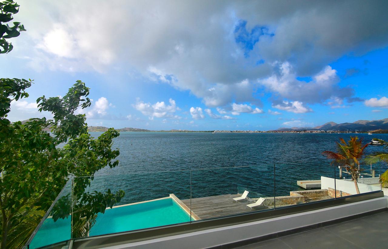 The Reef is a beautiful 5 bedroom contemporary villa, superbly positioned on the Simpson Bay Lagoon on the Dutch side of the island of St. Martin/St. Maarten. The villa has its own private boat dock and an amazing lounging terrace with very private exterior living areas and a beautiful waterfront, infinity edge, salt-water pool.