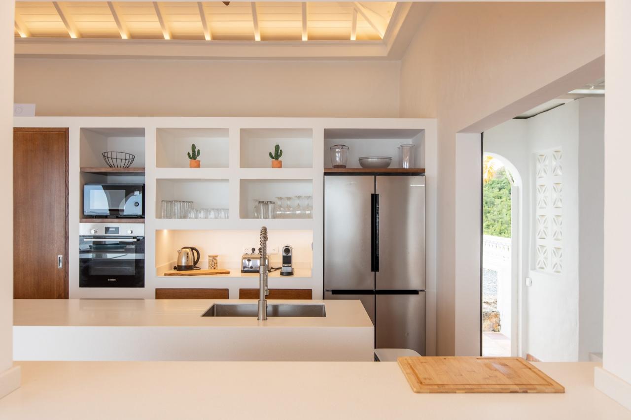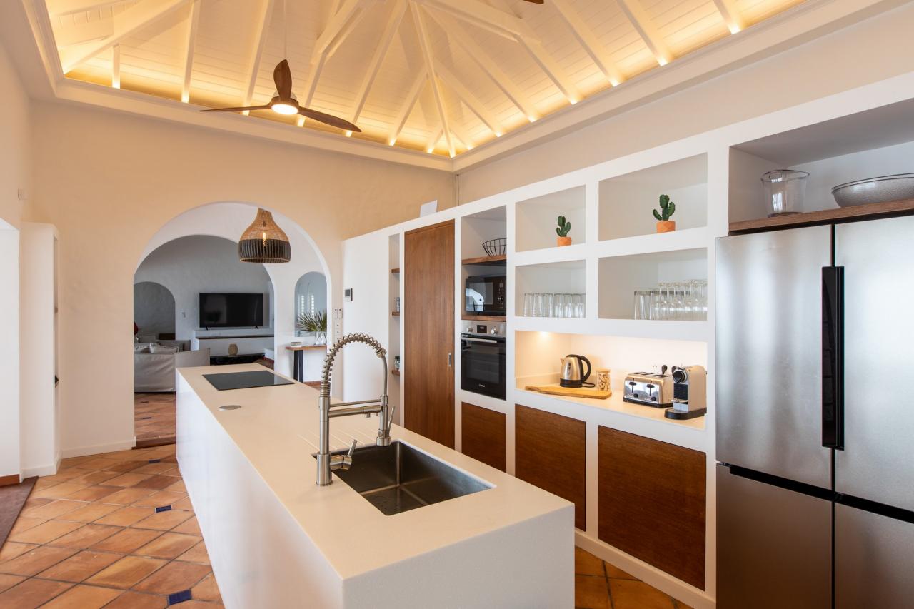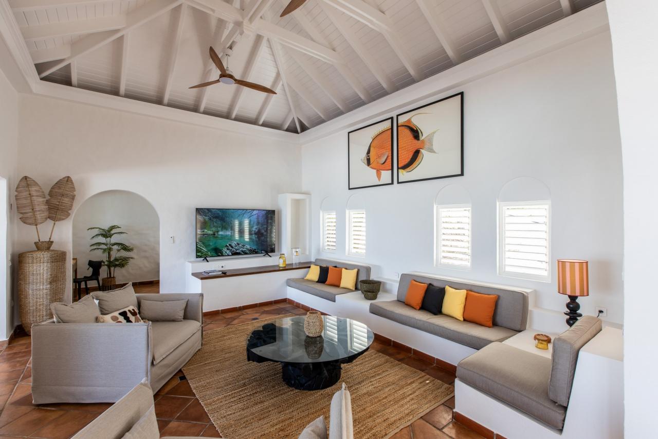 Spread across two levels, Villa Agama features spacious accommodations with five king-sized bedrooms, each equipped with refined en-suite bathrooms and smart TVs for added comfort. The main level houses three bedrooms near the open-concept kitchen and living room, while two additional bedrooms are located on the lower level, offering privacy and serenity. The living area, adorned with contemporary furnishings, exudes warmth and sophistication, perfectly complemented by a fully equipped kitchen that allows guests to prepare gourmet meals while taking in panoramic ocean views.