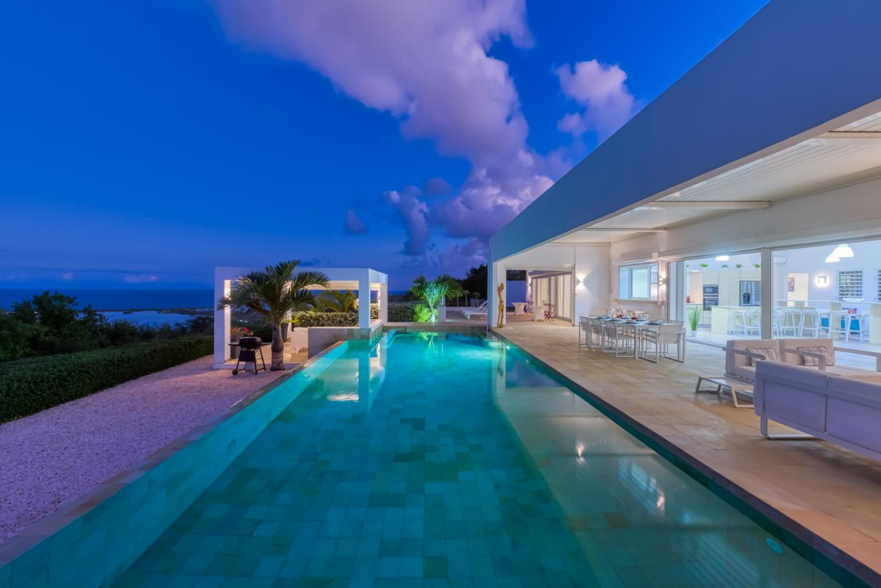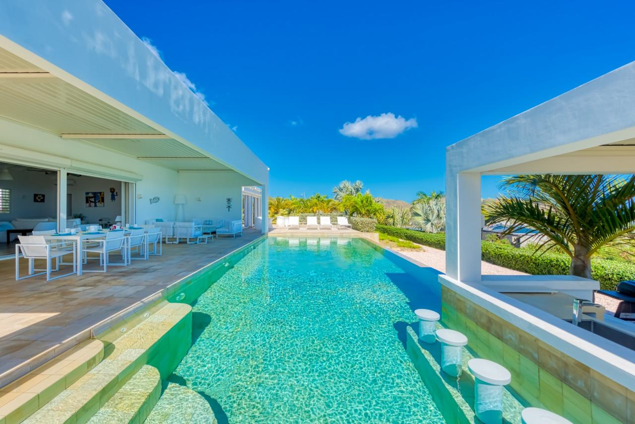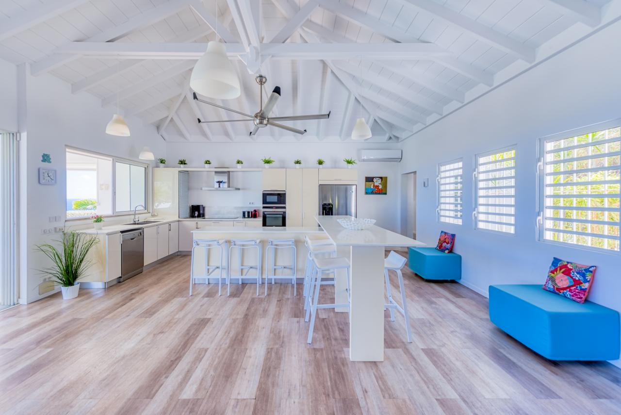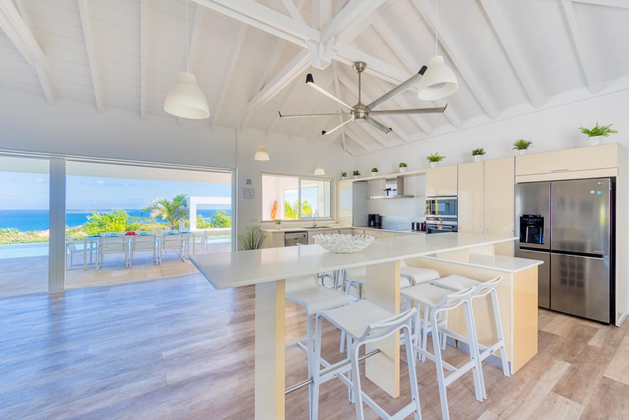 Villa Albacore is a modern home located in the heights of Orient Bay in St. Martin. This gorgeous St. Martin villa has four bedrooms all with their own ensuite bathroom. The villa is equipped with a gourmet kitchen, a living room stocked with various board games, an infinity pool, and wonderful views of both the sea and the surrounding islands.