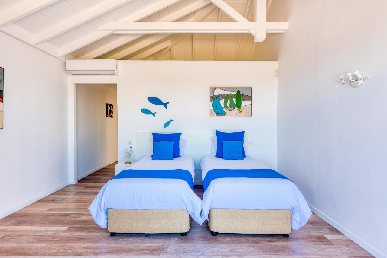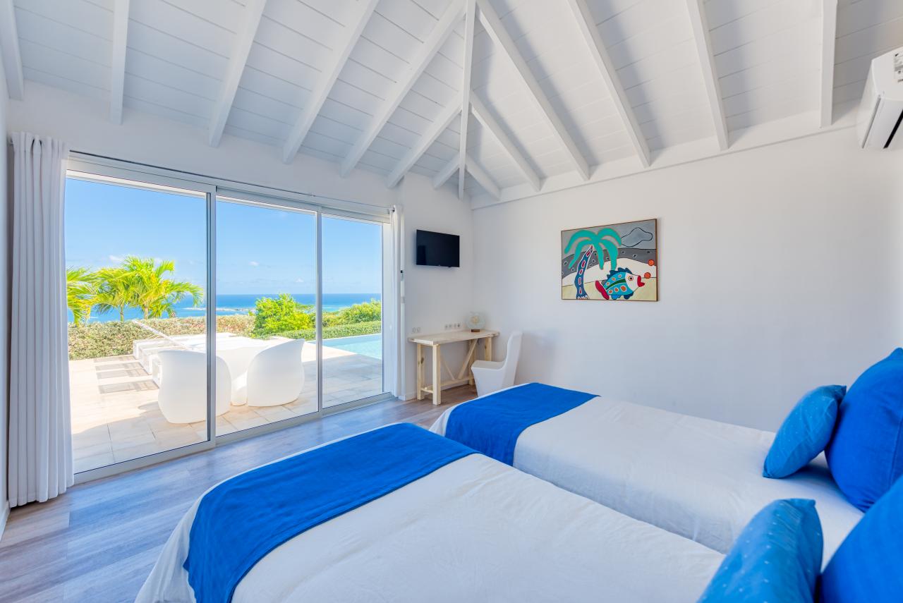 Bedroom 3: This bedroom has two twin-sized beds, TV, air conditioning, a safe, and an ensuite bathroom. The room is equipped with an ocean view.