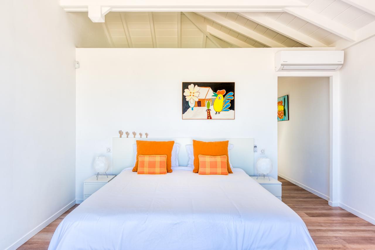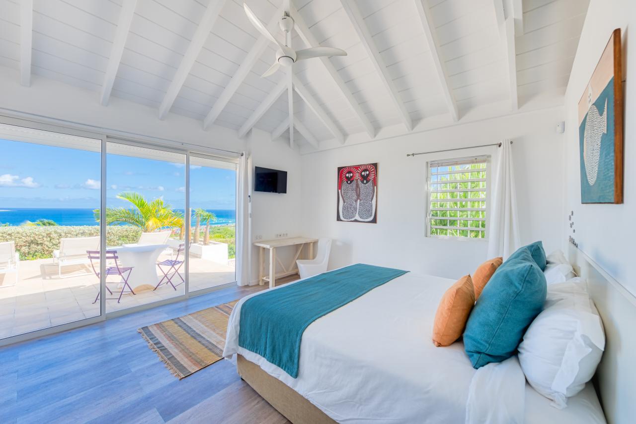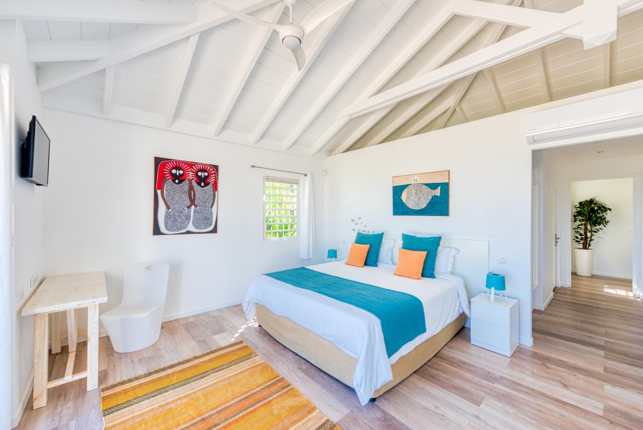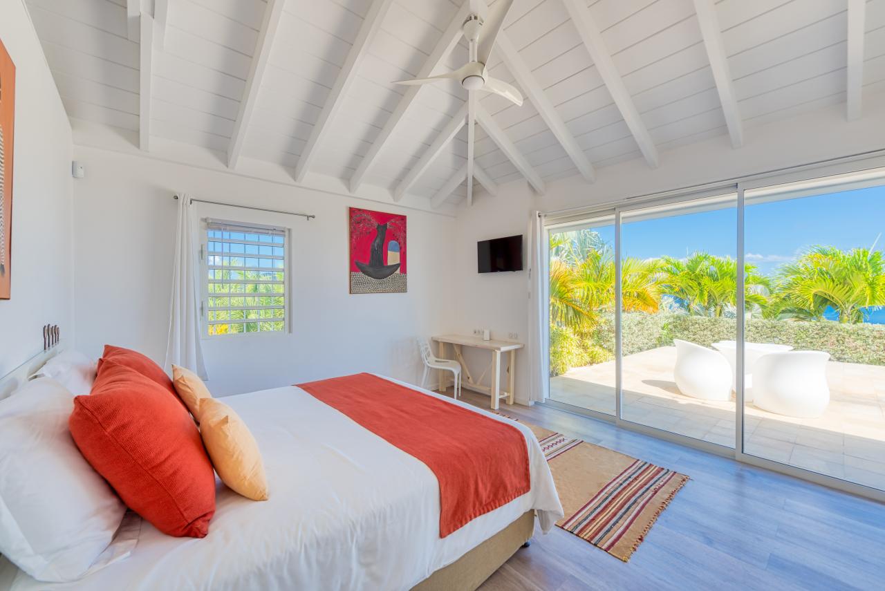 Bedroom 1: This bedroom has a king-sized bed, TV, air conditioning, a safe, and an ensuite bathroom. The room is equipped with an ocean view.