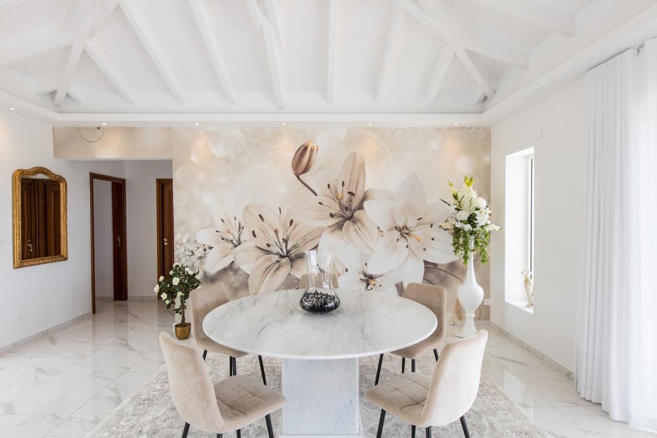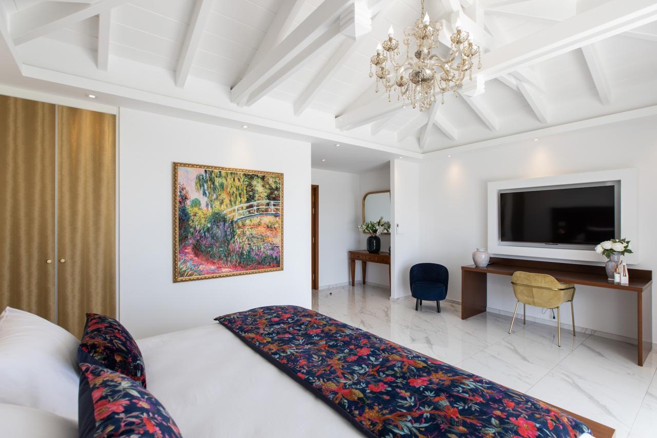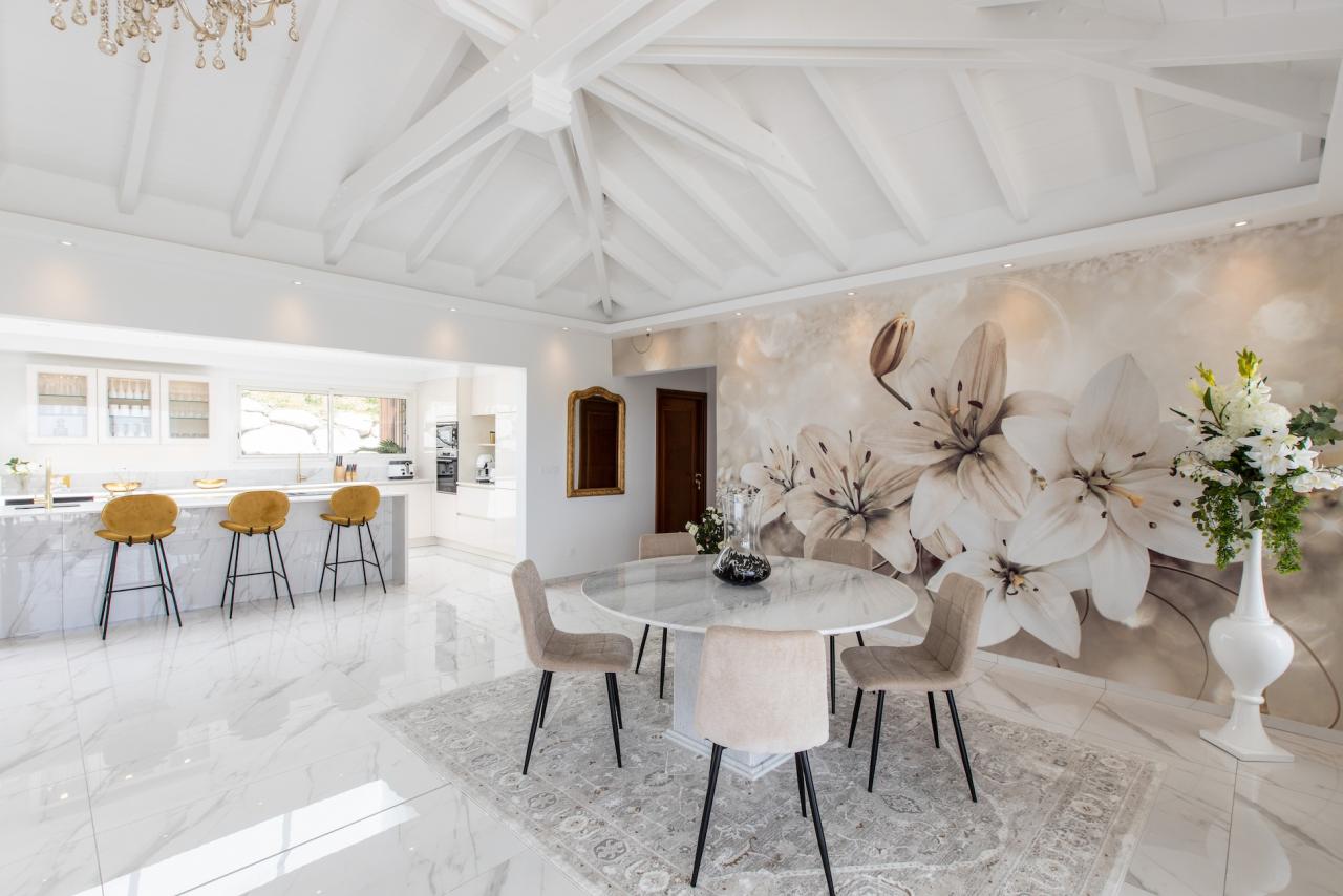 Villa Fleurs de Lys' interior harmoniously blends classic French luxury and contemporary elegance, adorned with modern art pieces that enhance its sophisticated ambiance. Luxurious fabrics, fine furnishings, and intricate detailing create an atmosphere of opulence and refinement.