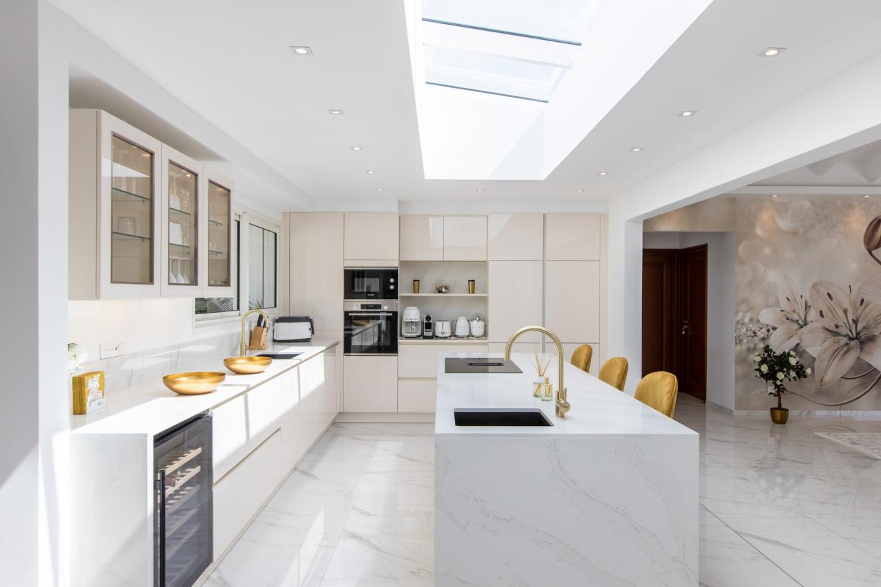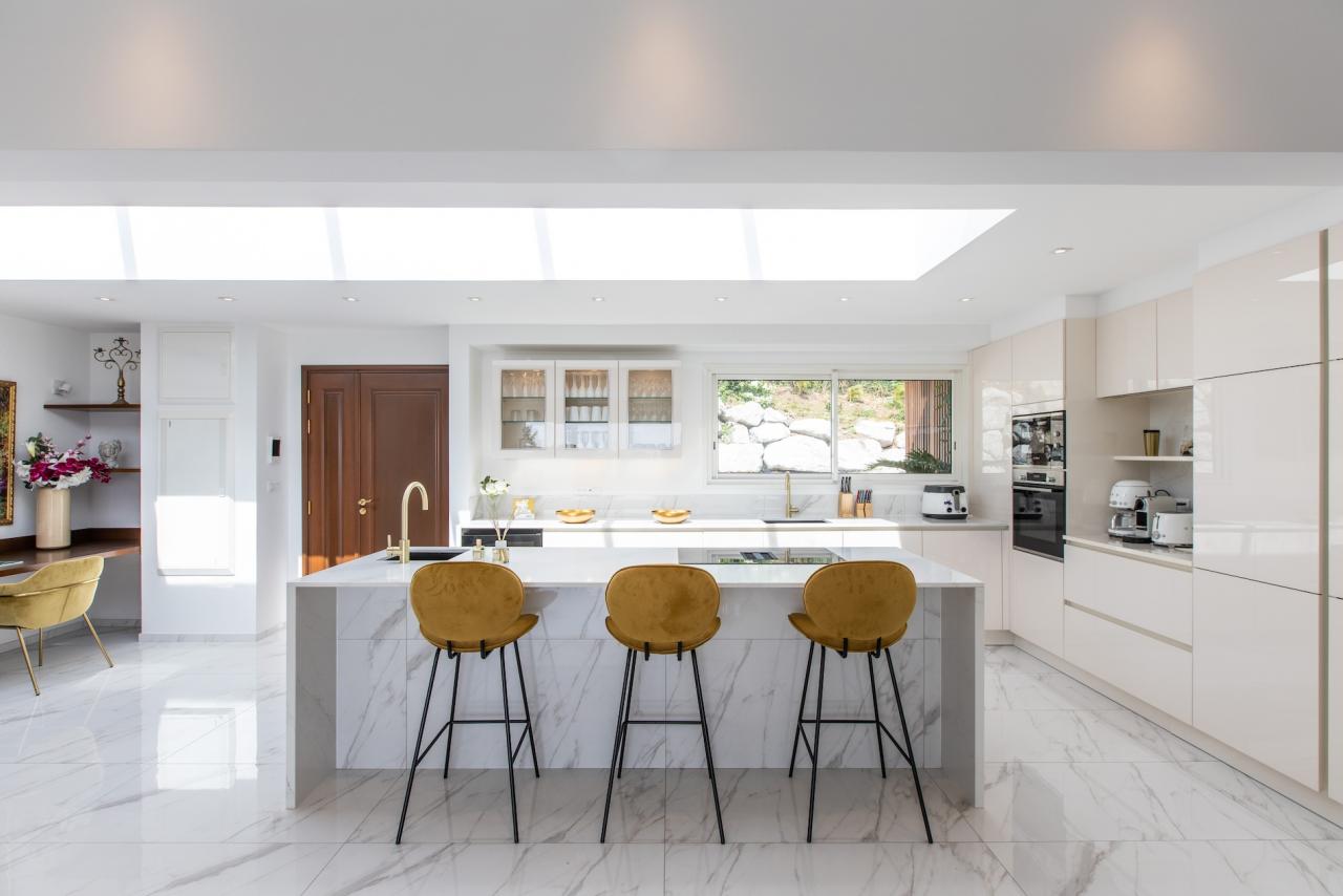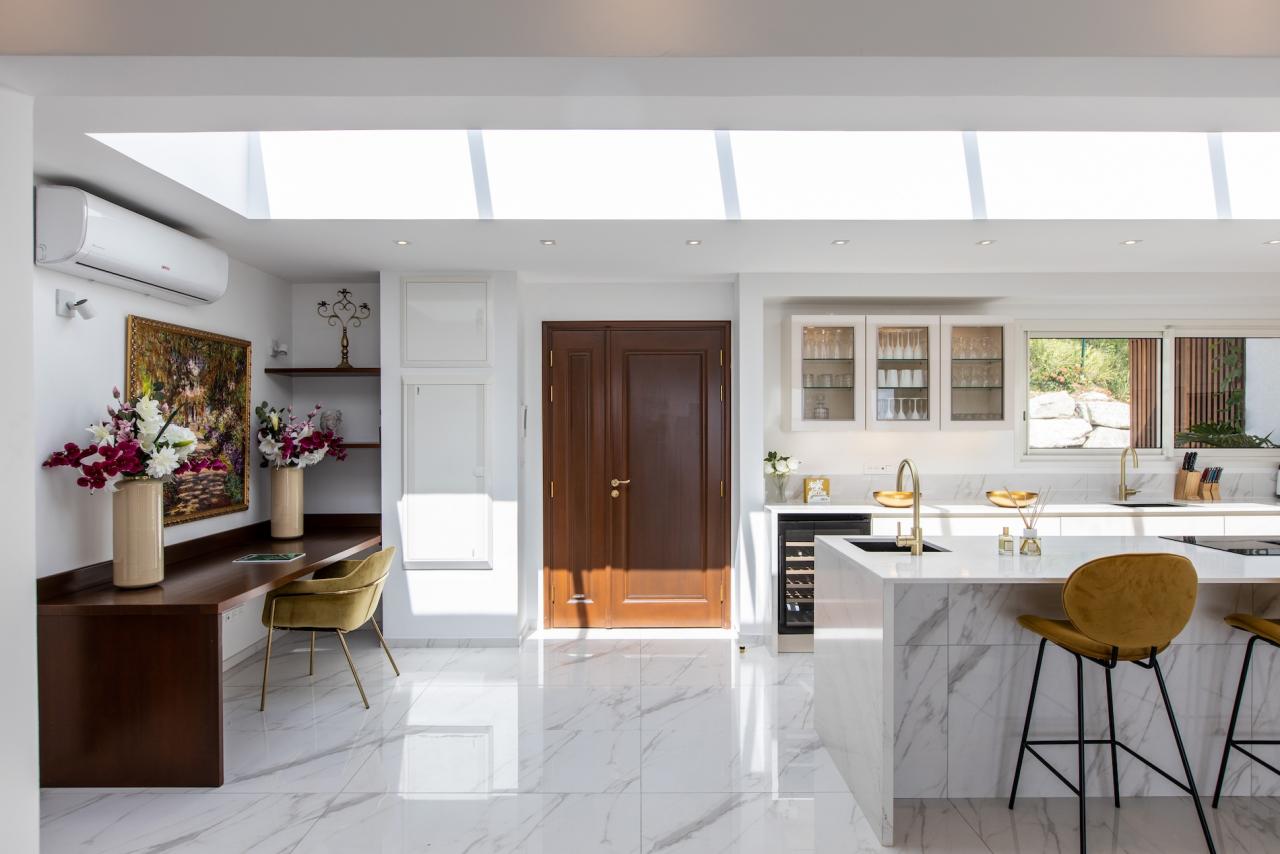 Villa Fleurs de Lys' interior harmoniously blends classic French luxury and contemporary elegance, adorned with modern art pieces that enhance its sophisticated ambiance. Luxurious fabrics, fine furnishings, and intricate detailing create an atmosphere of opulence and refinement.
