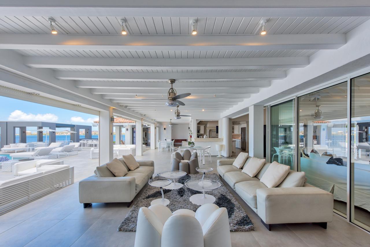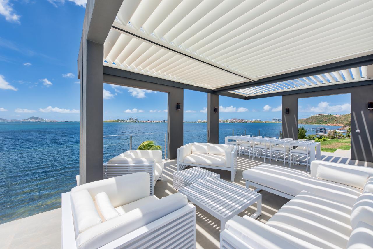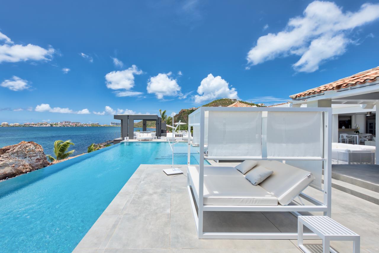 Villa Mirabelle is a gorgeous St. Martin rental located on Simpson Bay lagoon in Terres Basses. This modern St. Martin villa has five bedrooms, all with their own ensuite bathroom. The well equipped kitchen opens onto the terrace and has a view of the lagoon. The covered terrace is equipped with fans, and two aqua bikes are available.