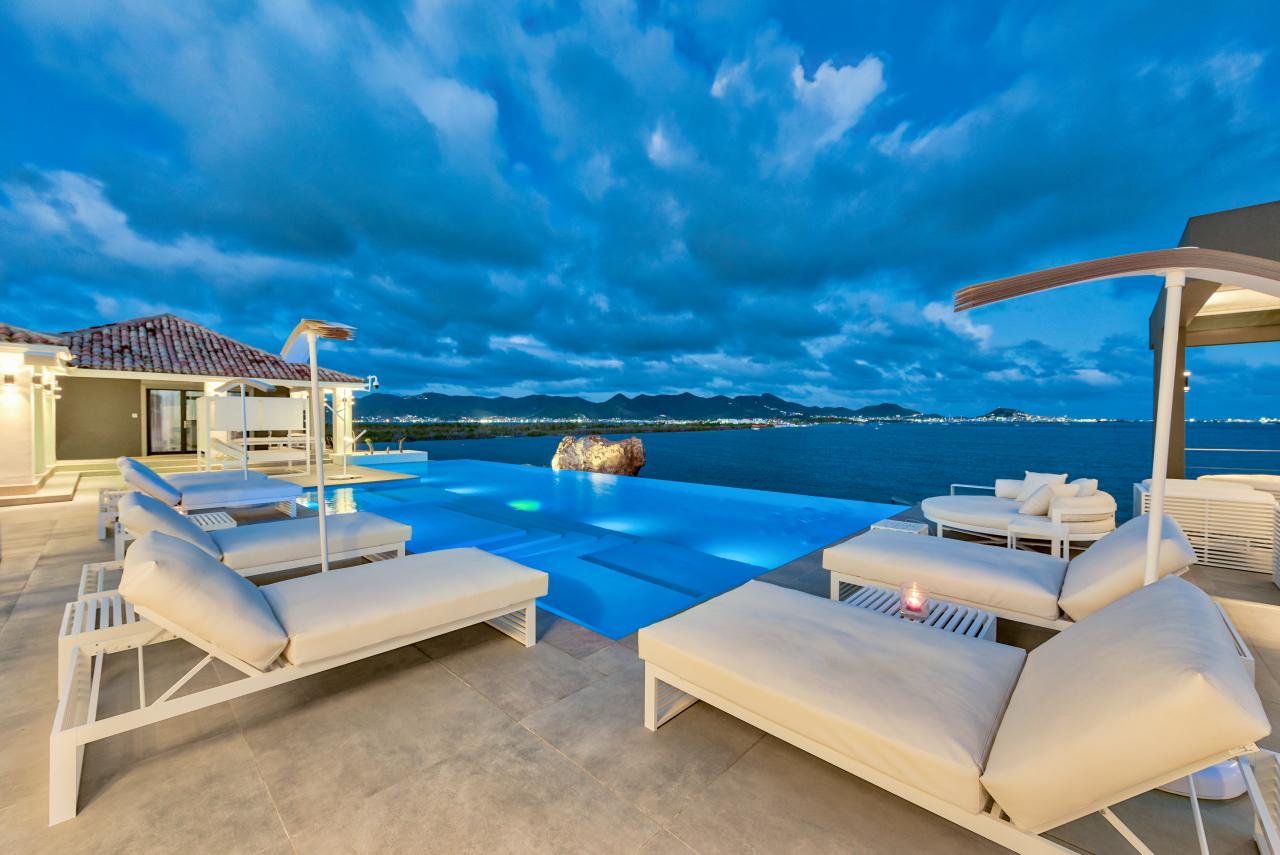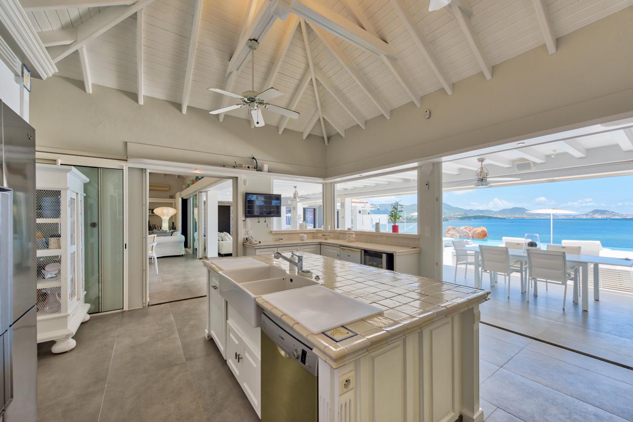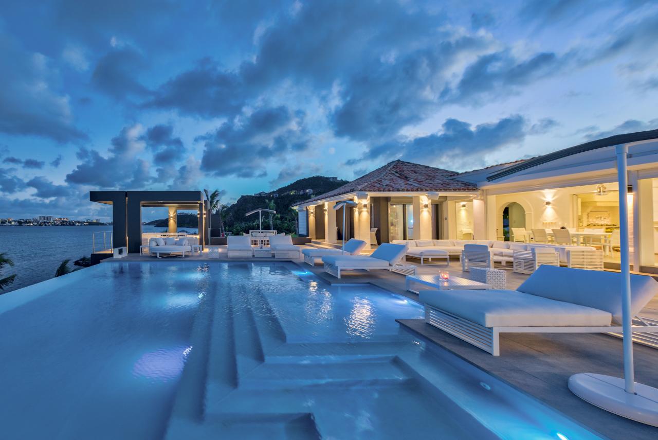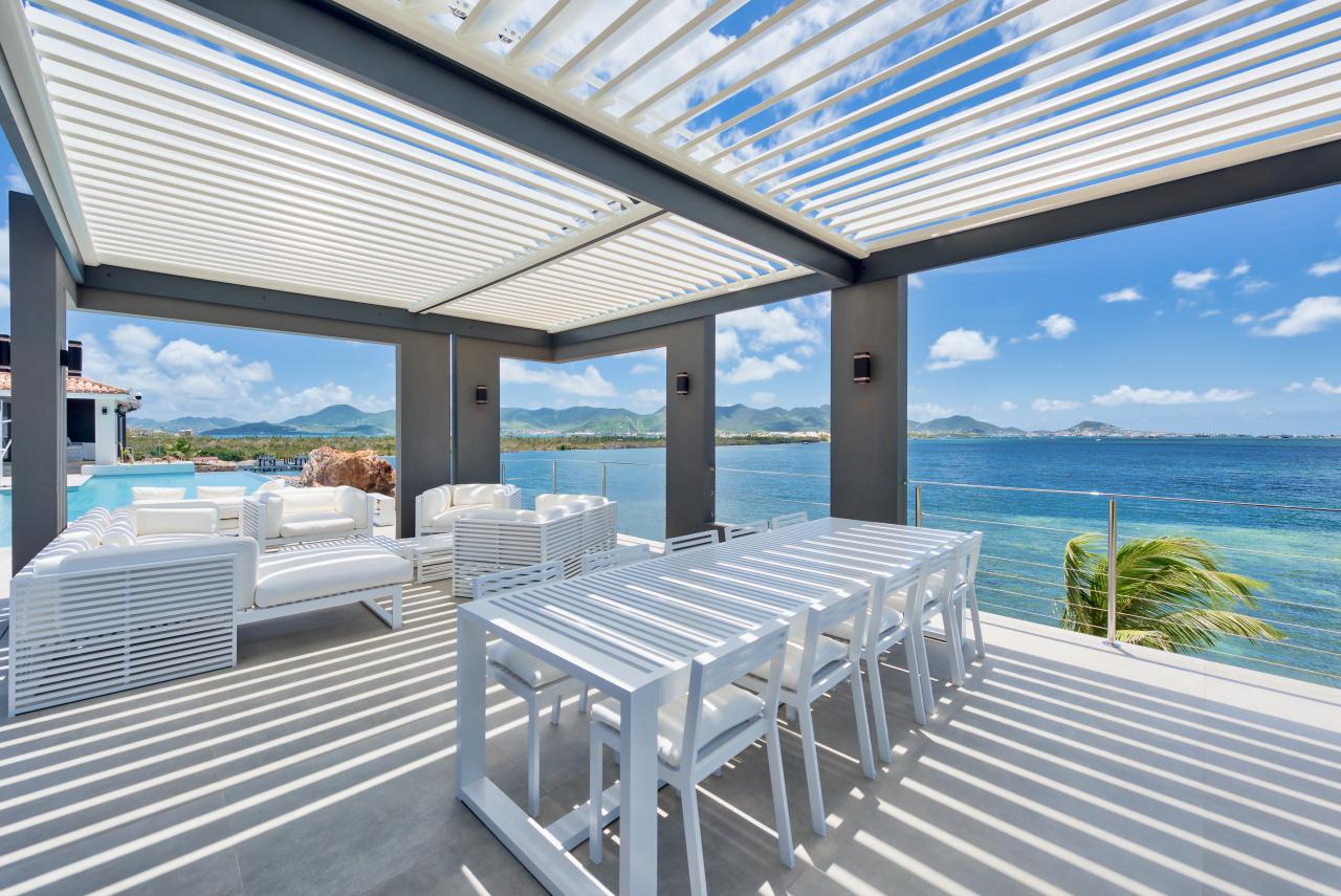 Villa Mirabelle is a gorgeous St. Martin rental located on Simpson Bay lagoon in Terres Basses. This modern St. Martin villa has five bedrooms, all with their own ensuite bathroom. The well equipped kitchen opens onto the terrace and has a view of the lagoon. The covered terrace is equipped with fans, and two aqua bikes are available.