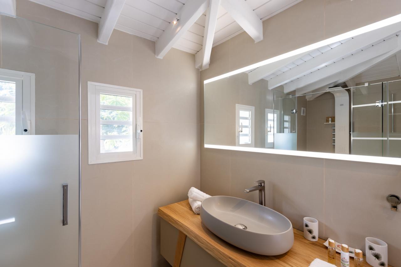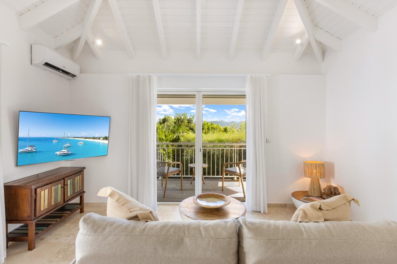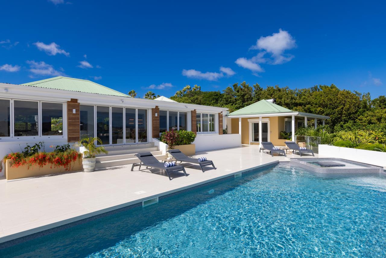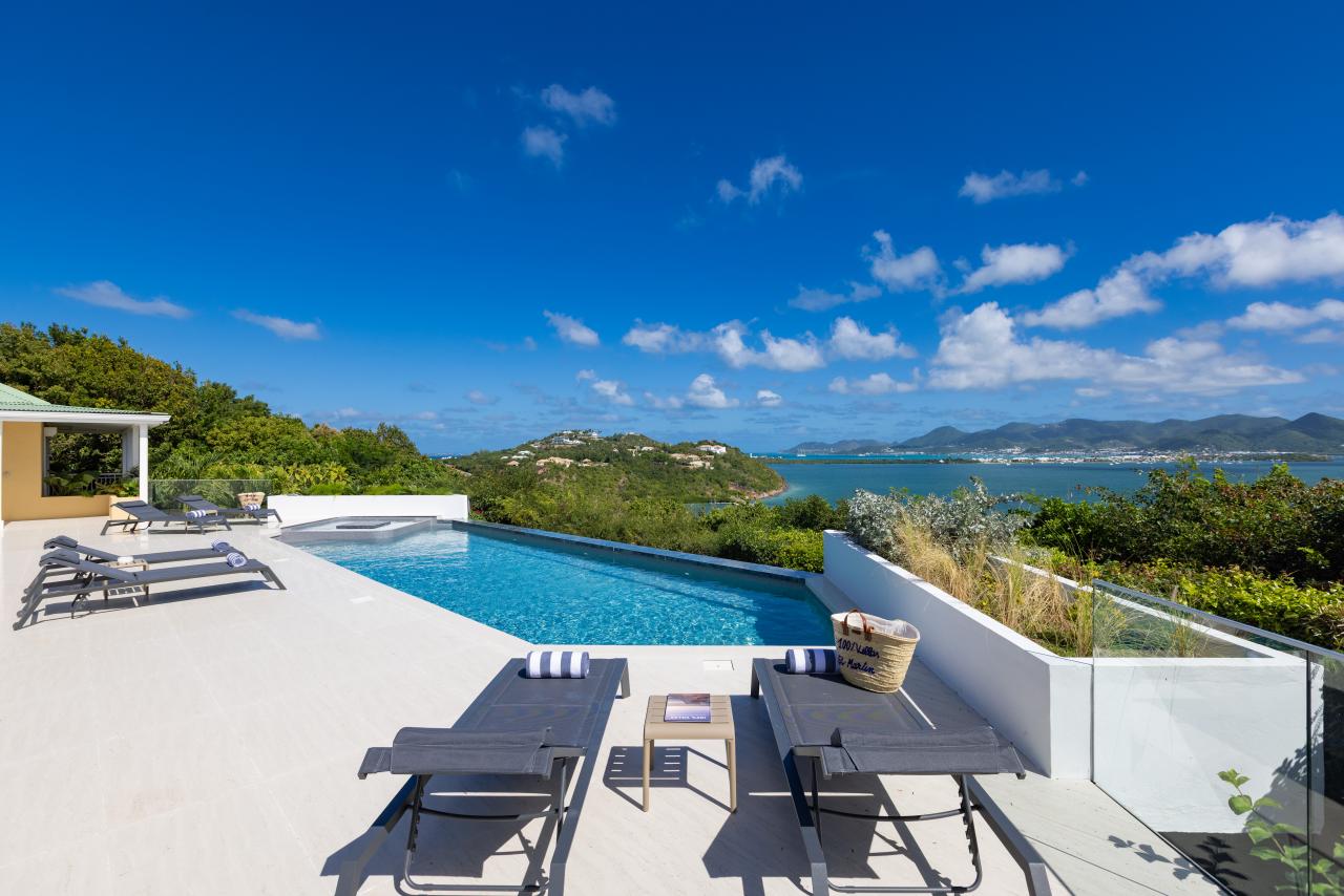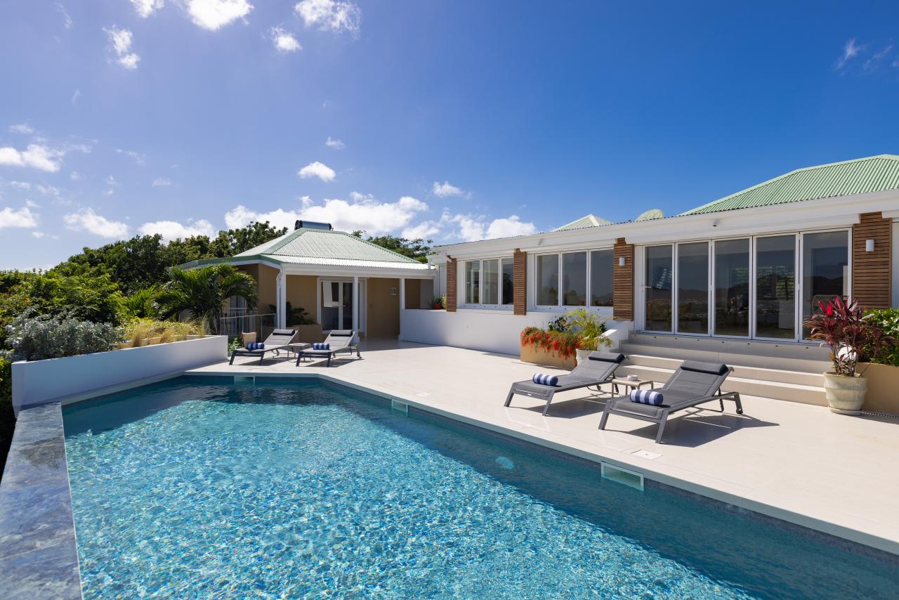 The villa's elegantly furnished terrace extends from the spacious indoor living areas, which create a seamless connection between comfort and nature. There is an outdoor swimming pool, with an inset mini pool and built-in table. It gives guests a place to relax under the Caribbean sun.