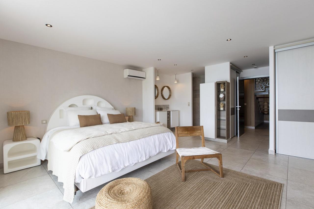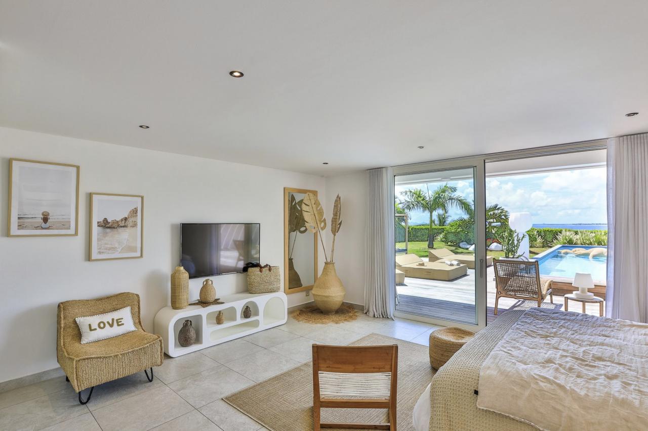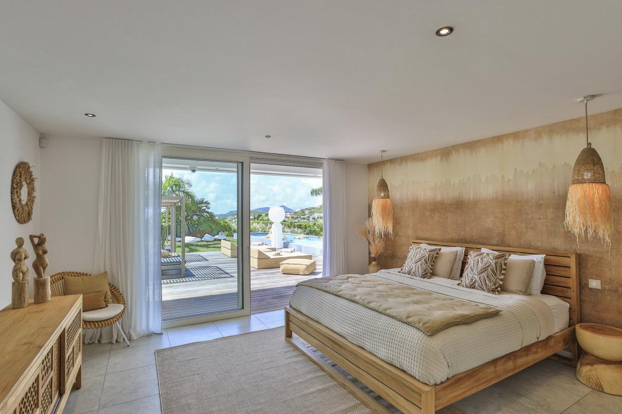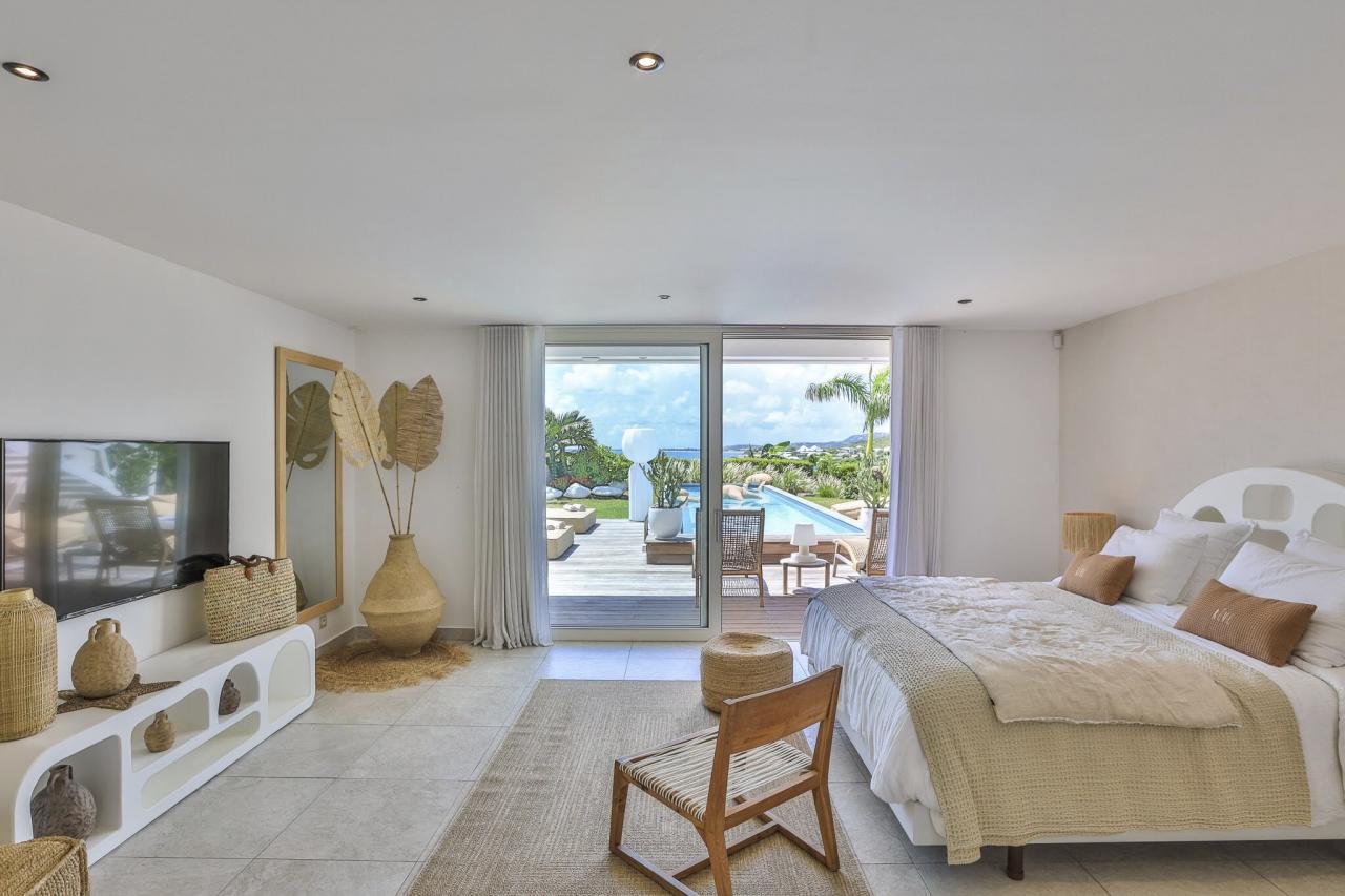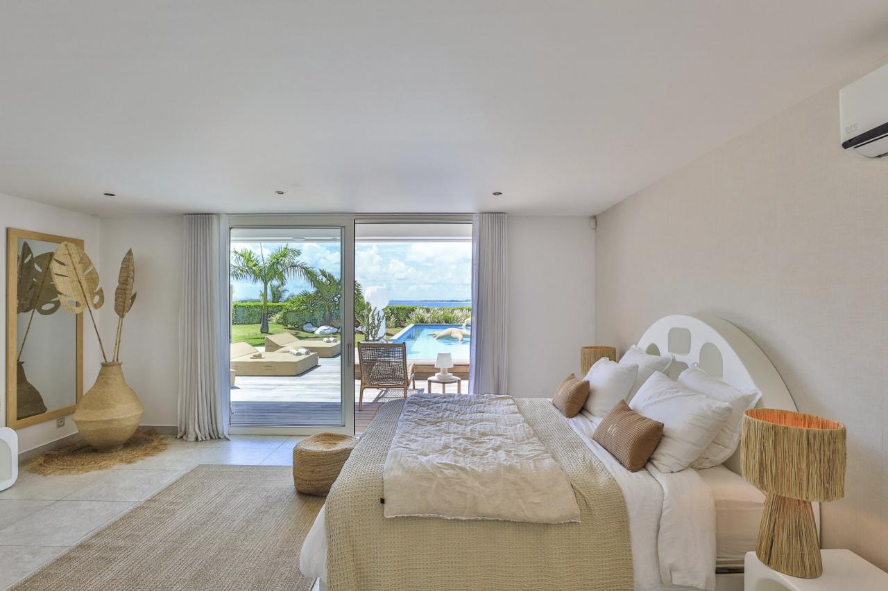 This St. Martin villa has two levels thoughtfully designed to ensure guests' relaxation and well-being. The main floor features an open and luminous living area with large bay windows that allow natural light to flood in and highlight the contemporary and sophisticated decor. The family areas, living and dining, are open to a spacious terrace, the perfect place to gather with loved ones. For optimal convenience, this floor also holds two bedrooms near the main living spaces. Each bedroom has high-quality materials and finishes and an ensuite bathroom. They have a great atmosphere that is serene and restful, cultivated by carefully selected decor to blend subtle pops of color and natural textures.