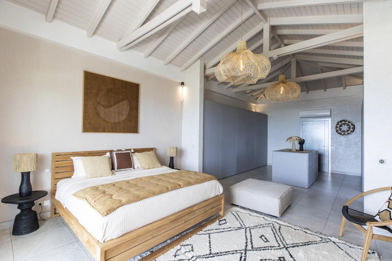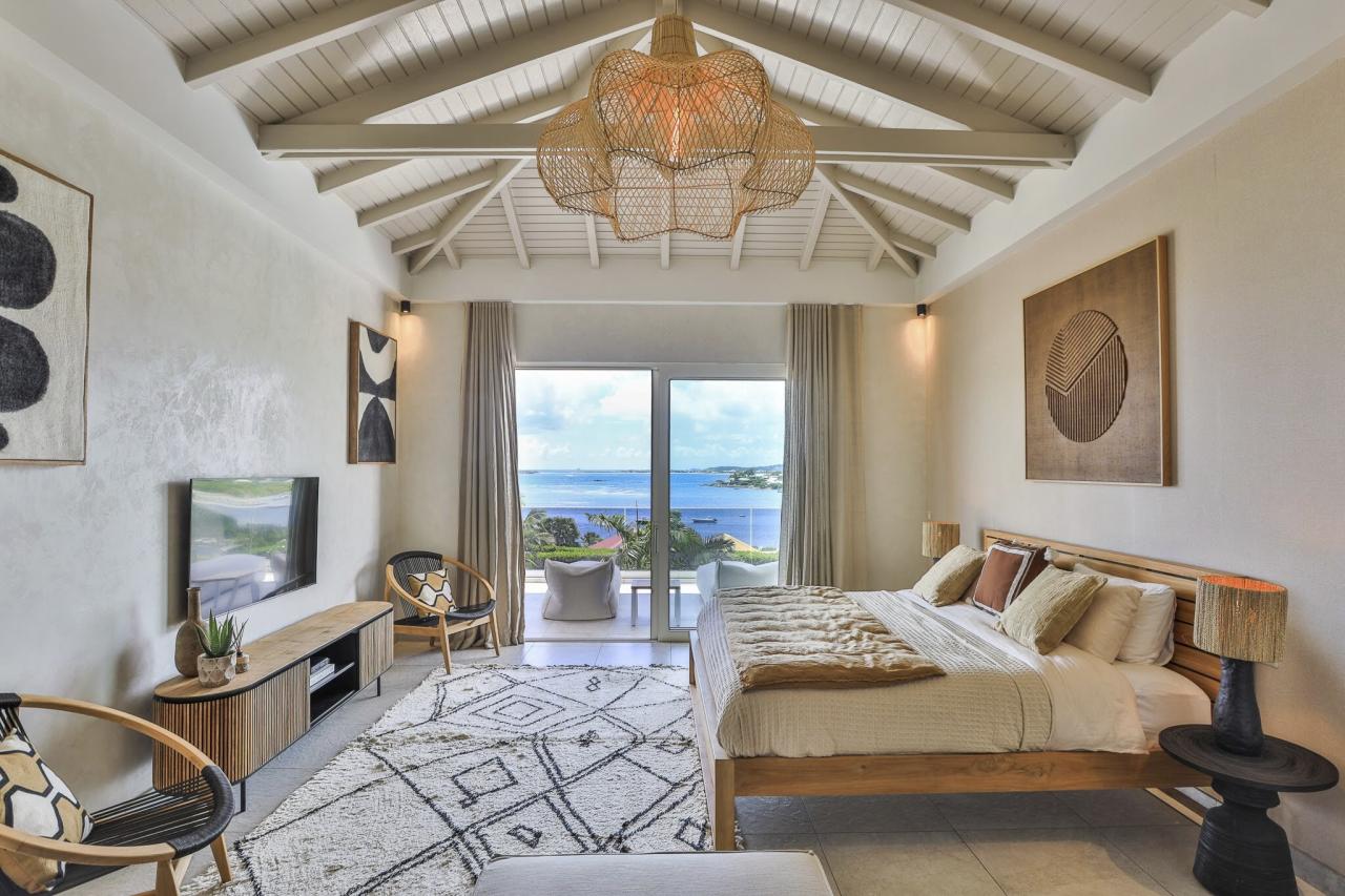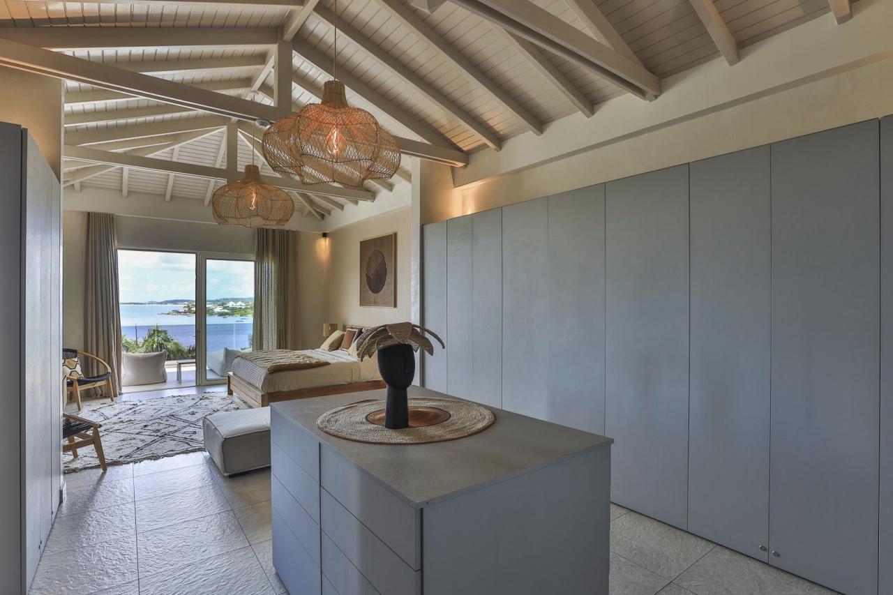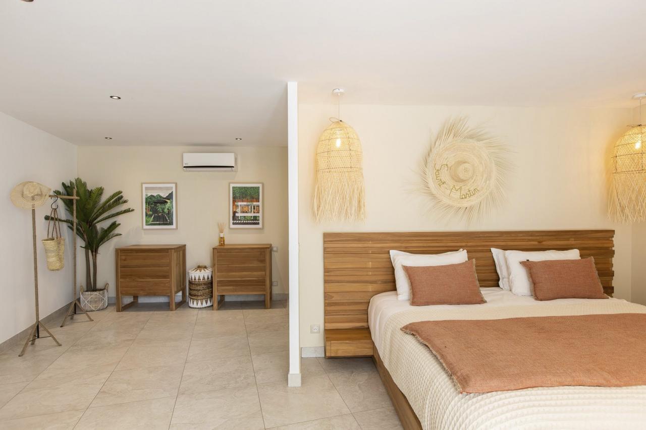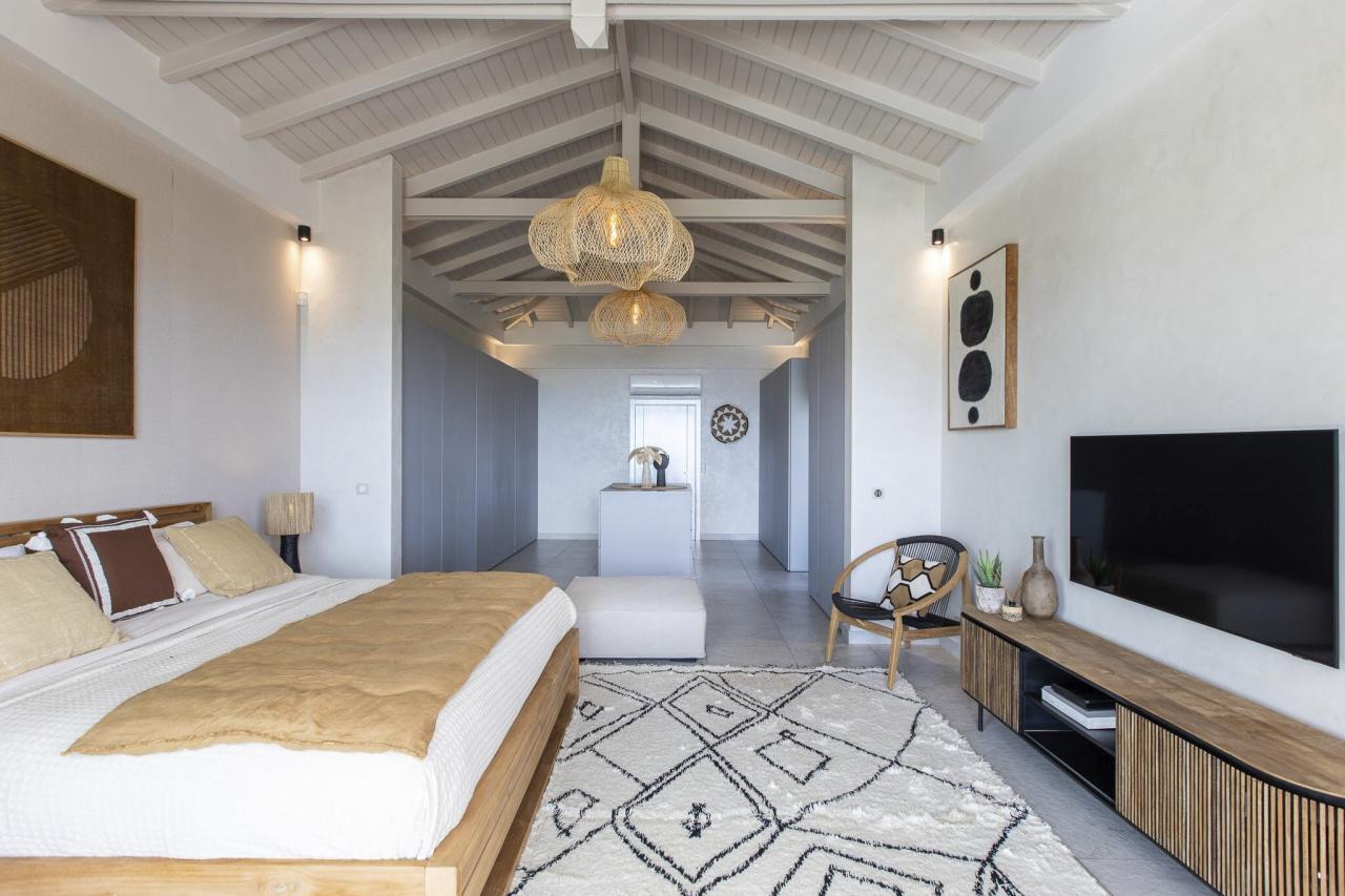 This St. Martin villa has two levels thoughtfully designed to ensure guests' relaxation and well-being. The main floor features an open and luminous living area with large bay windows that allow natural light to flood in and highlight the contemporary and sophisticated decor. The family areas, living and dining, are open to a spacious terrace, the perfect place to gather with loved ones. For optimal convenience, this floor also holds two bedrooms near the main living spaces. Each bedroom has high-quality materials and finishes and an ensuite bathroom. They have a great atmosphere that is serene and restful, cultivated by carefully selected decor to blend subtle pops of color and natural textures.