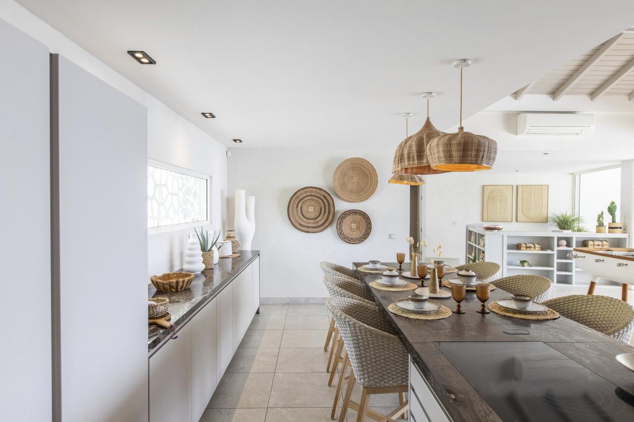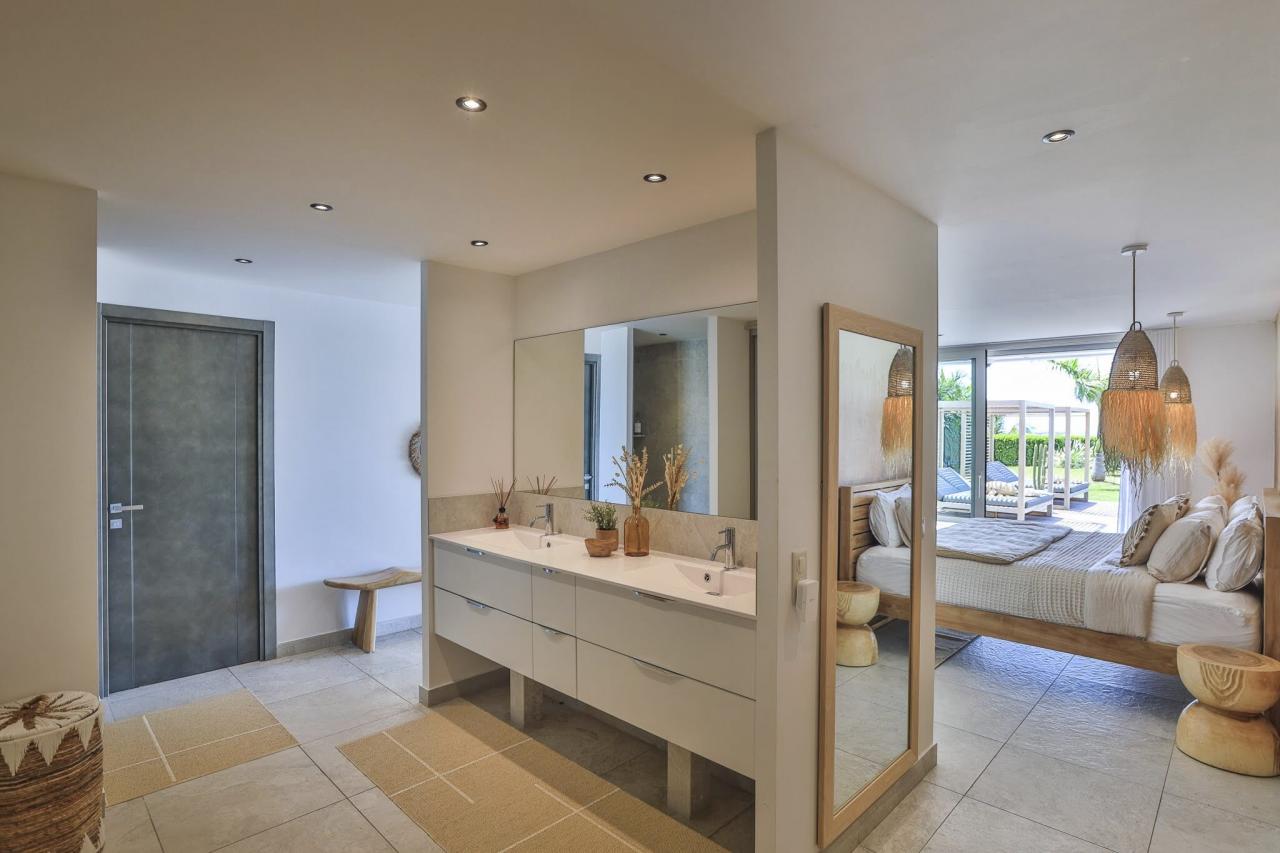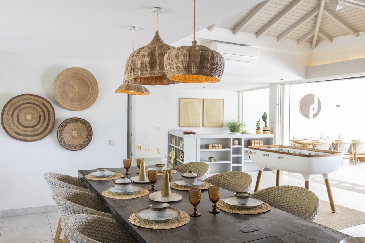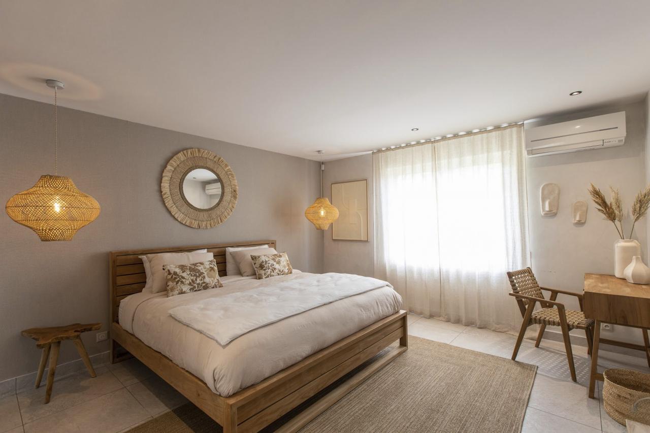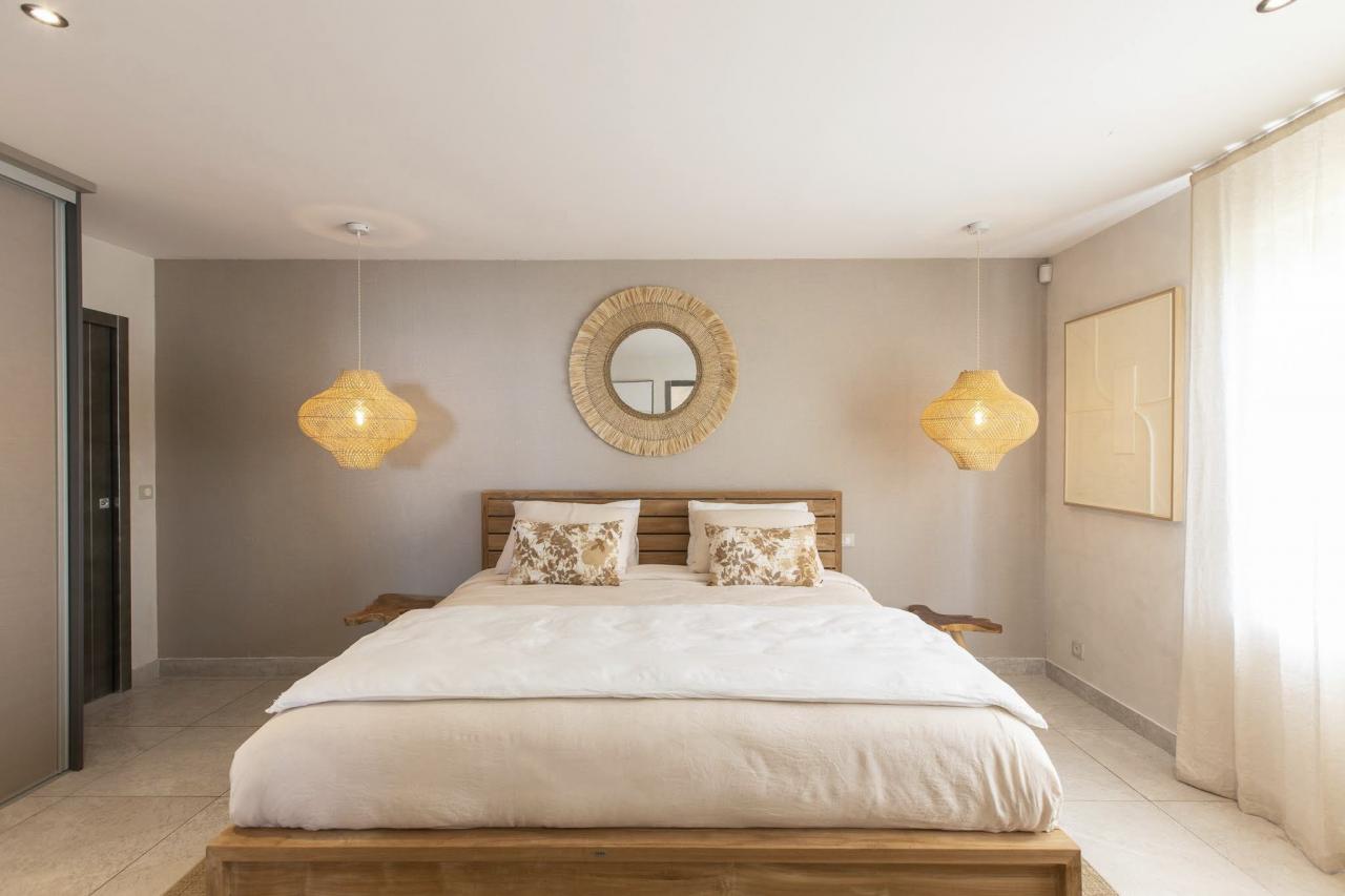 This St. Martin villa has two levels thoughtfully designed to ensure guests' relaxation and well-being. The main floor features an open and luminous living area with large bay windows that allow natural light to flood in and highlight the contemporary and sophisticated decor. The family areas, living and dining, are open to a spacious terrace, the perfect place to gather with loved ones. For optimal convenience, this floor also holds two bedrooms near the main living spaces. Each bedroom has high-quality materials and finishes and an ensuite bathroom. They have a great atmosphere that is serene and restful, cultivated by carefully selected decor to blend subtle pops of color and natural textures.