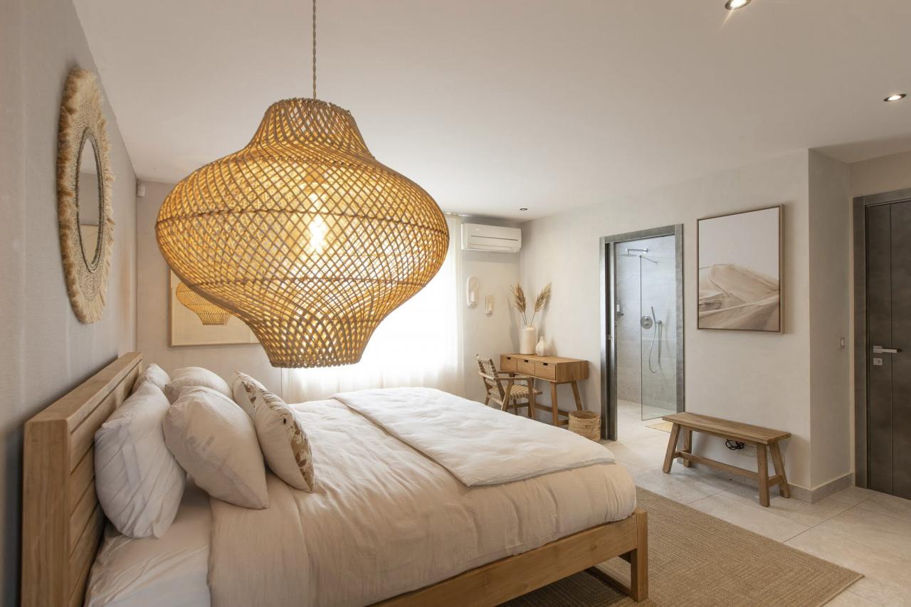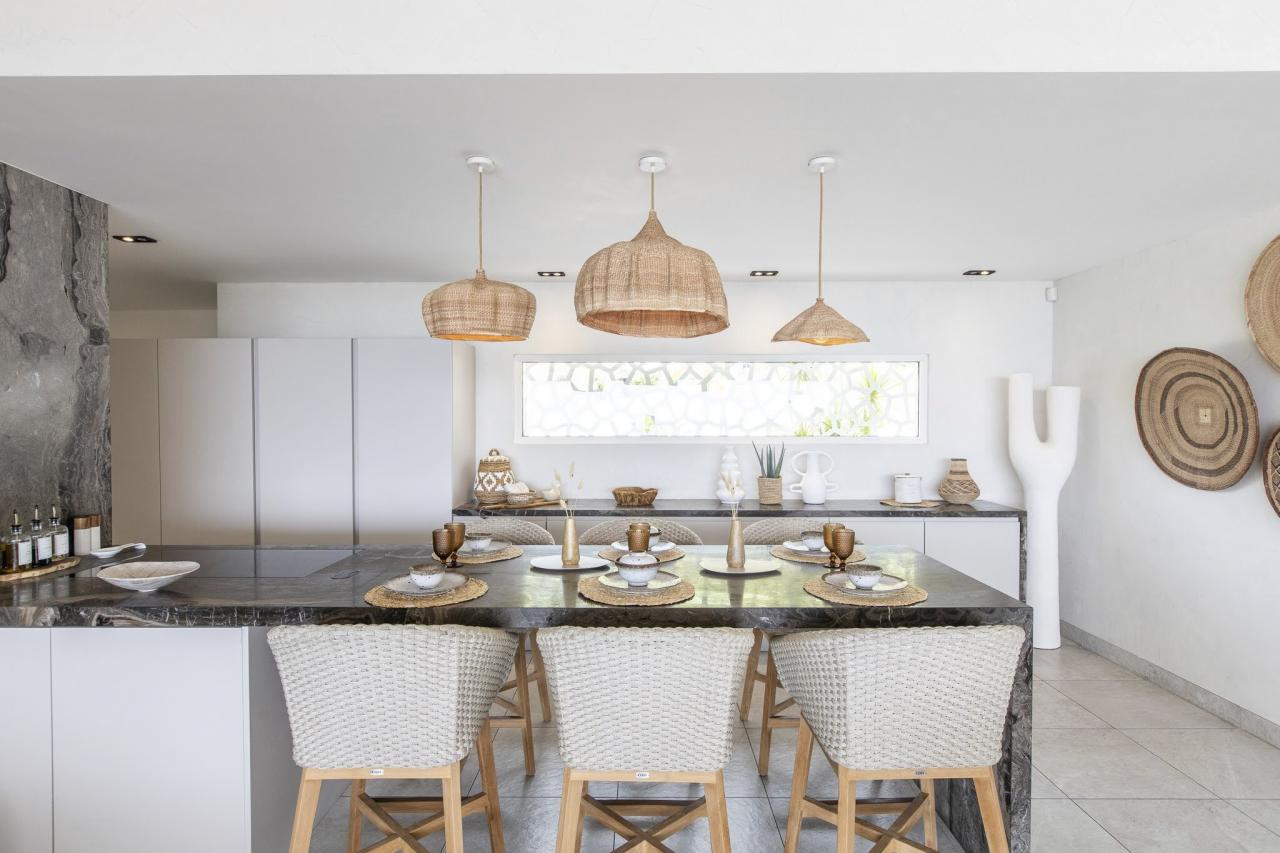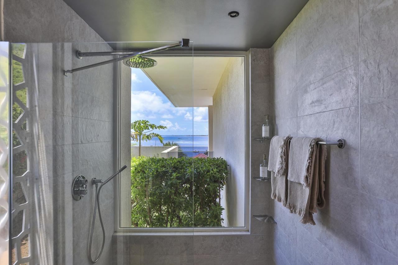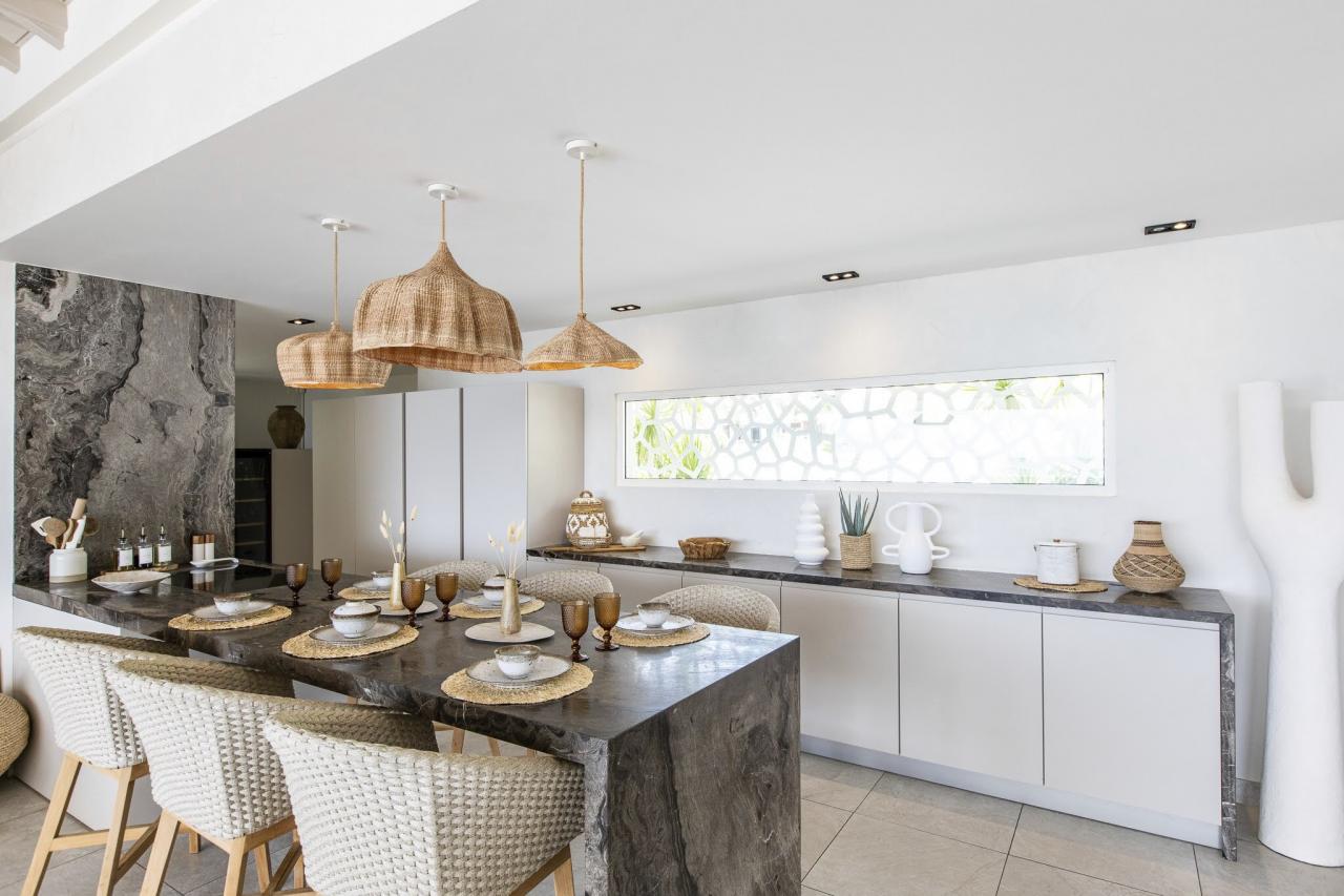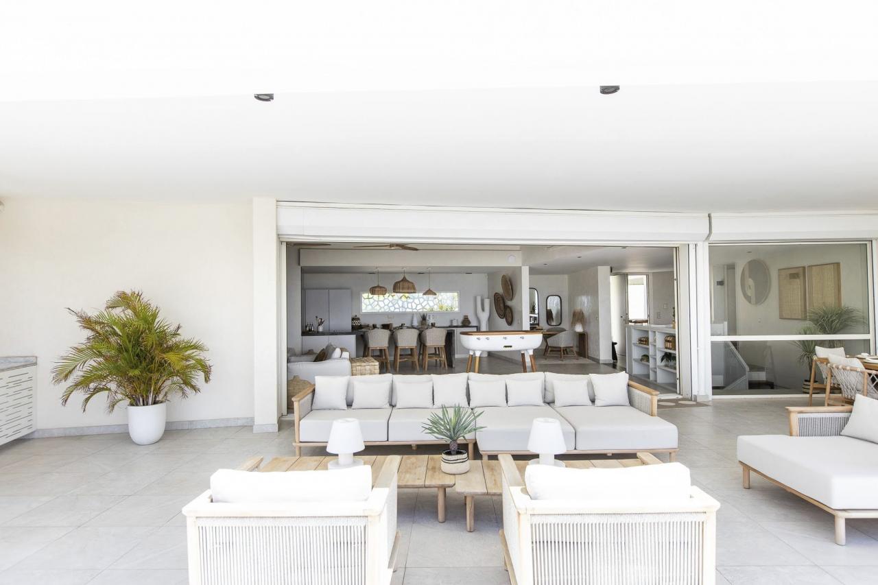 This St. Martin villa has two levels thoughtfully designed to ensure guests' relaxation and well-being. The main floor features an open and luminous living area with large bay windows that allow natural light to flood in and highlight the contemporary and sophisticated decor. The family areas, living and dining, are open to a spacious terrace, the perfect place to gather with loved ones. For optimal convenience, this floor also holds two bedrooms near the main living spaces. Each bedroom has high-quality materials and finishes and an ensuite bathroom. They have a great atmosphere that is serene and restful, cultivated by carefully selected decor to blend subtle pops of color and natural textures.
