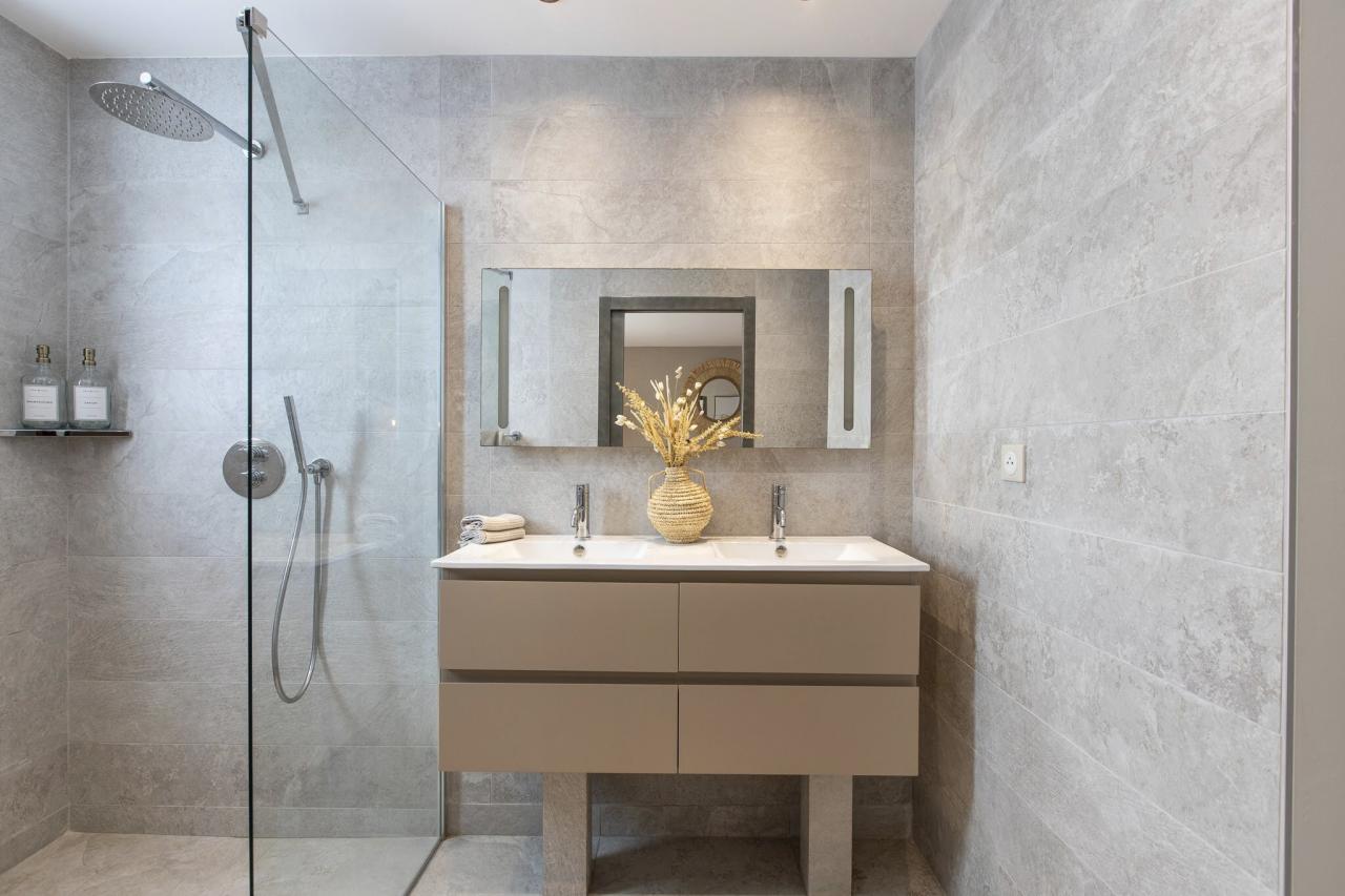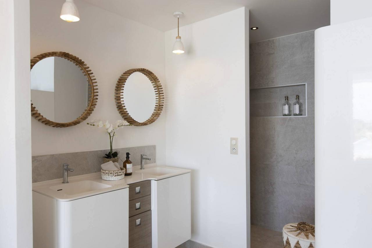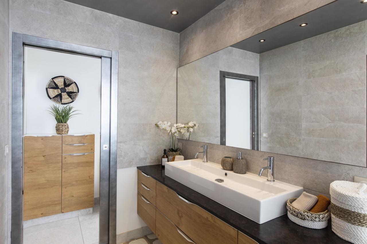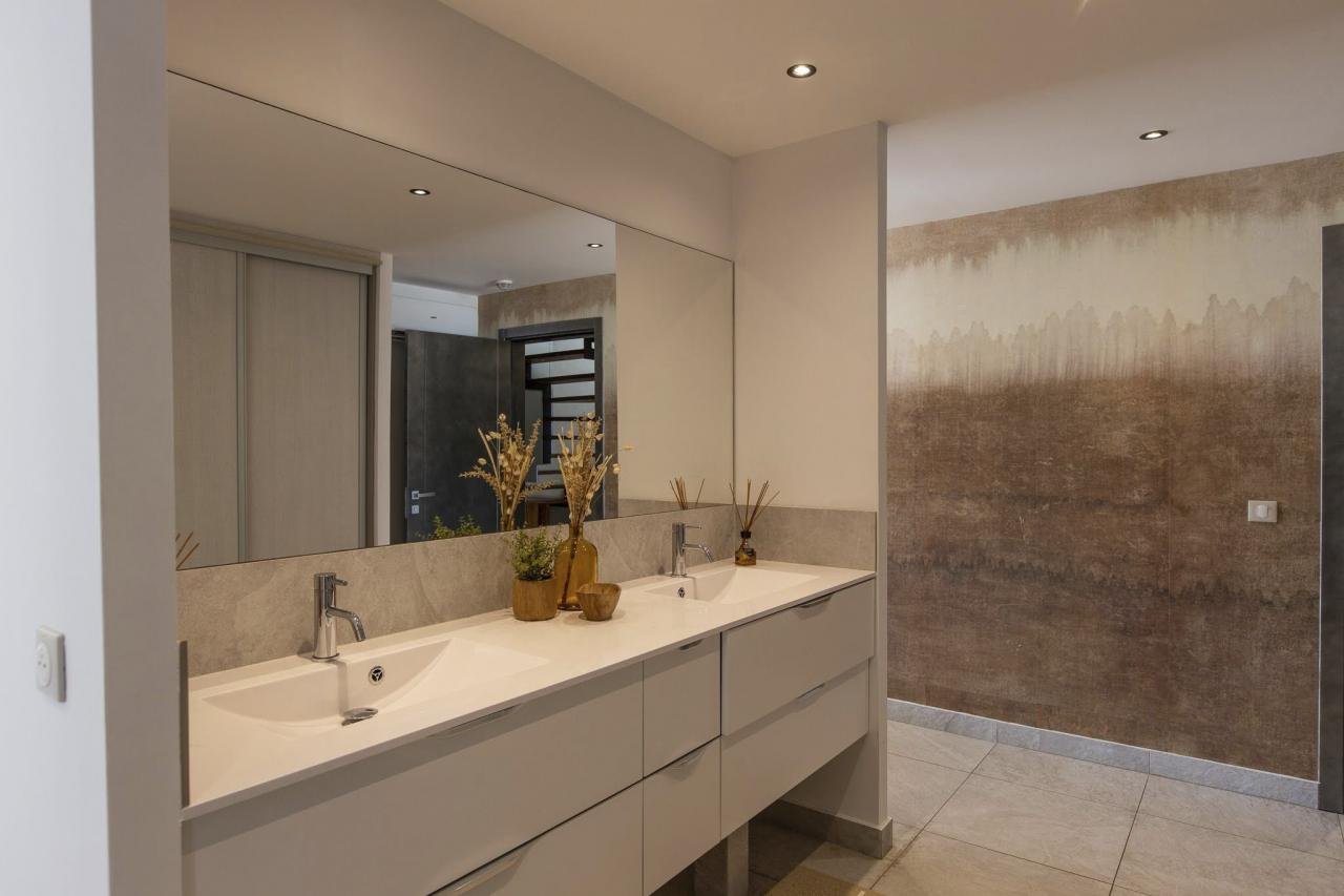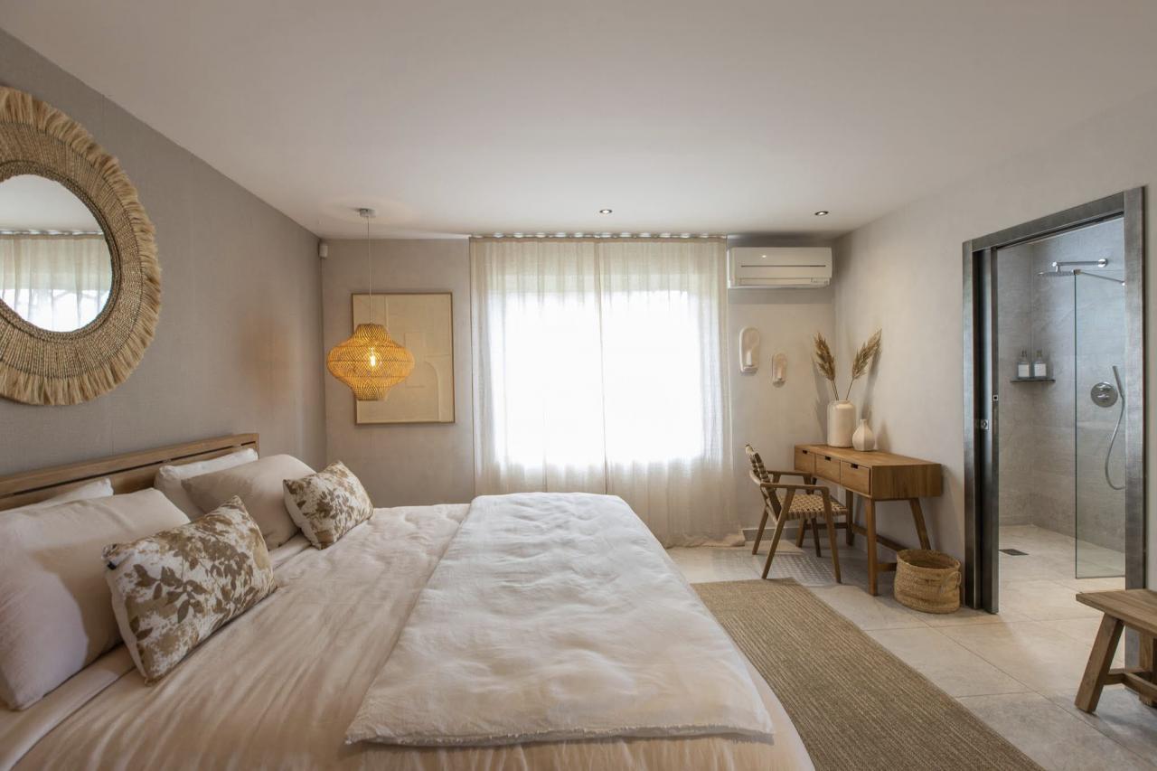 This St. Martin villa has two levels thoughtfully designed to ensure guests' relaxation and well-being. The main floor features an open and luminous living area with large bay windows that allow natural light to flood in and highlight the contemporary and sophisticated decor. The family areas, living and dining, are open to a spacious terrace, the perfect place to gather with loved ones. For optimal convenience, this floor also holds two bedrooms near the main living spaces. Each bedroom has high-quality materials and finishes and an ensuite bathroom. They have a great atmosphere that is serene and restful, cultivated by carefully selected decor to blend subtle pops of color and natural textures.